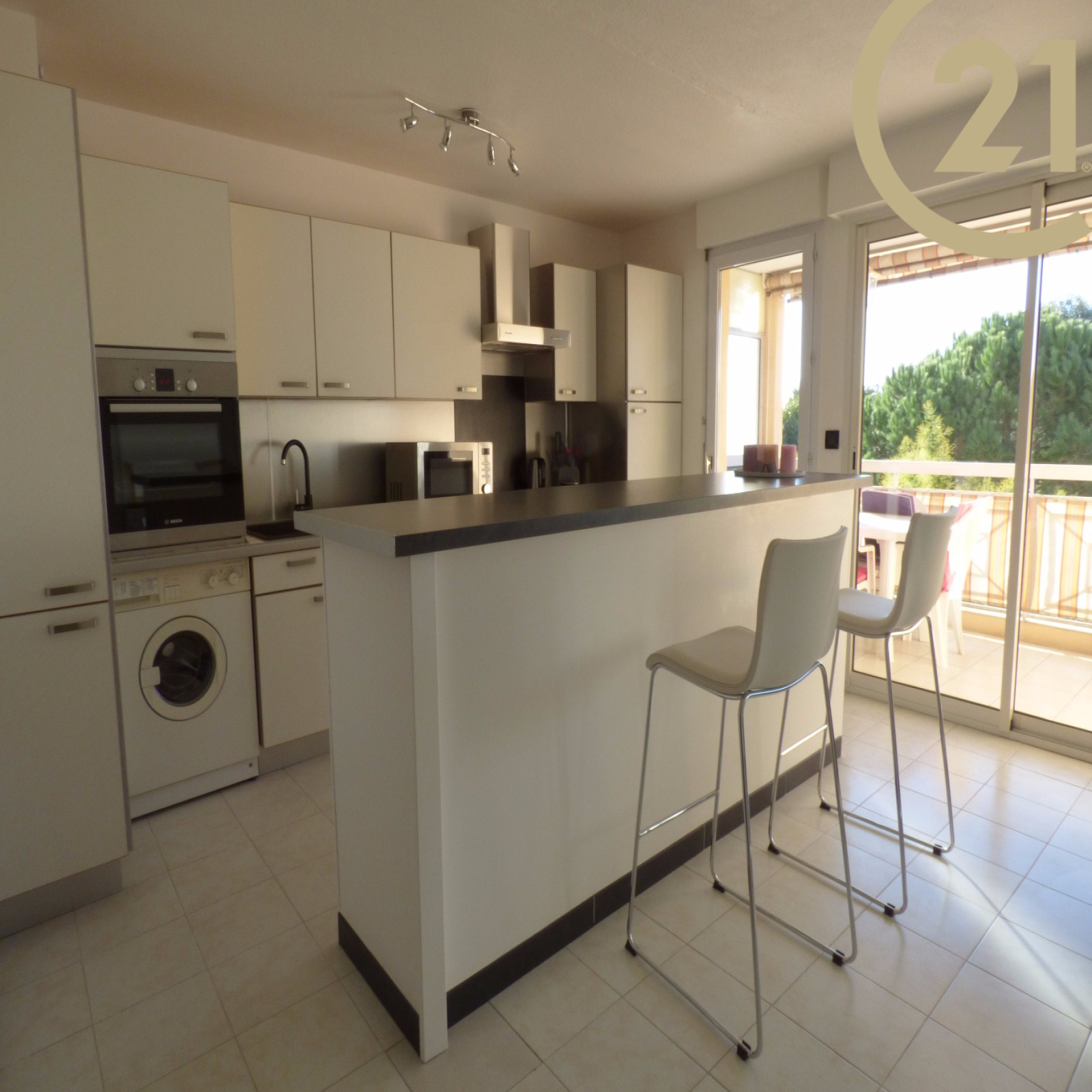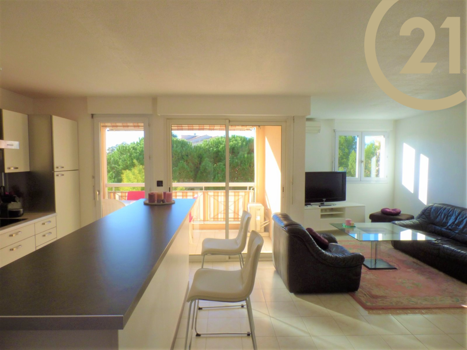 FREJUS, dans une résidence de standing (Construction Roxim) récente, sécurisée et ravalée récemment, appartement 4 pièces en étage élevé. Il se compose d'une entrée donnant sur un spacieux séjour avec cuisine US équipée de 31 m2, de 3 chambres, d'une salle de bains, d'un dressing et d'un wc. Belle terrasse exposition Sud/Ouest avec vue sur les jardins. Terrasse et Balcon. Garage au rez-de-chaussée.