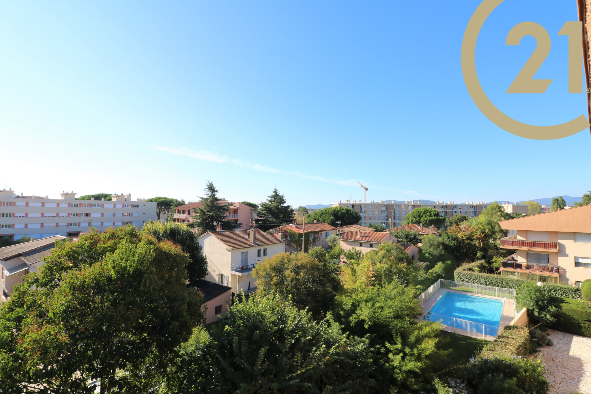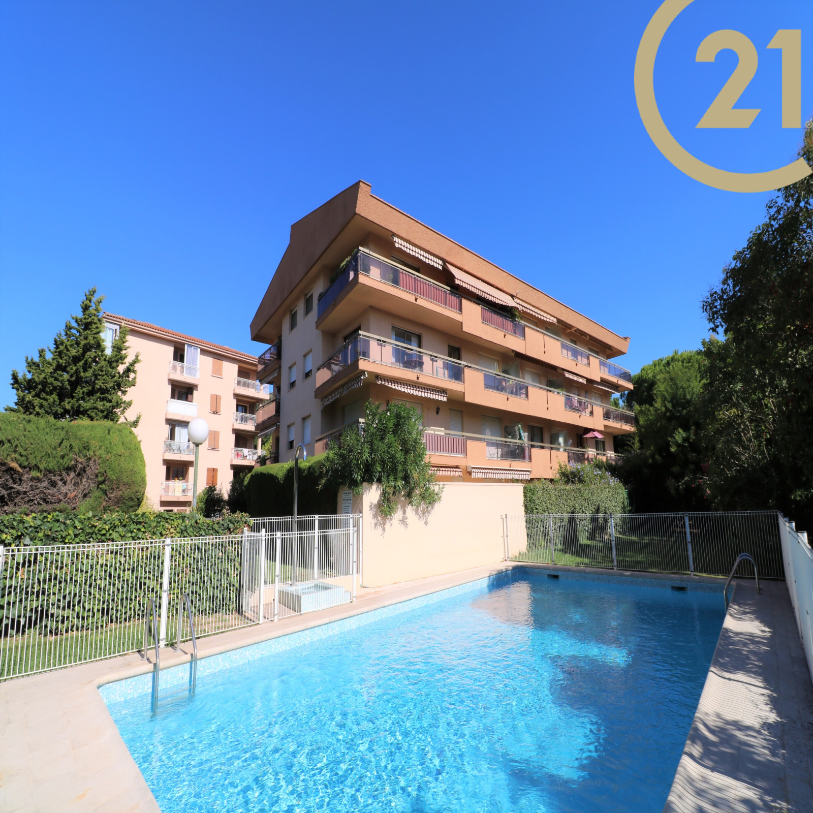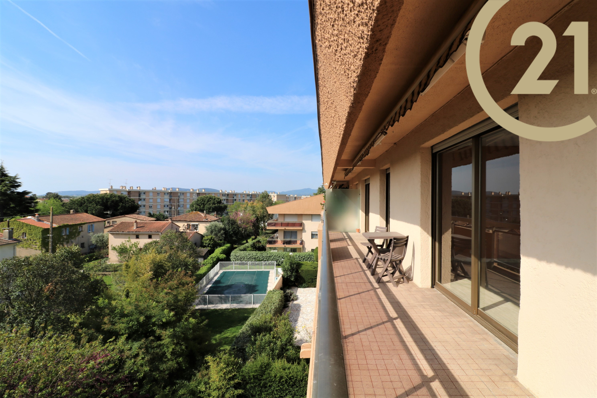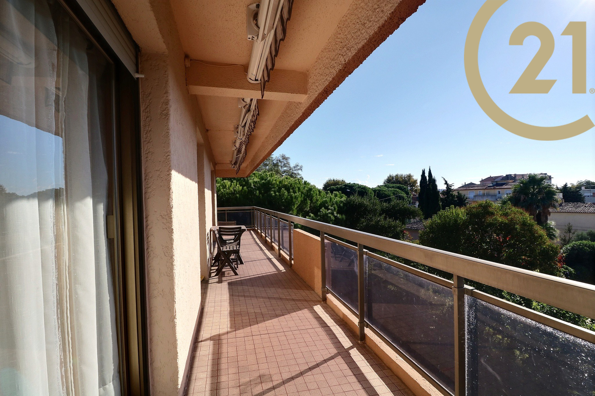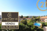 EXCLUSIVITE - FREJUS PROCHE MER ET COMMERCES - Spacieux et lumineux 3 pièces situé au dernier étage d'une résidence sécurisée avec ascenseur et piscine à proximité du centre-ville, des commerces et de la mer. Cet appartement bien exposé se compose d'une entrée, d'un cellier, d'un lumineux séjour exposé Sud/Est, d'une cuisine séparée, de deux chambres avec rangements, d'une salle de bains et de WC séparés. Les pièces principales donnent sur une vaste terrasse de plus de 20 m² orientée Sud et offrant une belle vue dégagée sur la verdure. Absence de vis-à-vis. Grande cave et possibilité de stationnement à proximité immédiate. Ravalement de facade réalisé récemment. Copropriété de 126 lots. Charges annuelles : 1809 €.