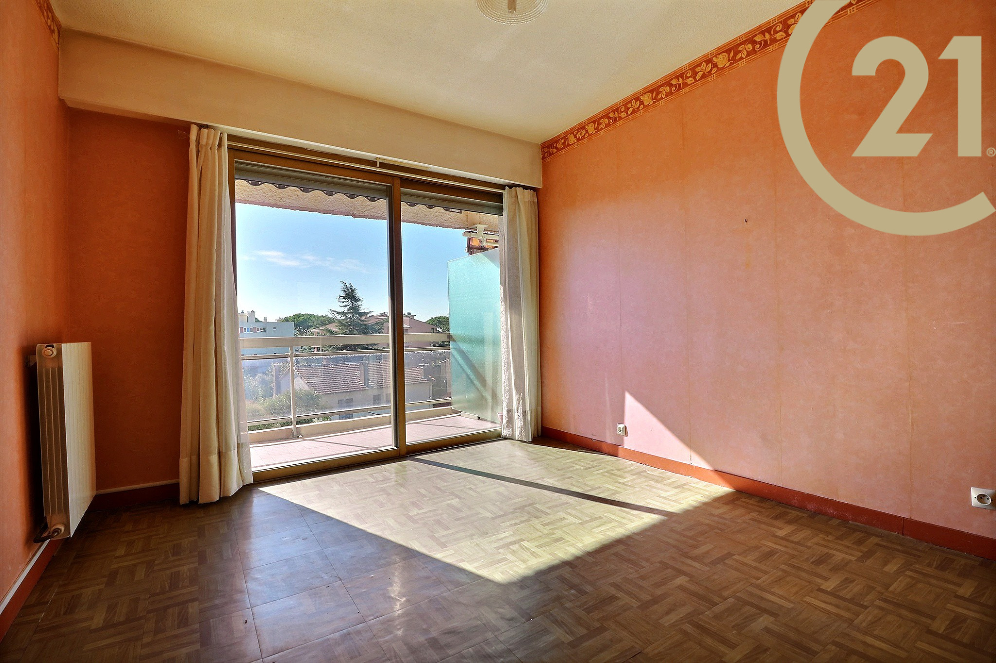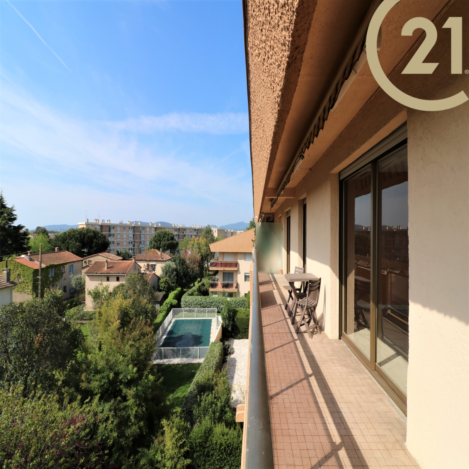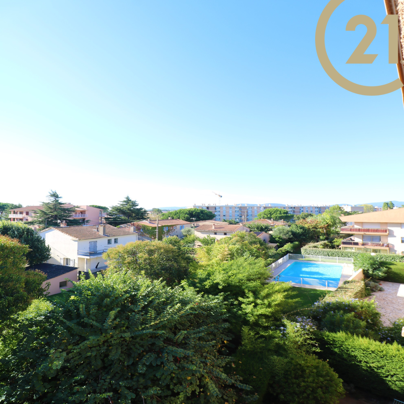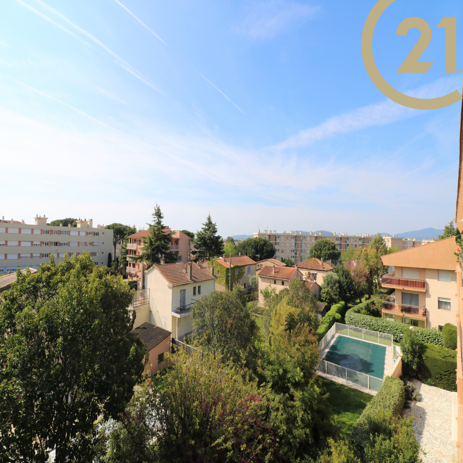EXCLUSIVITE - FREJUS PROCHE MER ET COMMERCES - Spacieux et lumineux 3 pièces situé au dernier étage d'une résidence sécurisée avec ascenseur et piscine à proximité du centre-ville, des commerces et de la mer. Cet appartement bien exposé se compose d'une entrée, d'un cellier, d'un lumineux séjour exposé Sud/Est, d'une cuisine séparée, de deux chambres avec rangements, d'une salle de bains et de WC séparés. Les pièces principales donnent sur une vaste terrasse de plus de 20 m² orientée Sud et offrant une belle vue dégagée sur la verdure. Absence de vis-à-vis. Grande cave et possibilité de stationnement à proximité immédiate. Ravalement de facade réalisé récemment. Copropriété de 126 lots. Charges annuelles : 1809 €.