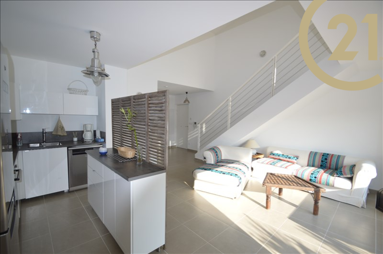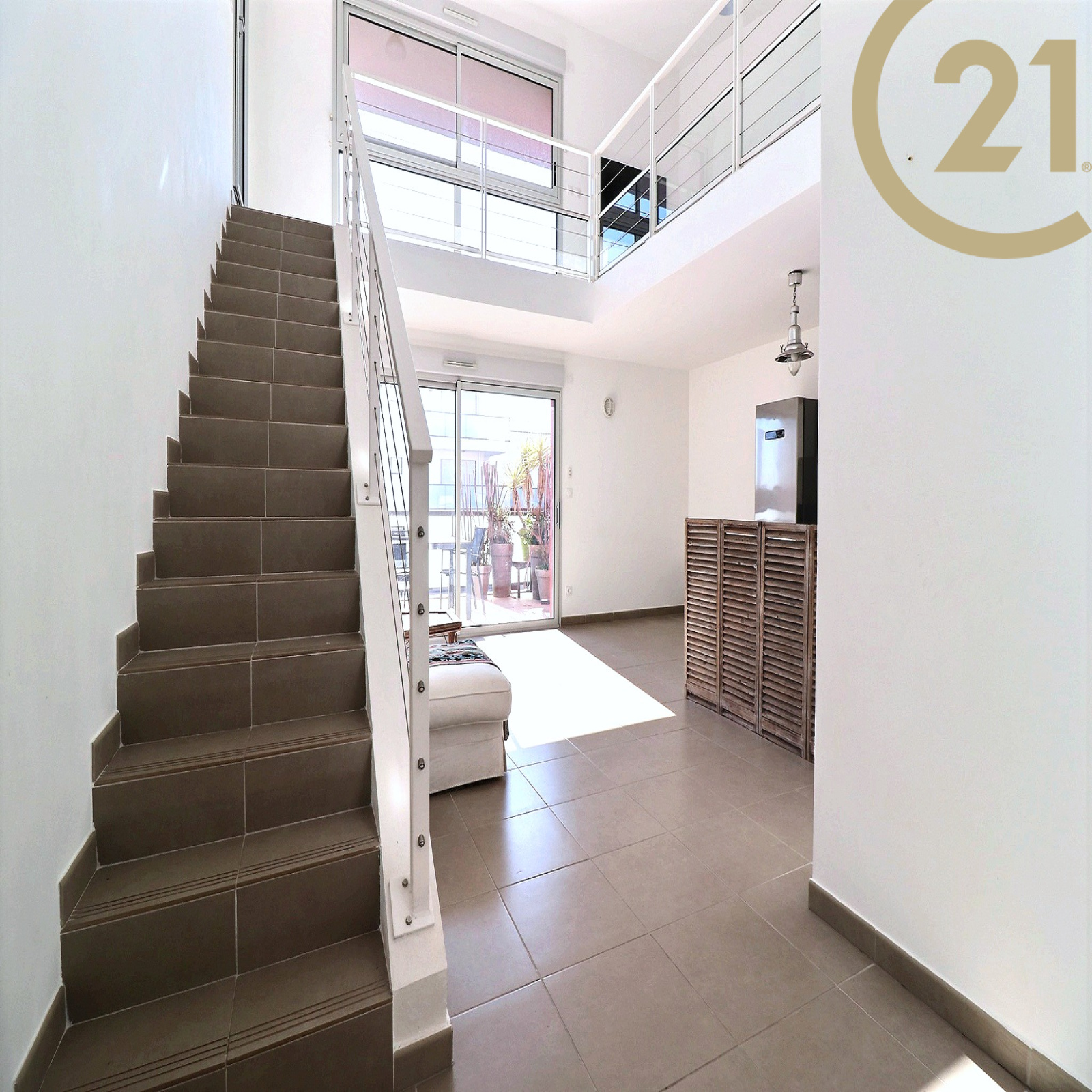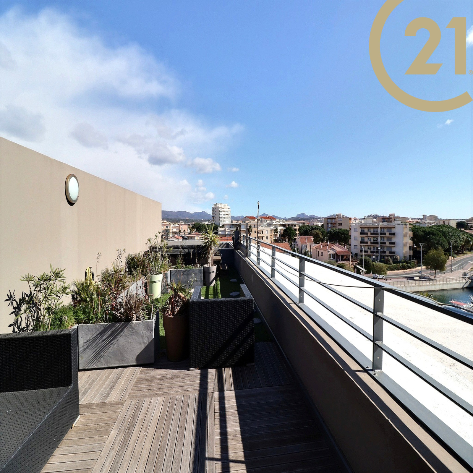 EXCLUSIVITE PORT-FREJUS II - Superbe appartement 3/4 pièces situé dans une résidence de standing récente implantée dans le quartier prisé et récent de Port-Fréjus II. Cet appartement en dernier étage offre un hall d'entrée avec placard, une pièce de vie avec belle hauteur sous plafond et cuisine moderne entièrement équipée, une terrasse exposée plein Sud, un coin nuit indépendant composé de deux belles chambres avec placards, d'une salle de bain avec douche, baignoire et WC. L'étage offre une grande mezzanine avec cellier (possibilité de transformation en chambre avec point d'eau) et une magnifique terrasse aménagée de 35 m² dotée d'un espace détente et d'un jacuzzi. Cette terrasse bénéficie d'un bel ensoleillement et d'une superbe vue dégagée sur le canal de Port-Fréjus II et le massif de l'Estérel. Un grand garage et une cave complètent ce bien. Vous apprécierez le calme à proximité immédiate du port, des plages et du centre-ville. Charges annuelles : 1752 €.