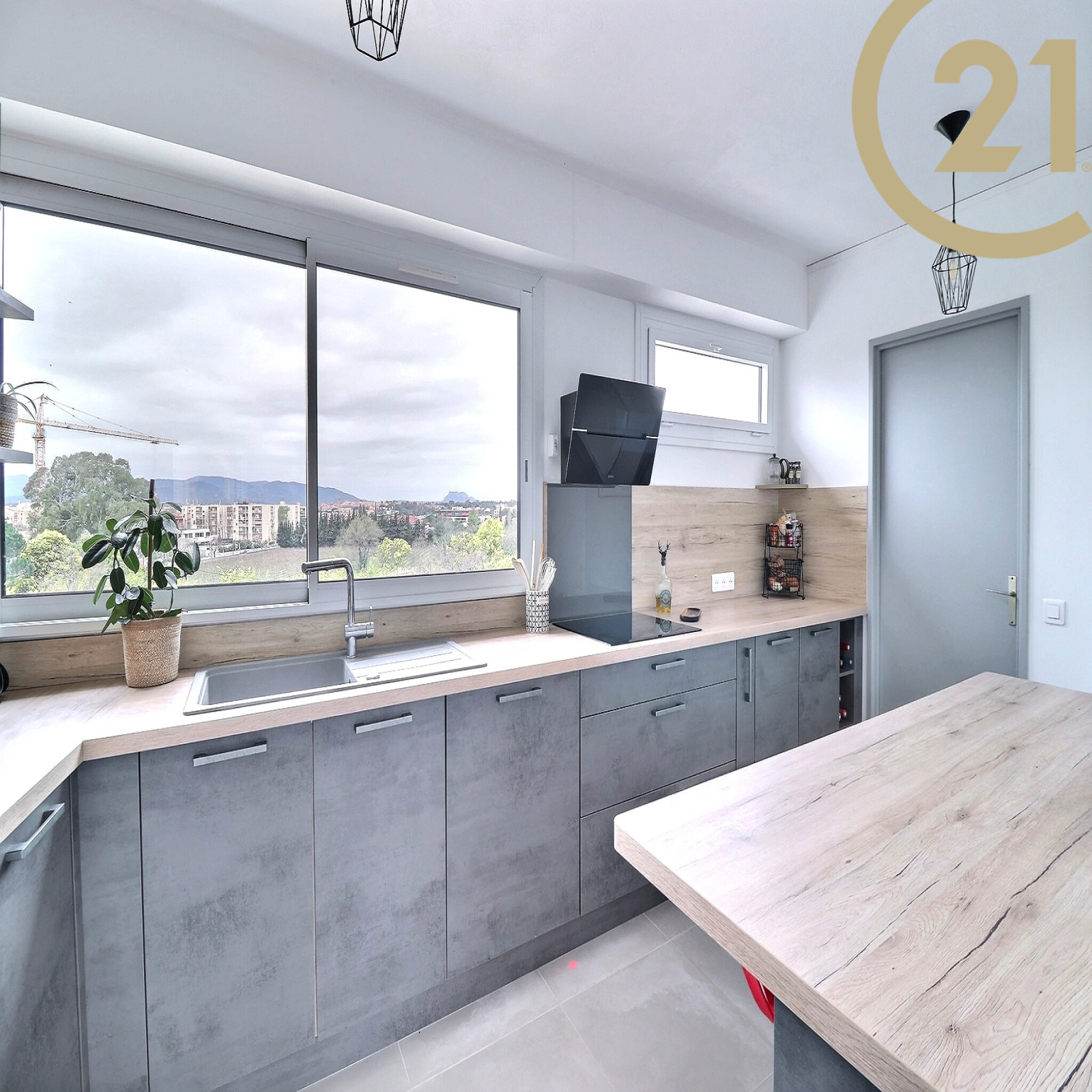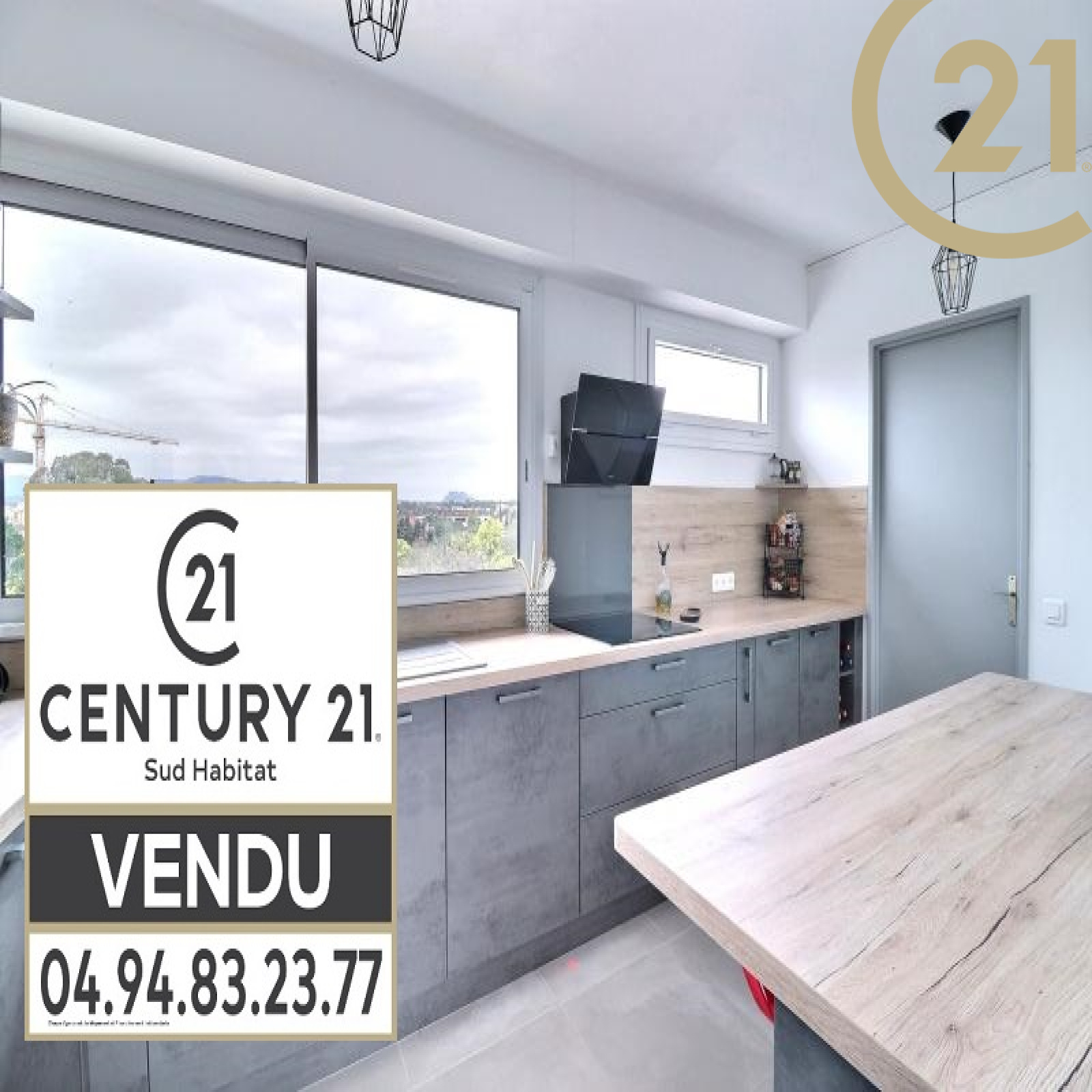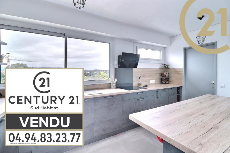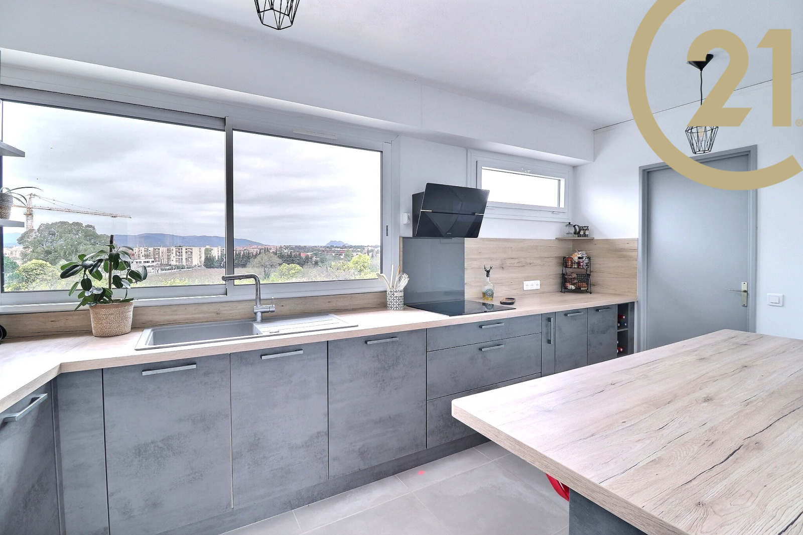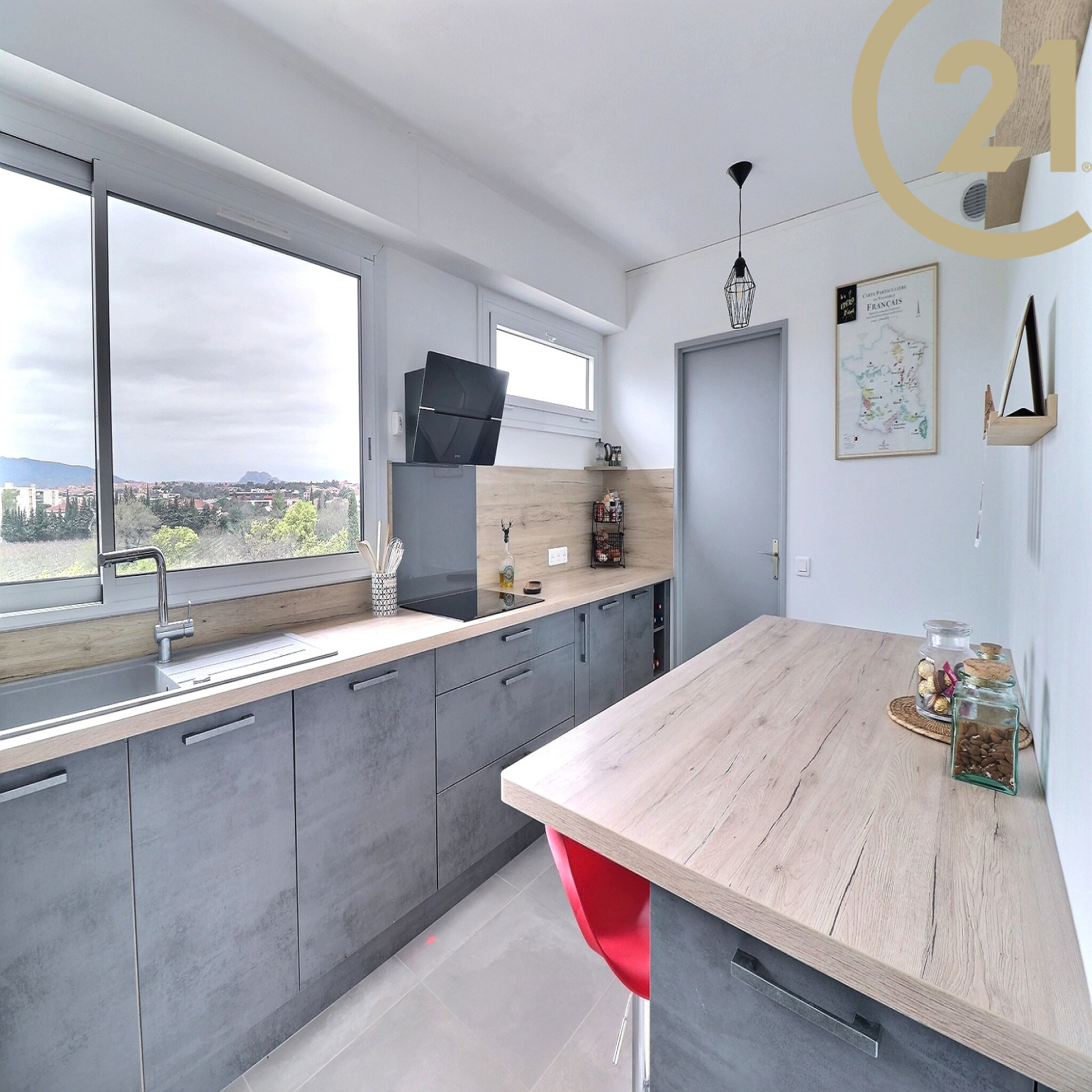 EXCLUSIVITE - FREJUS PROCHE CENTRE-VILLE SAINT-RAPHAEL - Superbe appartement 3 pièces situé au dernier étage d'une résidence sécurisée avec ascenseur à proximité du centre-ville de Saint-Raphaël. Cet appartement entièrement rénové avec goût et idéalement agencé offre un hall d'entrée, un séjour avec mezzanine accueillant un lit double, une cuisine indépendante moderne entièrement équipée avec grand îlot et un cellier/espace buanderie, un dégagement avec placard, deux chambres avec rangements, une salle d'eau dotée d'une grande douche et des WC séparés. Le séjour et les deux chambres bénéficient d'un accès direct sur une grande terrasse jouissant d'une vue dégagée sur le massif de l'Estérel. La cuisine offre une vue dégagée sur les vignes et le rocher de Roquebrune-sur-Argens. Appartement clés en mains. Nombreuses places de parking dans la résidence. Possibilité d'acquérir un garage en supplément. Centre-ville, plages et commerces accessibles rapidement. Copropriété de 74 lots à usage d'habitation. Charges annuelles : 1799 €