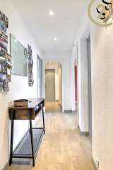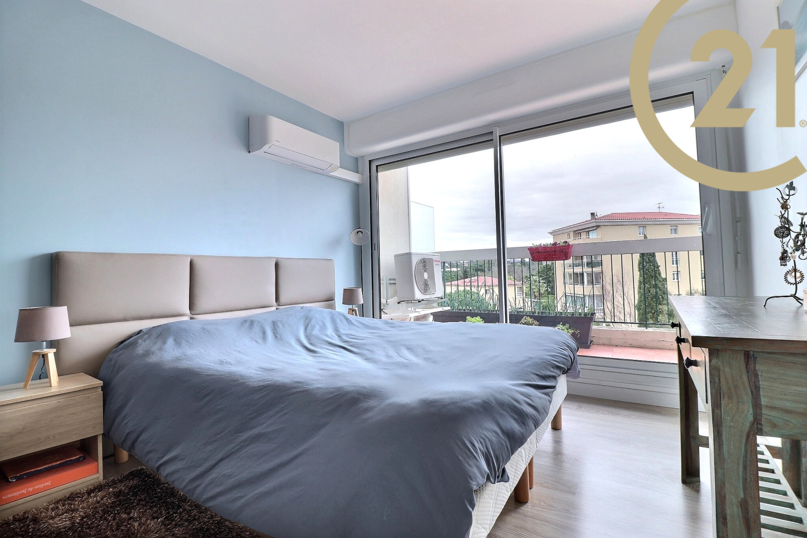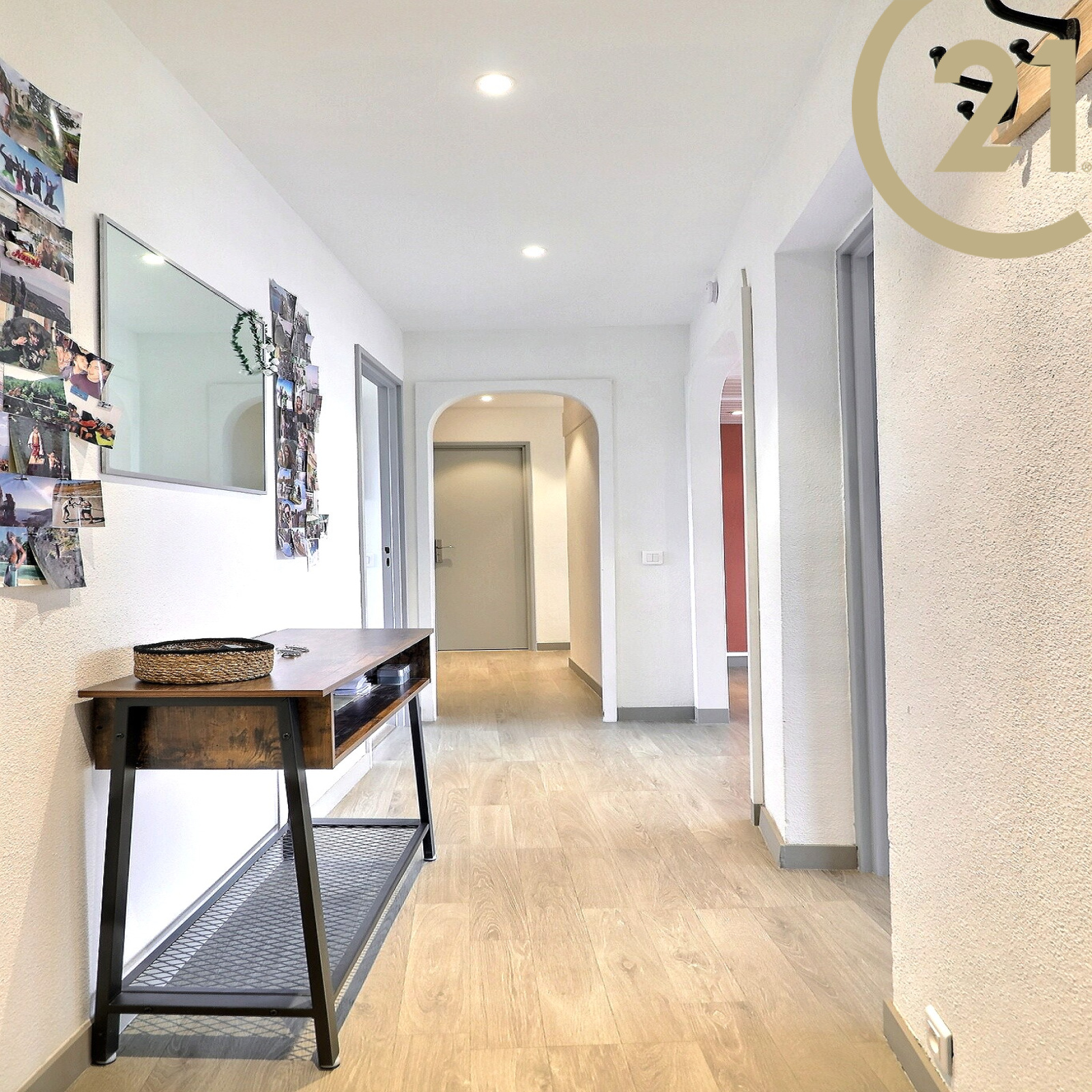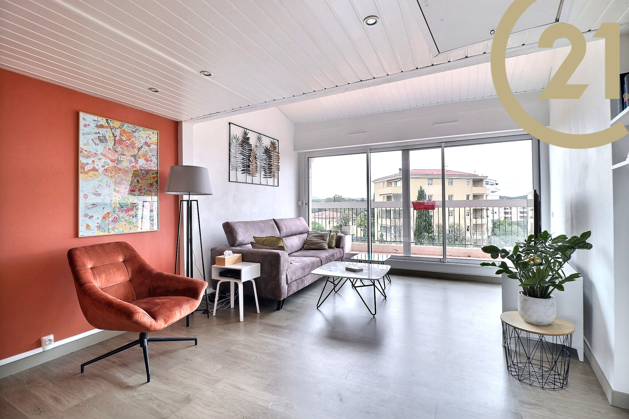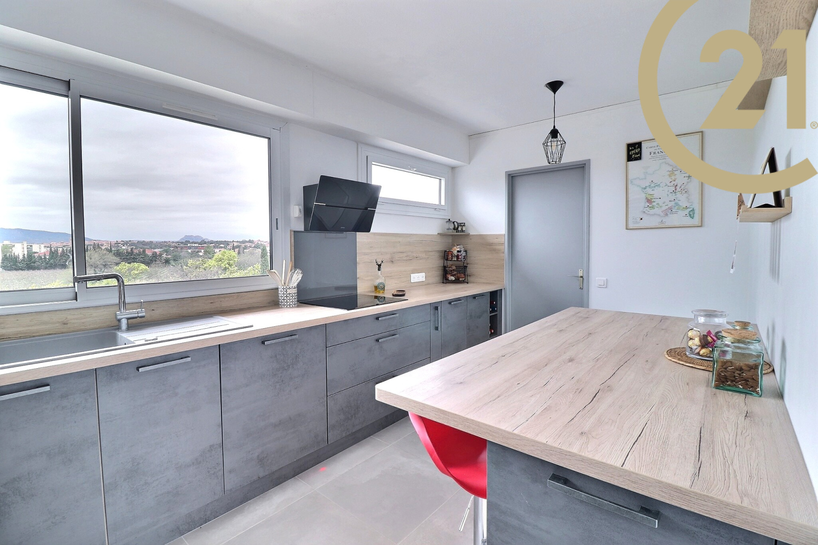 EXCLUSIVITE - FREJUS PROCHE CENTRE-VILLE SAINT-RAPHAEL - Superbe appartement 3 pièces situé au dernier étage d'une résidence sécurisée avec ascenseur à proximité du centre-ville de Saint-Raphaël. Cet appartement entièrement rénové avec goût et idéalement agencé offre un hall d'entrée, un séjour avec mezzanine accueillant un lit double, une cuisine indépendante moderne entièrement équipée avec grand îlot et un cellier/espace buanderie, un dégagement avec placard, deux chambres avec rangements, une salle d'eau dotée d'une grande douche et des WC séparés. Le séjour et les deux chambres bénéficient d'un accès direct sur une grande terrasse jouissant d'une vue dégagée sur le massif de l'Estérel. La cuisine offre une vue dégagée sur les vignes et le rocher de Roquebrune-sur-Argens. Appartement clés en mains. Nombreuses places de parking dans la résidence. Possibilité d'acquérir un garage en supplément. Centre-ville, plages et commerces accessibles rapidement. Copropriété de 74 lots à usage d'habitation. Charges annuelles : 1799 €