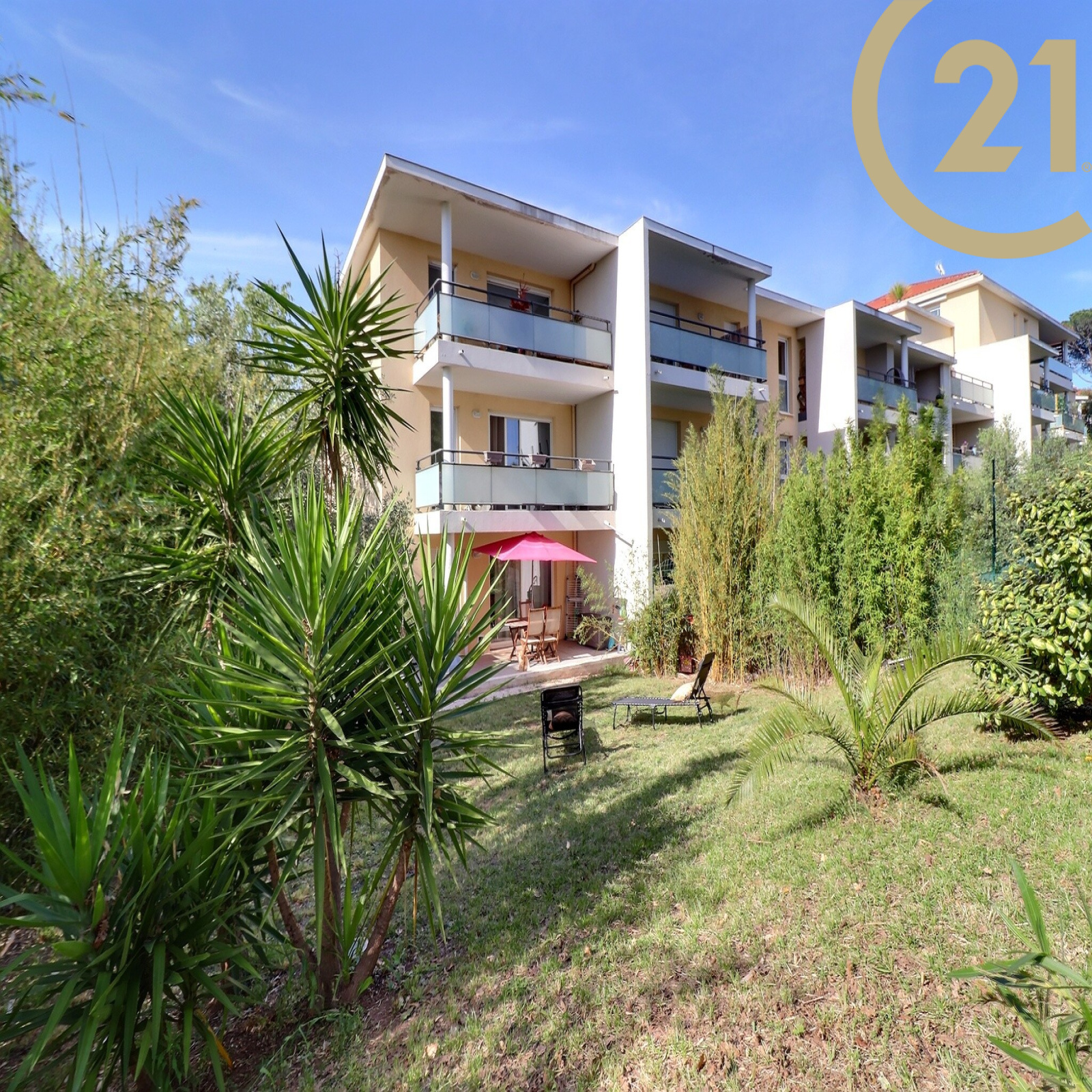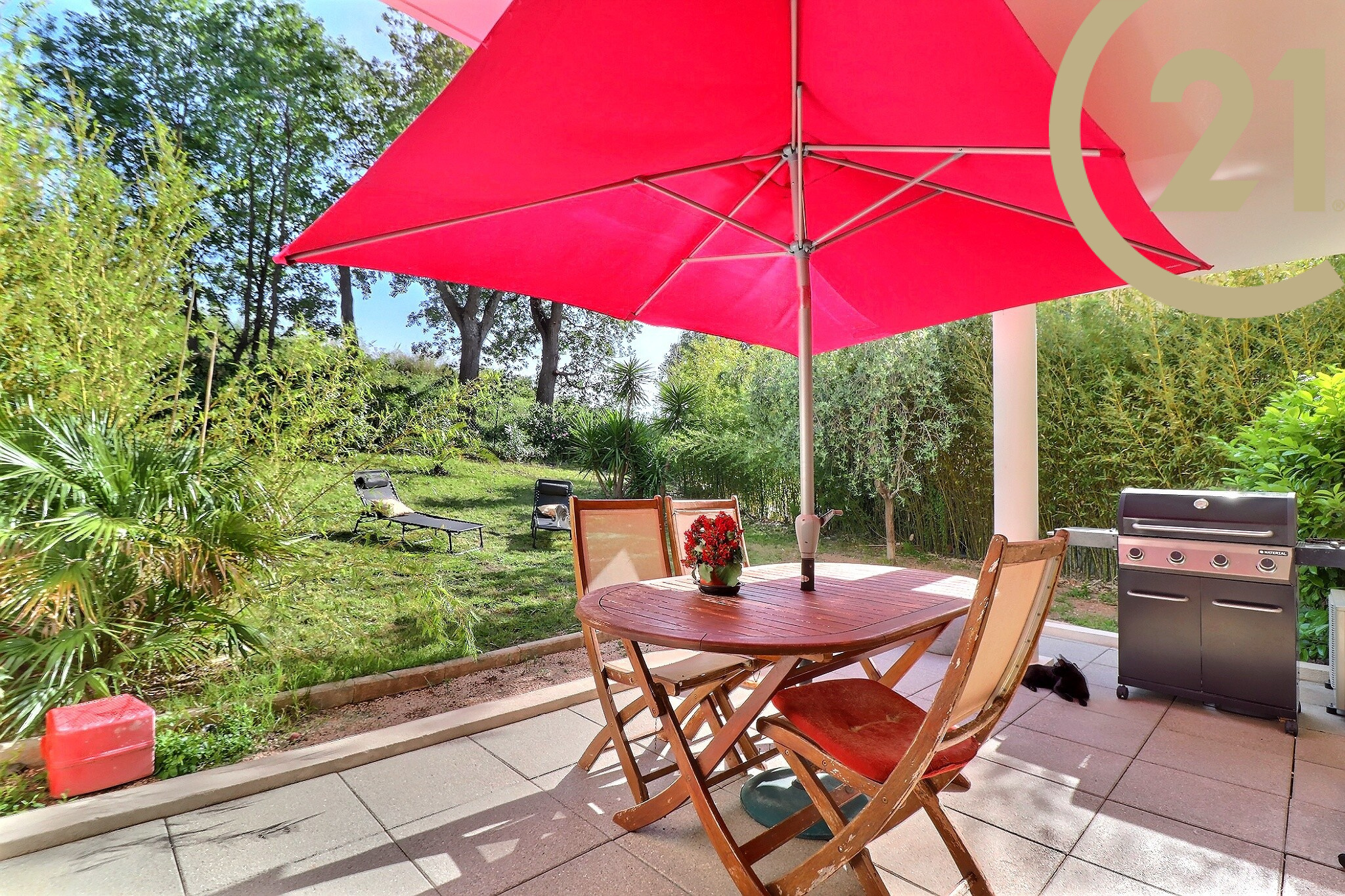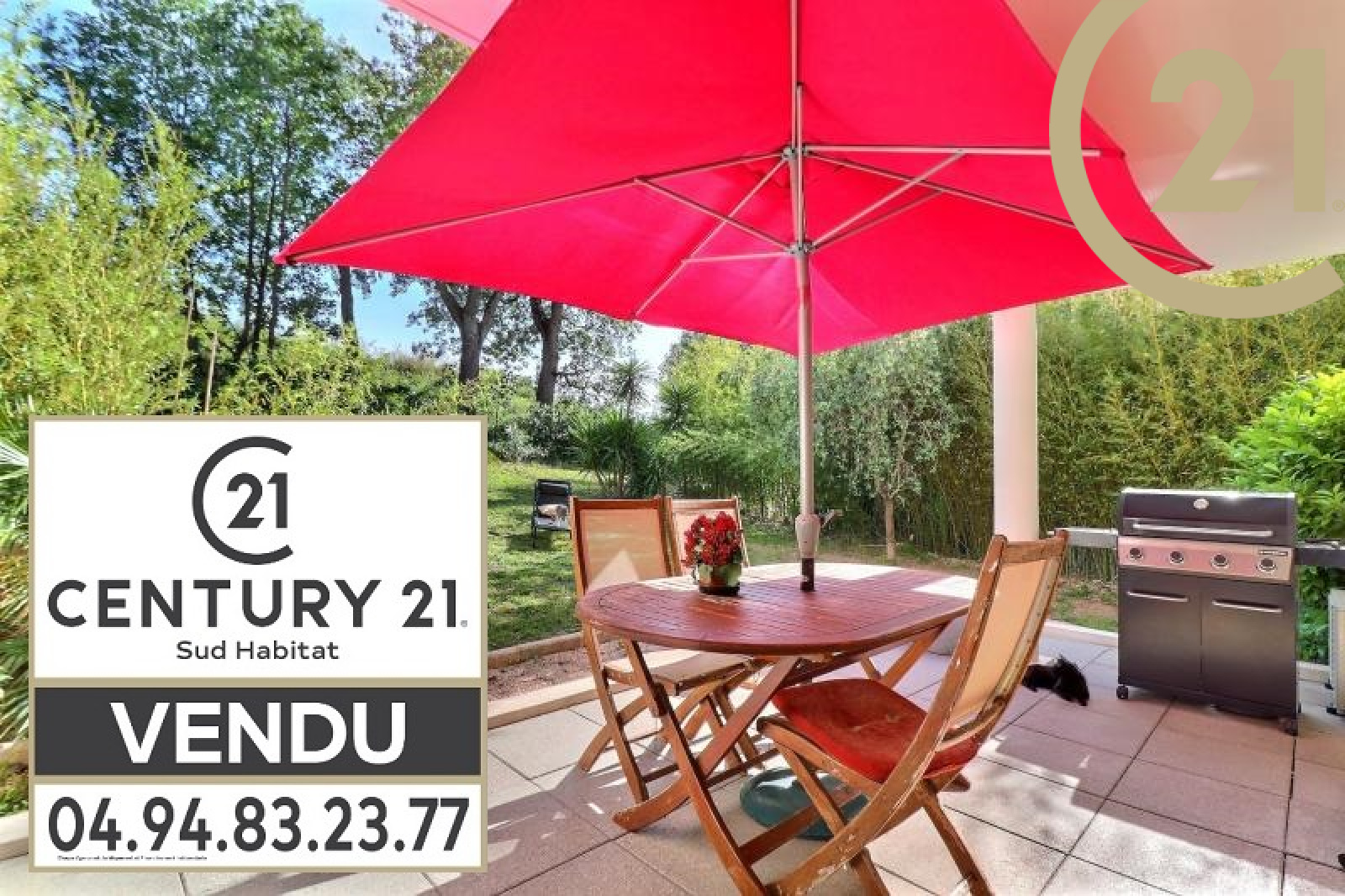 FREJUS PROCHE COMMERCE - Bel appartement 3 pièces situé en rez-de-jardin dans une résidence de standing récente. Cet appartement très soigné offre un hall d'entrée, une grande pièce de vie climatisée avec cuisine moderne entièrement équipée ouverte sur une large terrasse de 18m² exposée Sud, un coin nuit indépendant composé de deux chambres avec placards, une salle de bains, des WC séparés et un dégagement avec rangement. L'appartement possède un grand jardin arboré de 170 m² sans vis-à-vis. Un garage et un parking privatif complètent ce bien. La résidence bénéficie d'un environnement très calme à quelques minutes du centre-ville, des commerces et des accès autoroute.