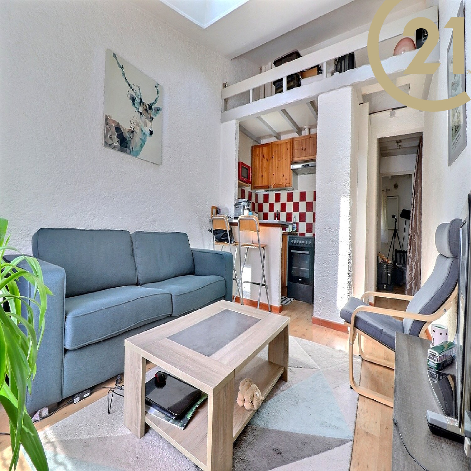 Il se compose d'une pièce de vie avec coin cuisine, d'une salle de bains avec wc, d'une chambre et d'une mezzanine.