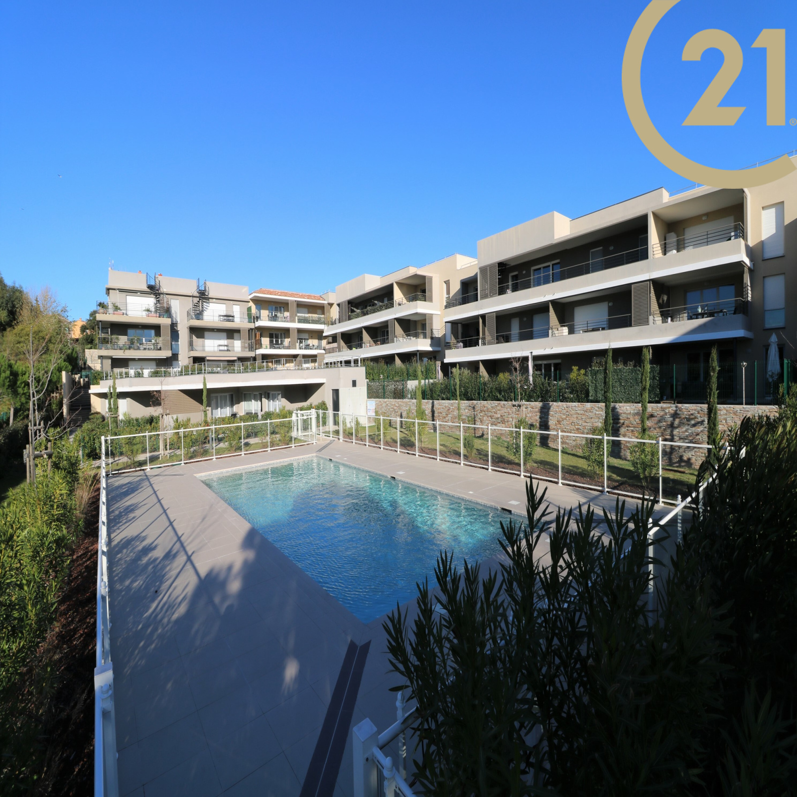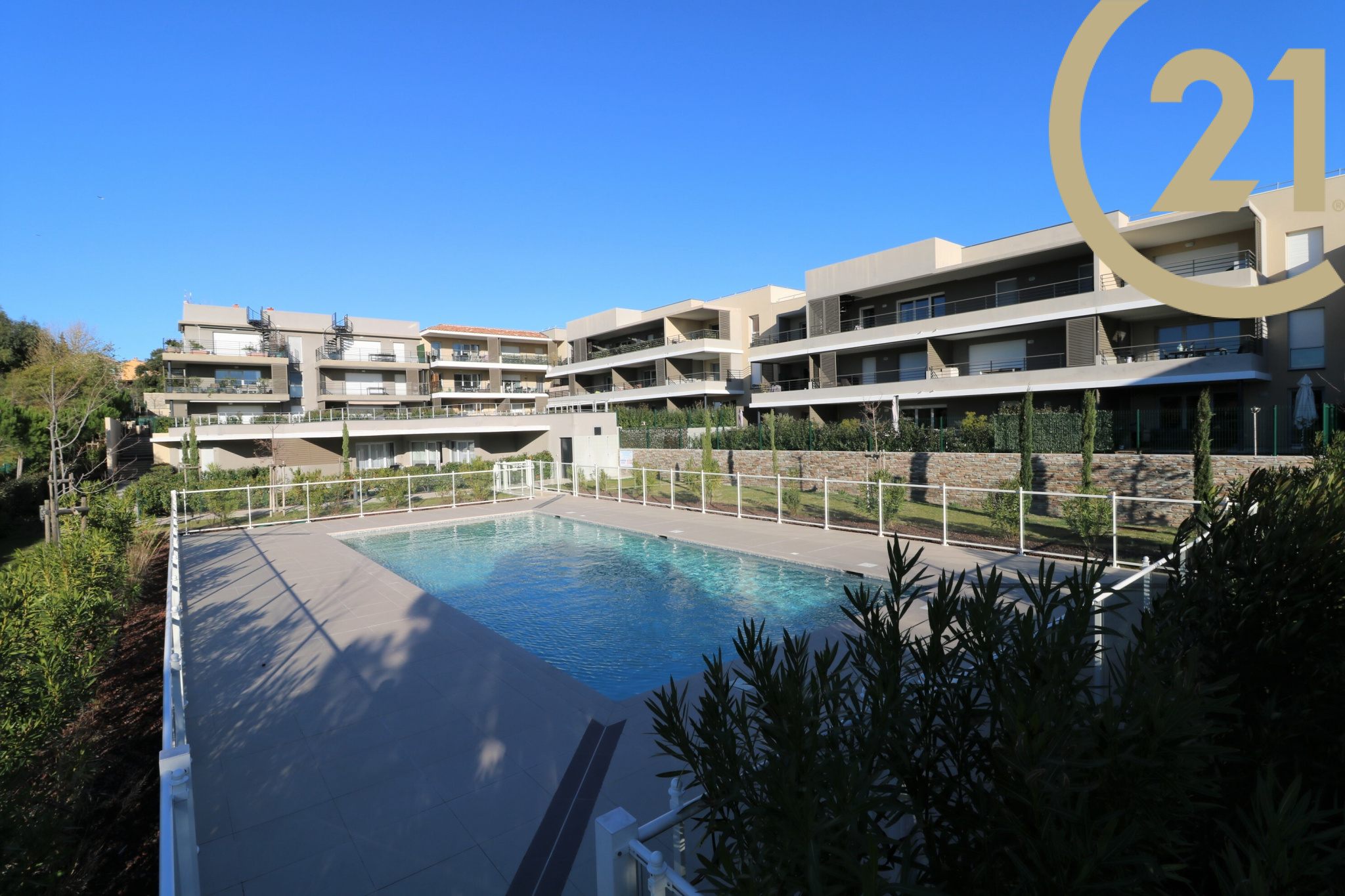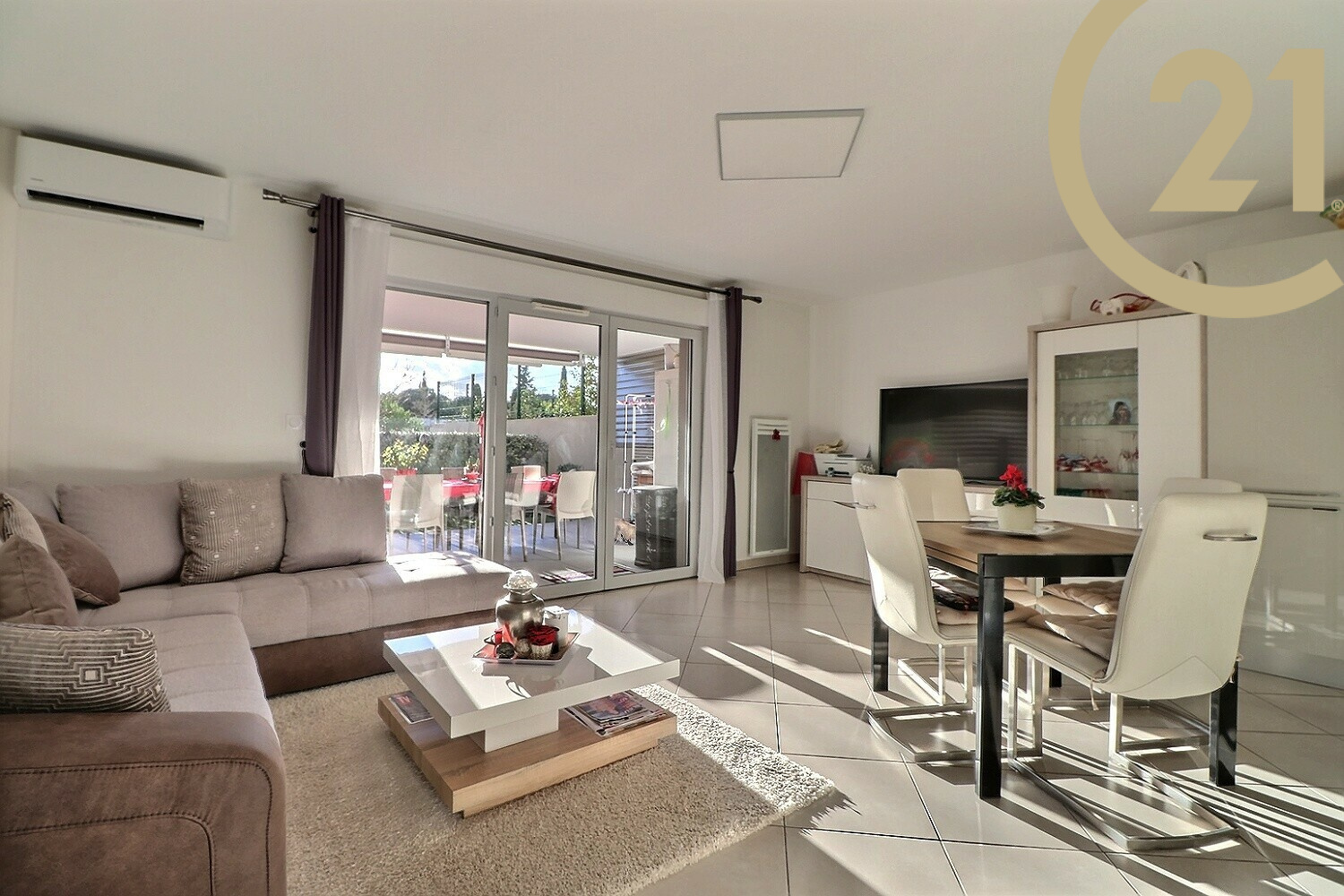 FREJUS TOUR DE MARE - Superbe appartement 3 pièces de 69.90 m² situé dans une résidence récente avec piscine. Cet appartement traversant parfaitement entretenu offre un hall d'entrée avec placard, un séjour climatisé avec cuisine ouverte haut de gamme dotée de nombreux rangements et donnant sur une large terrasse de 19 m² et un joli jardinet, et un coin nuit composé de deux chambres offrant toutes deux un accès sur un second jardin privatif, une salle d'eau avec grande douche à l'italienne et WC, et des toilettes séparées avec espace buanderie. La pièce principale exposée Sud offre une jolie vue dégagée sur la verdure. Un grand garage double est vendu avec cet appartement. Vous apprécierez la double exposition de cet appartement, son aspect très soigné, ainsi que sa grande terrasse couverte et ses deux espaces verts. La résidence est dotée d'un joli parc paysager et d'une belle piscine. Accès autoroute, établissements scolaires, et centre-ville accessibles en quelques minutes. Charges annuelles : 1475 € Copropriéte de 77 lots à usage d'habitation.