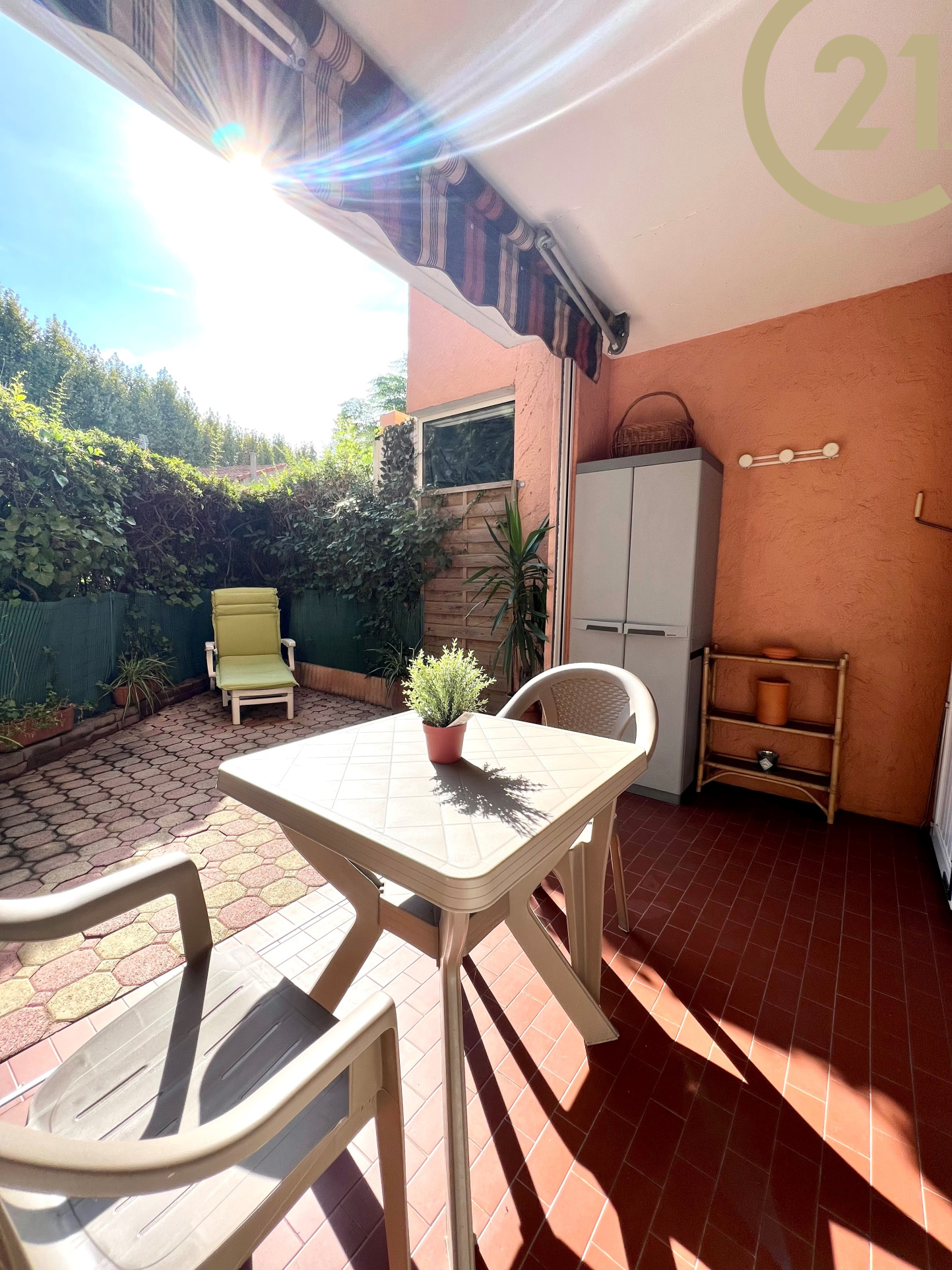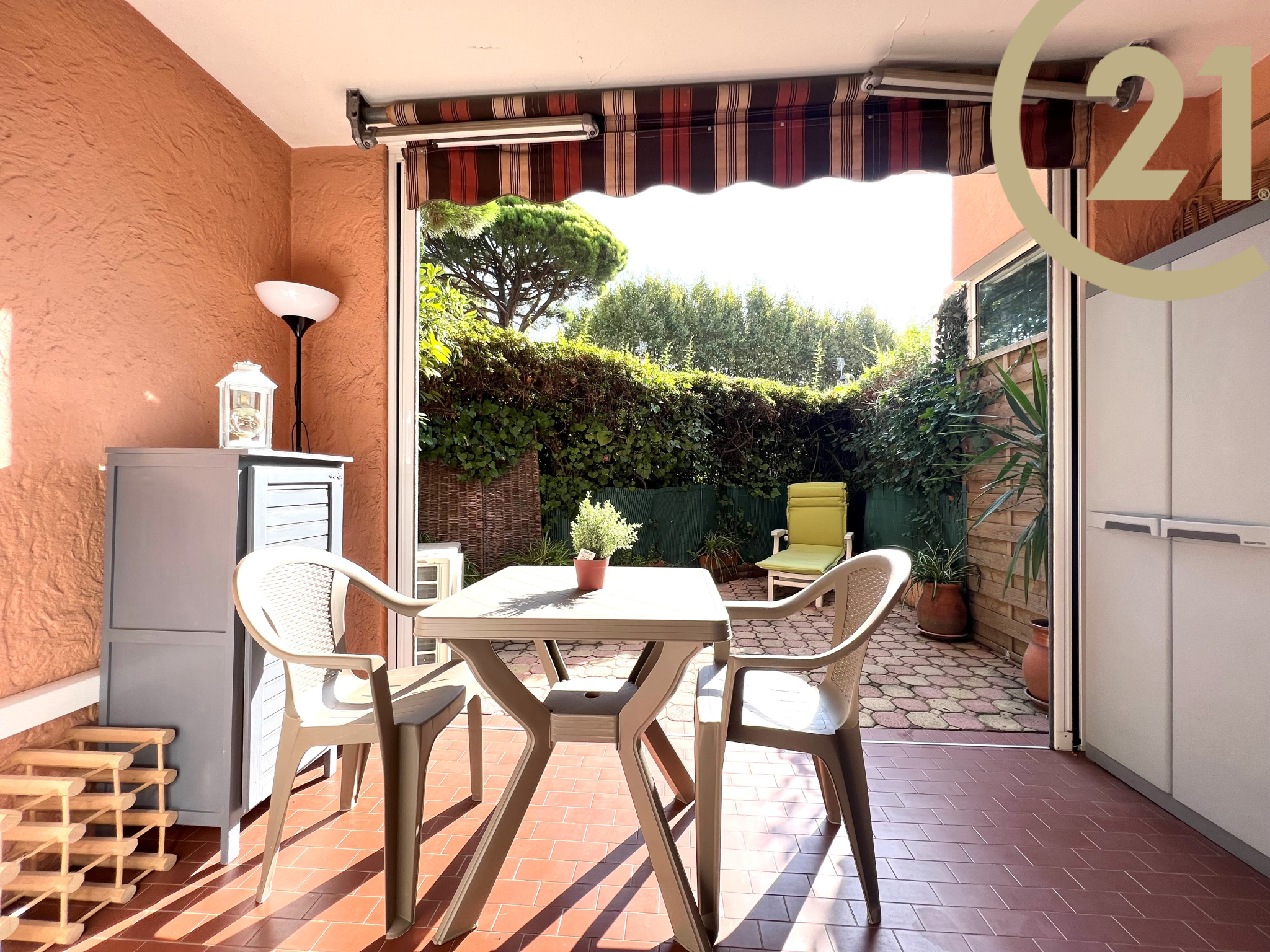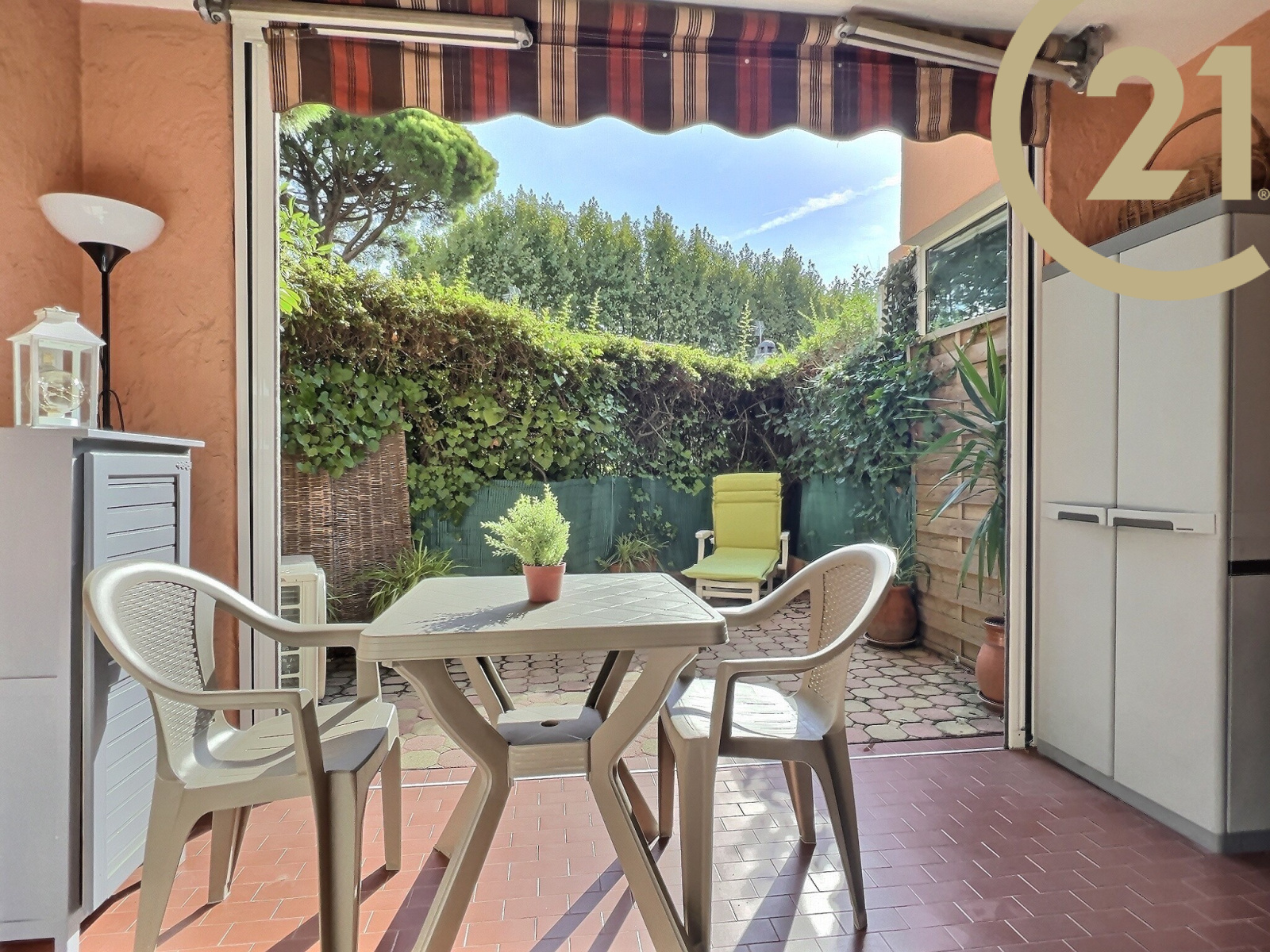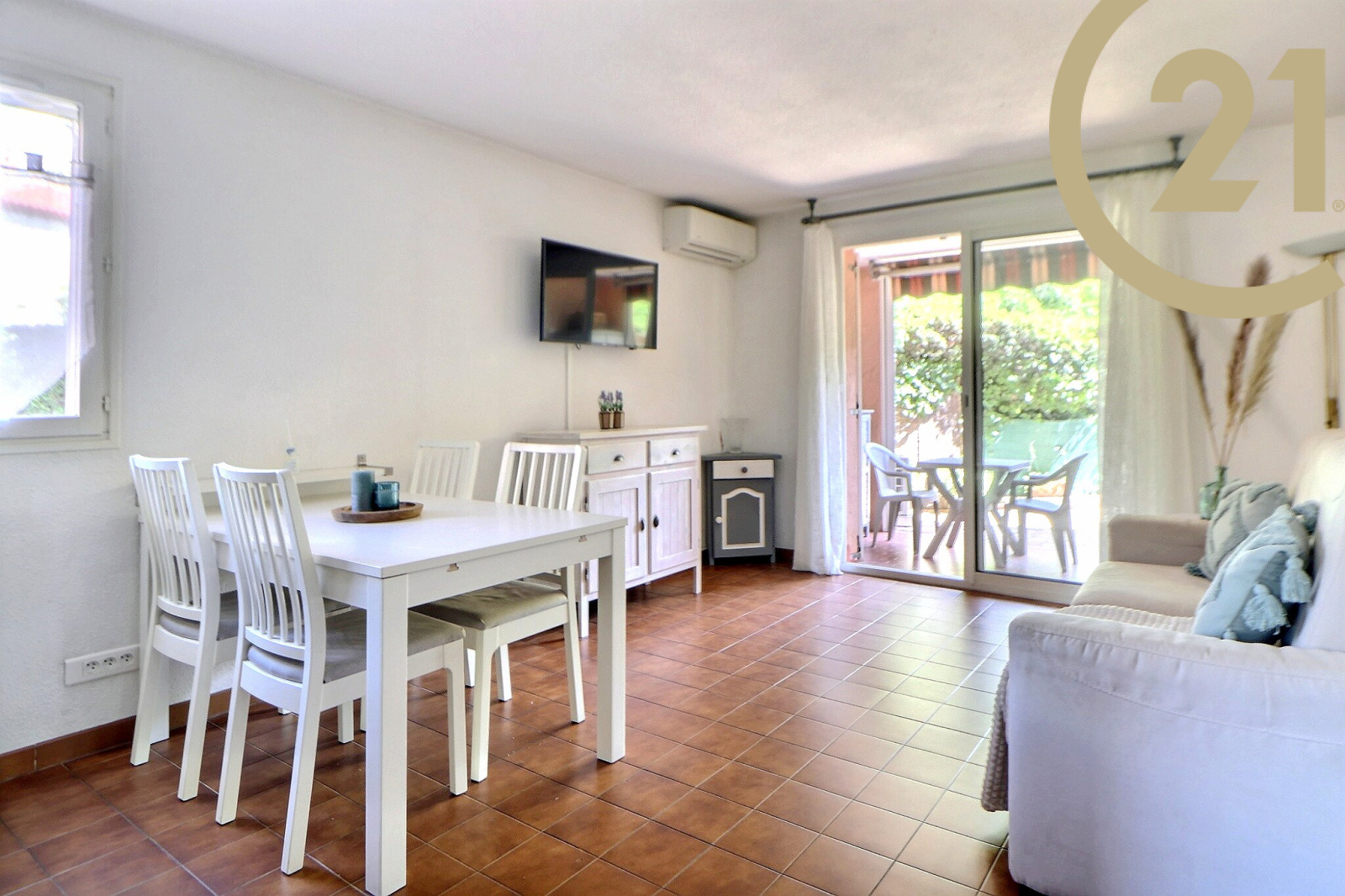 EXCLUSIVITE - FREJUS PROCHE PLAGES PORT ET BASE NATURE - Coquet appartement 2 pièces de 33.78 m² situé en rez-de-jardin dans une résidence sécurisée à quelques minutes à pied de la base nature, du port, des plages et des commerces. Cet appartement traversant et bien entretenu offre un hall d'entrée, un séjour avec cuisine ouverte équipée, une chambre avec placard et une salle d'eau avec WC. Une jolie terrasse couverte équipée d'une moustiquaire et d'un store prolongée d'un jardin vous permettra de profiter de l'extérieur. Appartement climatisé et baie à galandage dans le séjour. Ce bien est vendu avec un cellier et une place de parking privative. Local vélos dans la résidence. Tous commerces, centre-ville, port et plages accessibles à pied. Copropriété de 69 lots à usage d'habitation. Charges annuelles : 896 €.