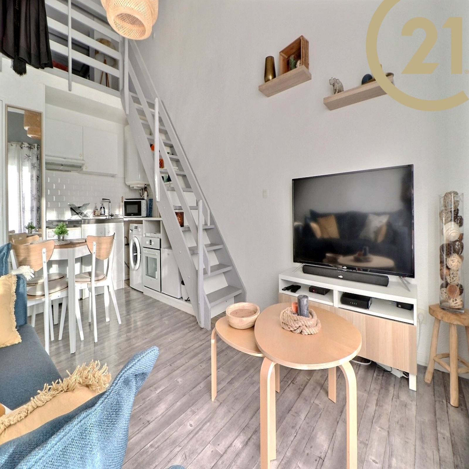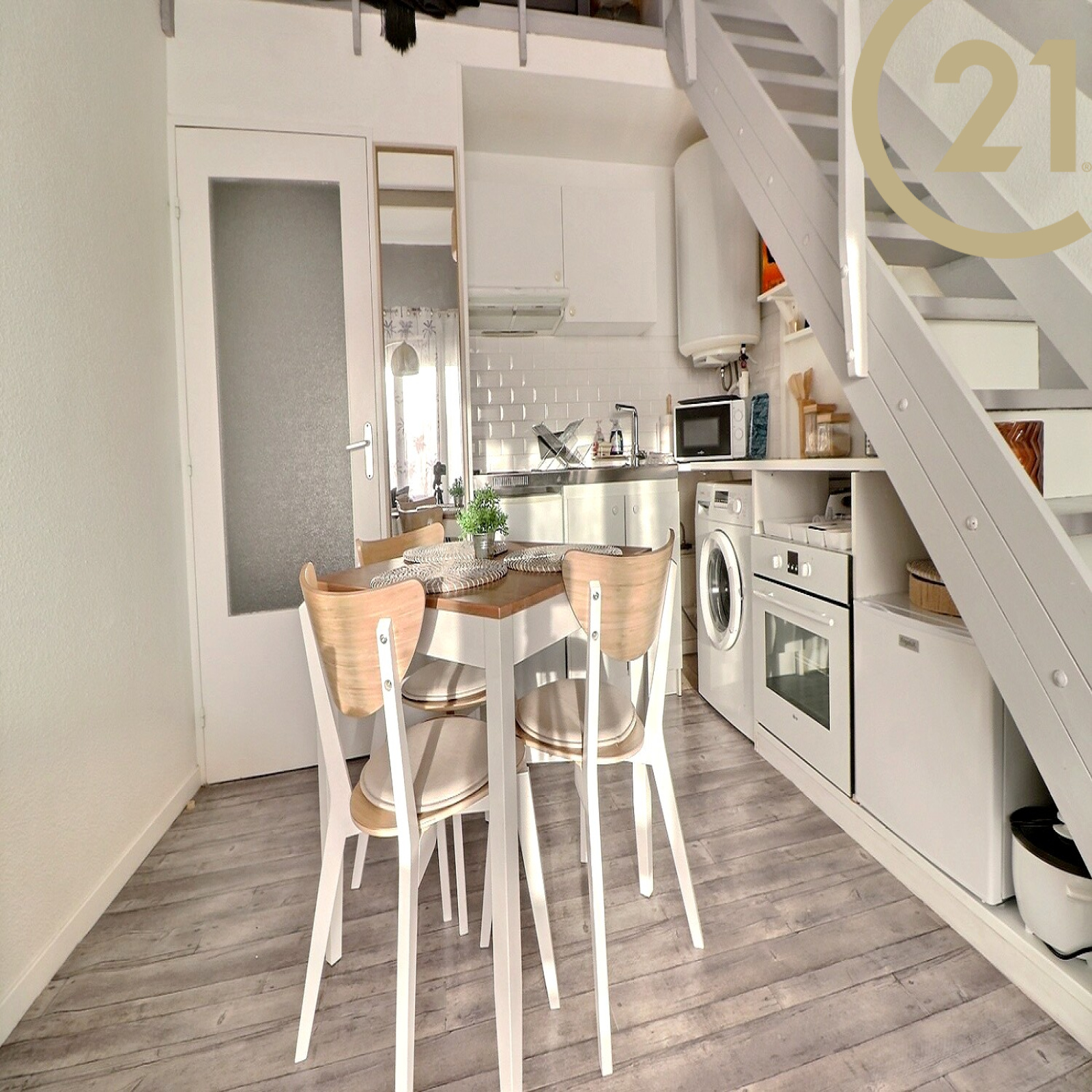 Ce bien offre : un salon avec une cuisine ouverte donnant sur un balcon avec une vue dégagée sur le parc de la résidence, une salle de bains avec WC et une mezzanine avec une grande chambre.