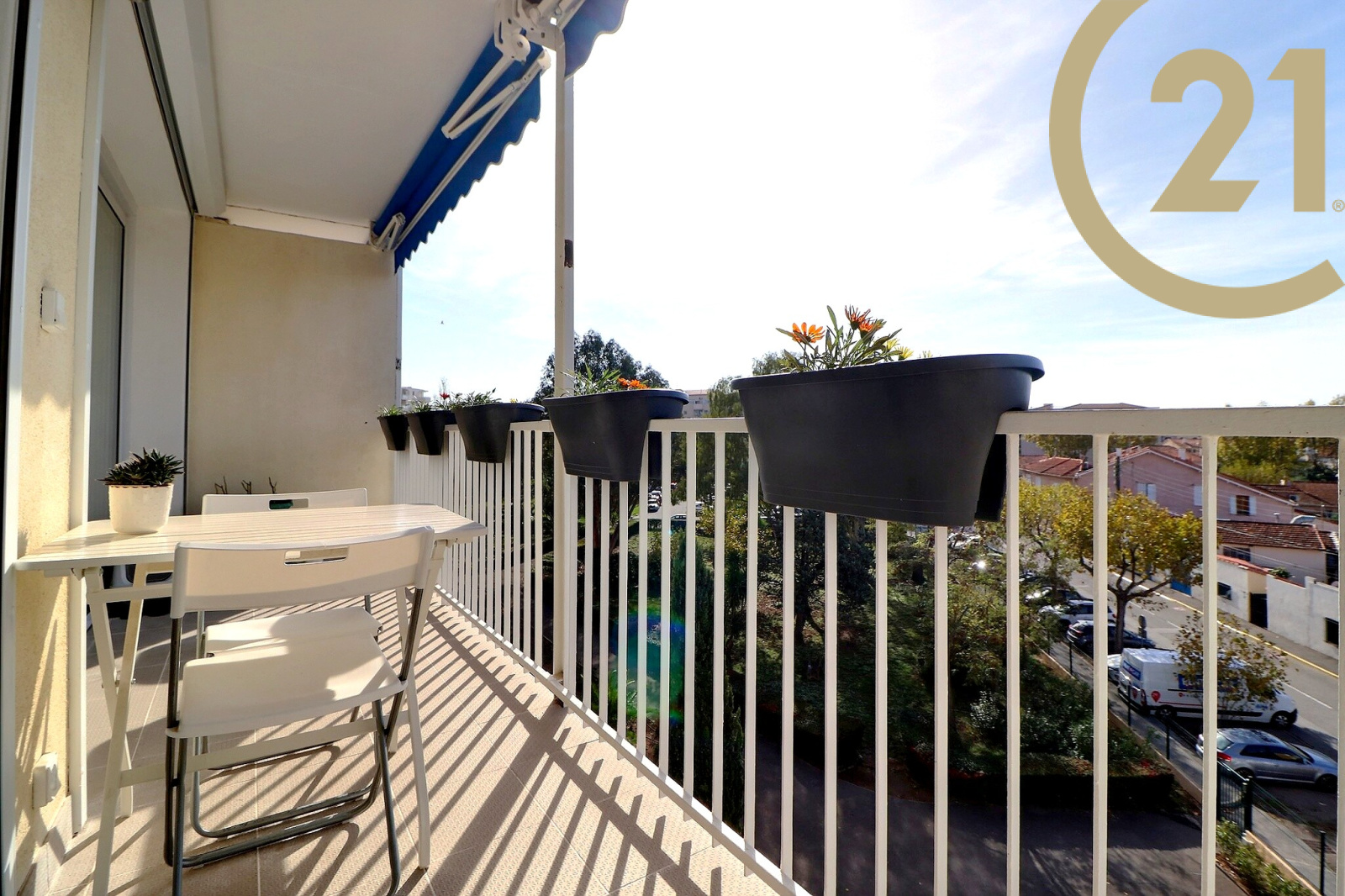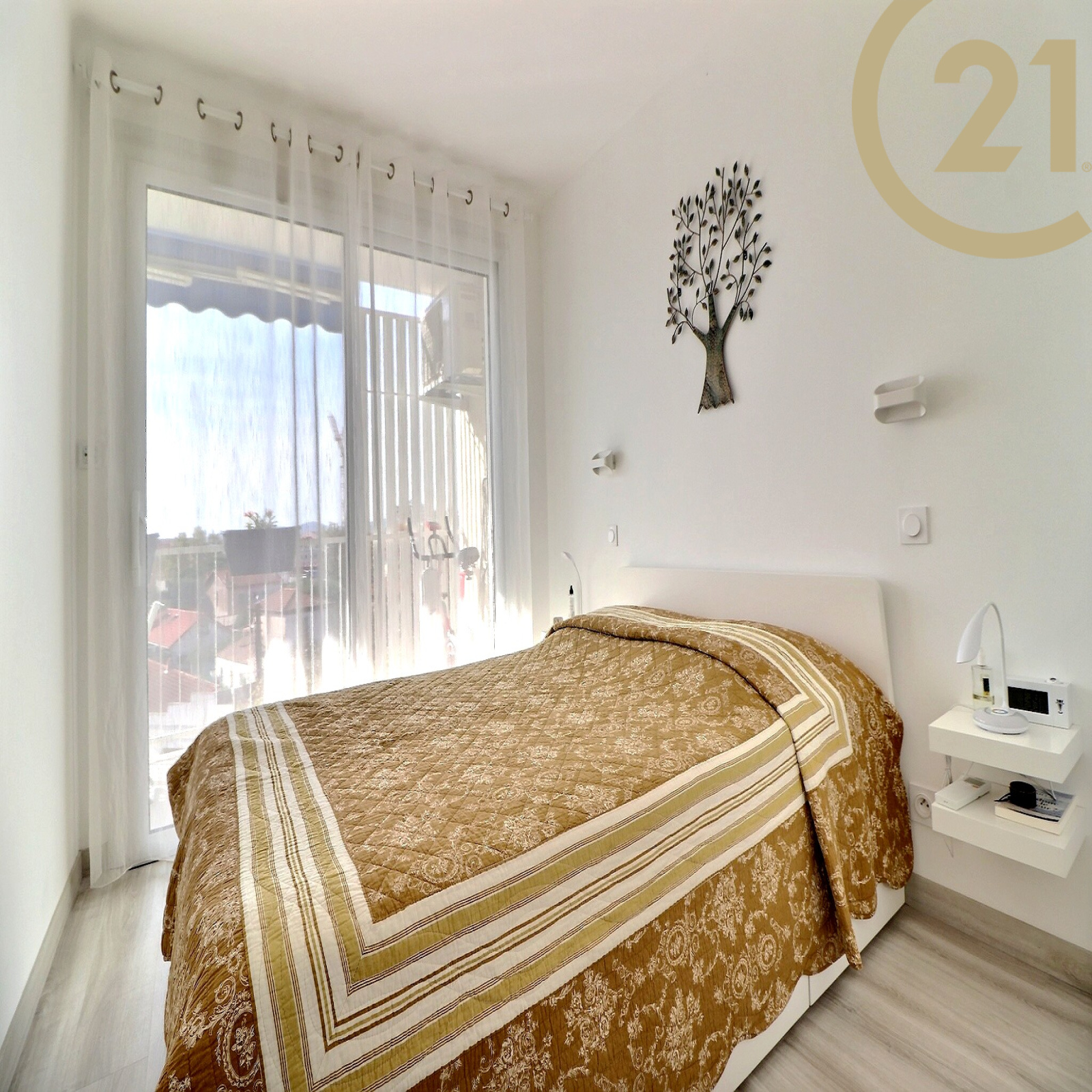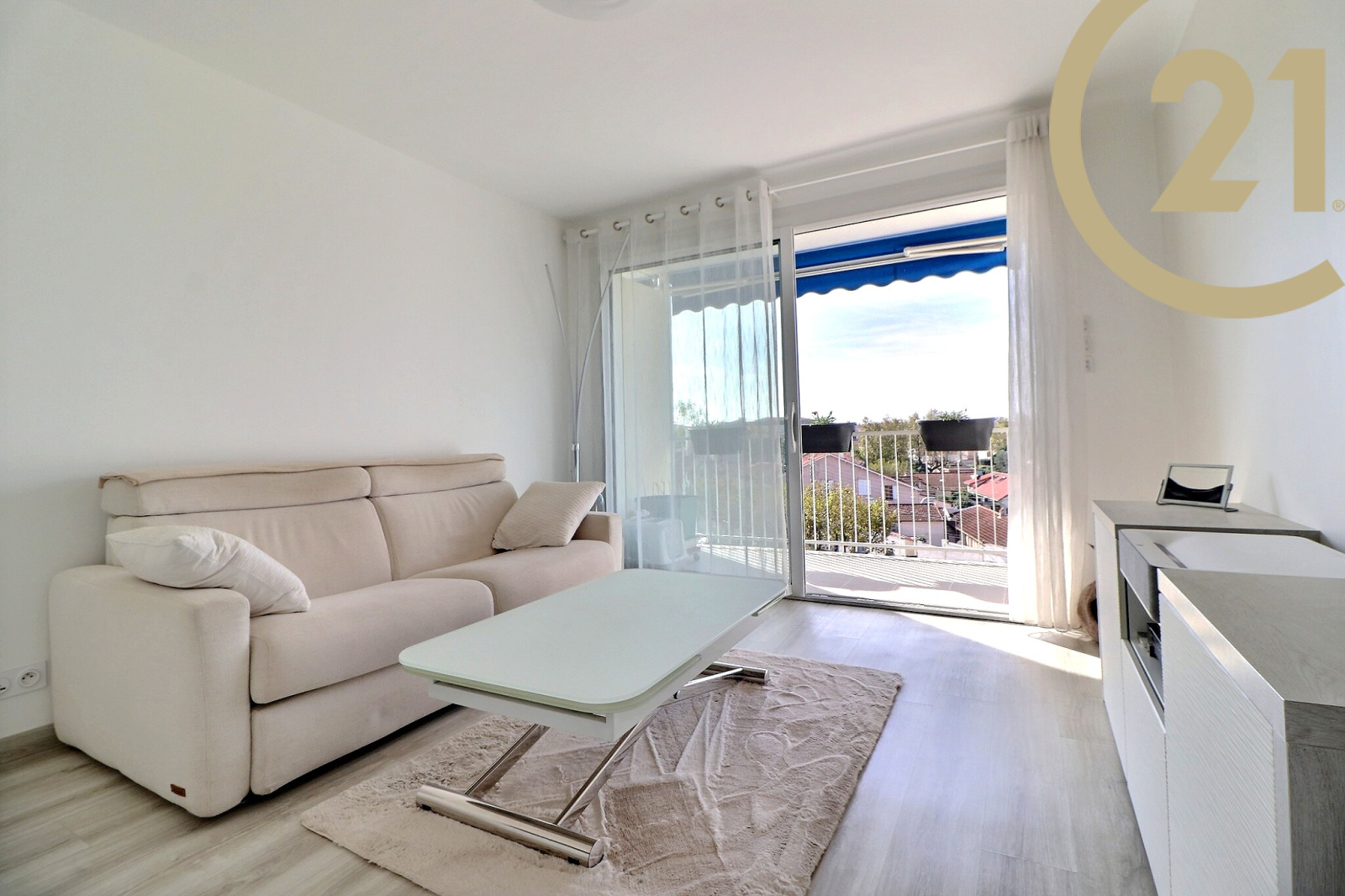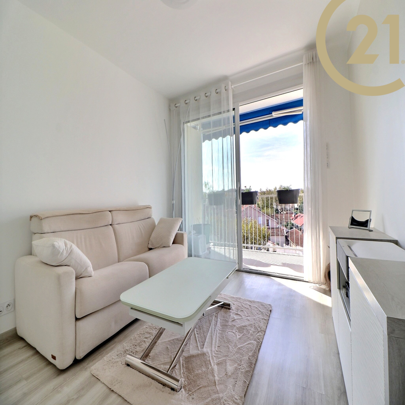 Le séjour et la chambre donnent sur une terrasse exposée SUD. Appartement climatisé.