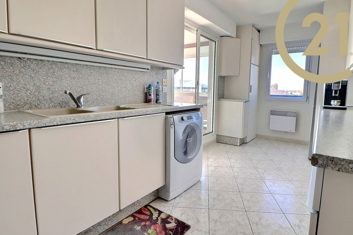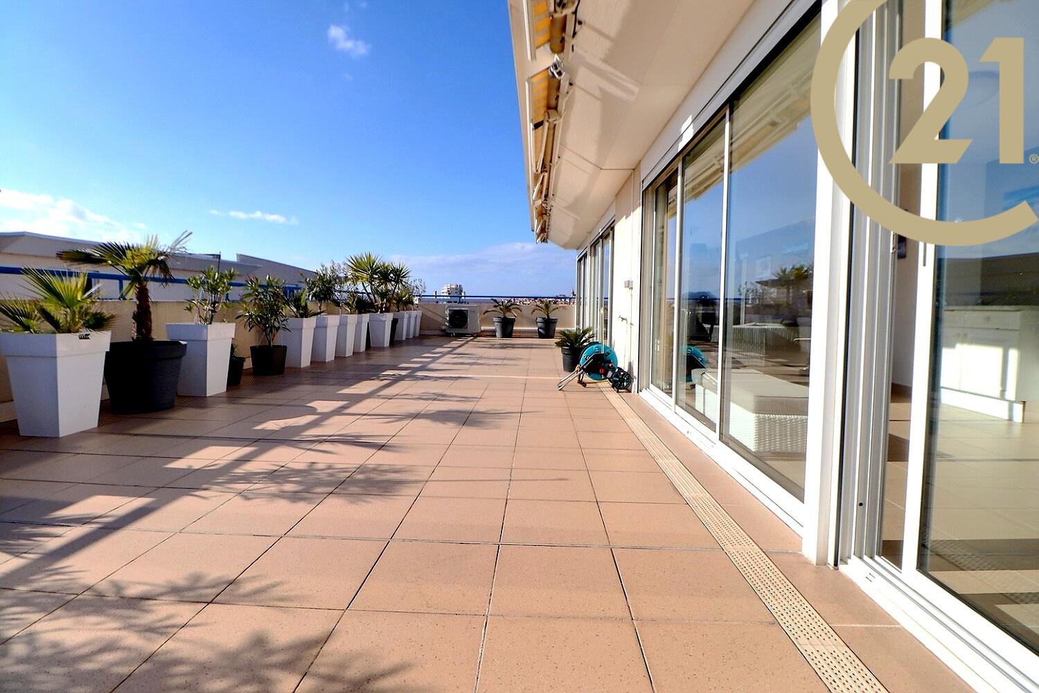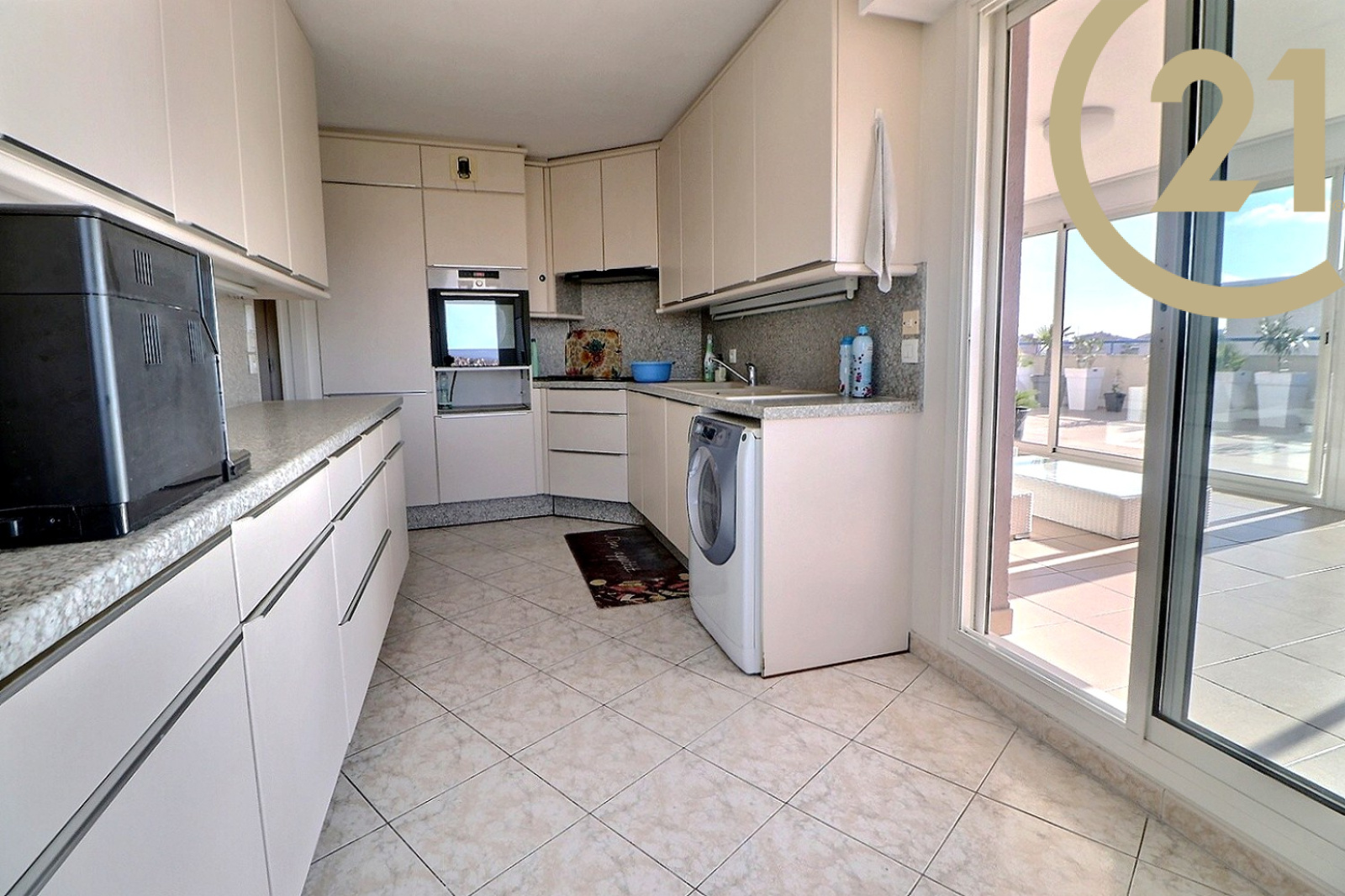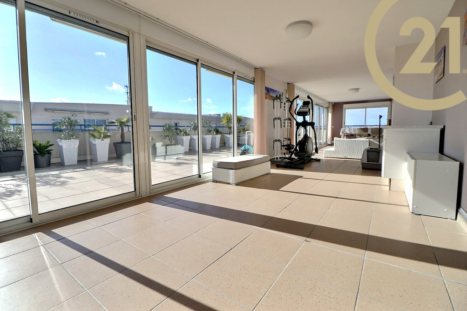 FREJUS PLAGE - Situé à quelques minutes du bord de mer, superbe appartement 4 pièces dans une résidence avec piscine situé au 5ème et dernier étage avec ascenseur. Ce bien d'exception est composé : d'une grande pièce de vie donnant sur une spacieuse véranda lumineuse ainsi qu'une grande terrasse plein Sud, d'une cuisine indépendante aménagée et équipée, d'une chambre avec salle d'eau, d'une autre chambre avec placard, d'une salle de bains et de 2 WC. Un grand garage en sous-sol et une place de parking extérieure complètent ce bien.