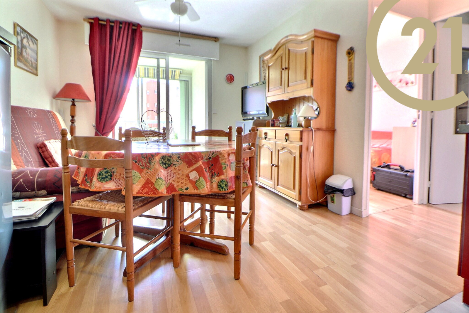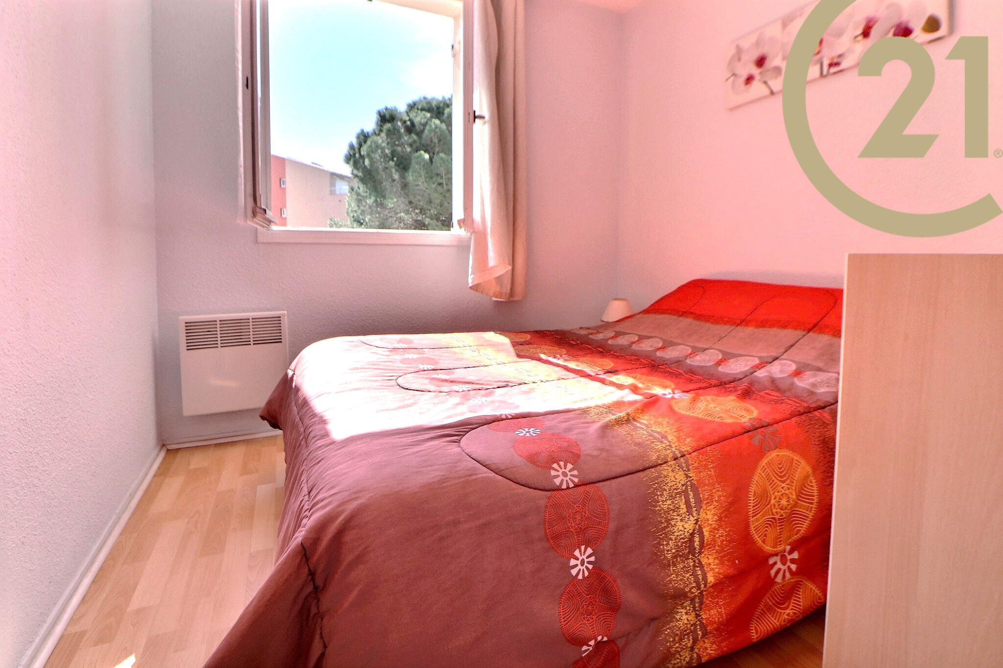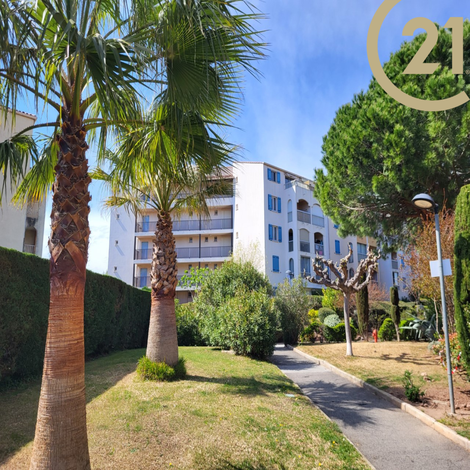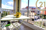 FREJUS, dans une résidence arborée avec piscine, parc et terrain de tennis, appartement de 2 pièces de 28 m² composé : d'une entrée donnant sur un séjour, d'une cuisine ouverte, d'une salle d'eau neuve, d'une chambre et d'un WC indépendant.