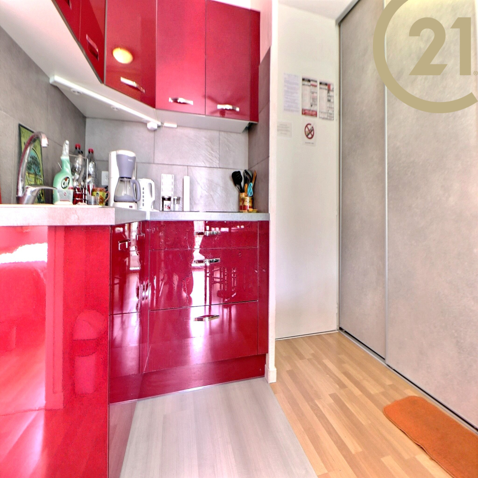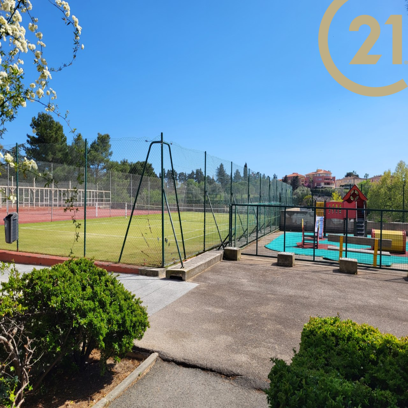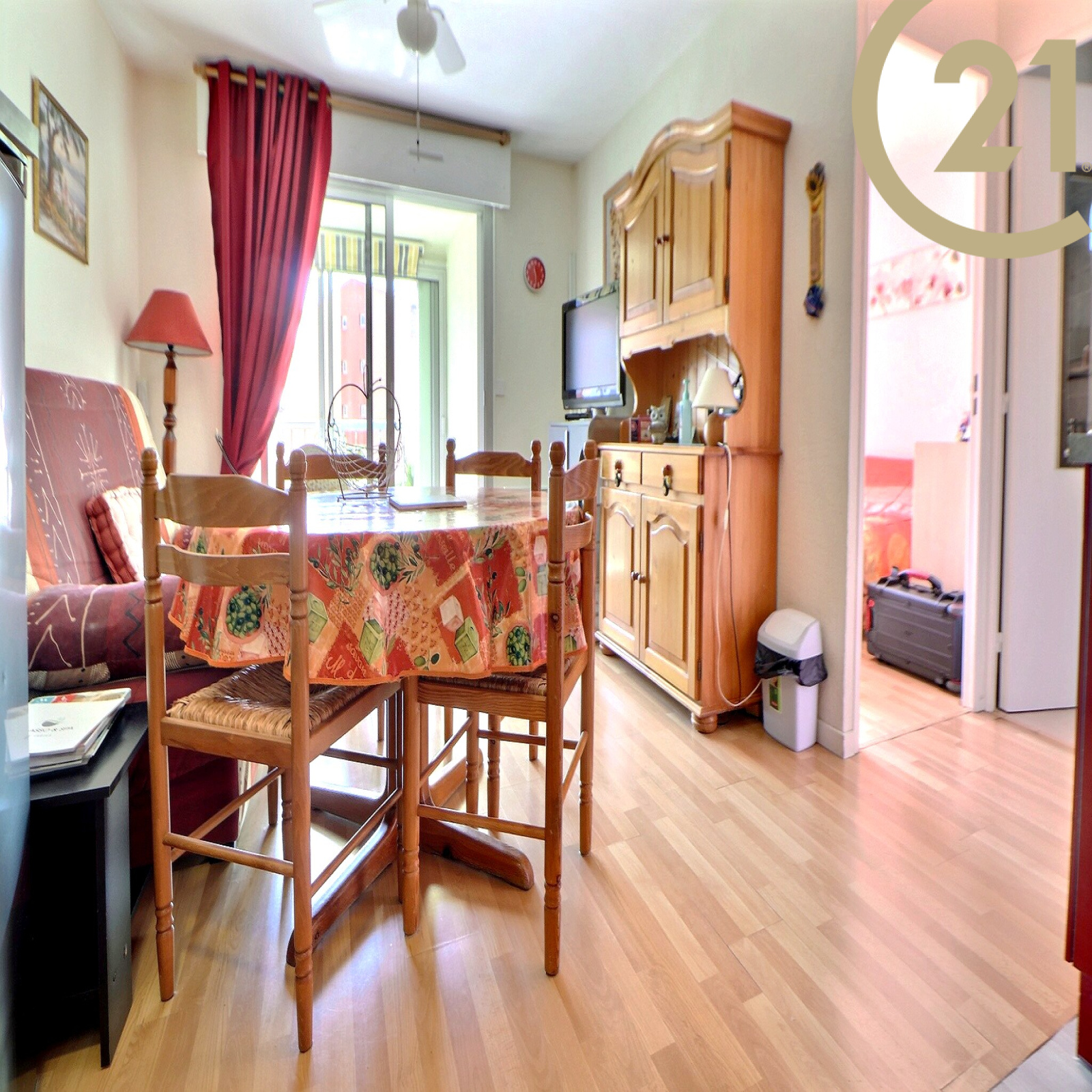 FREJUS, dans une résidence arborée avec piscine, parc et terrain de tennis, appartement de 2 pièces de 28 m² composé : d'une entrée donnant sur un séjour, d'une cuisine ouverte, d'une salle d'eau neuve, d'une chambre et d'un WC indépendant.