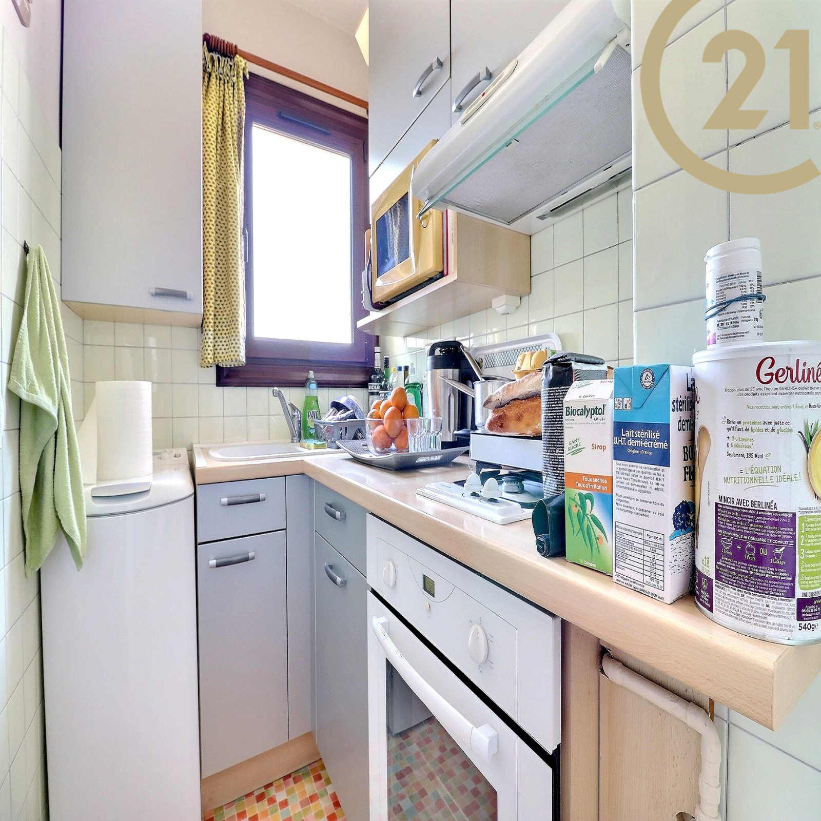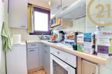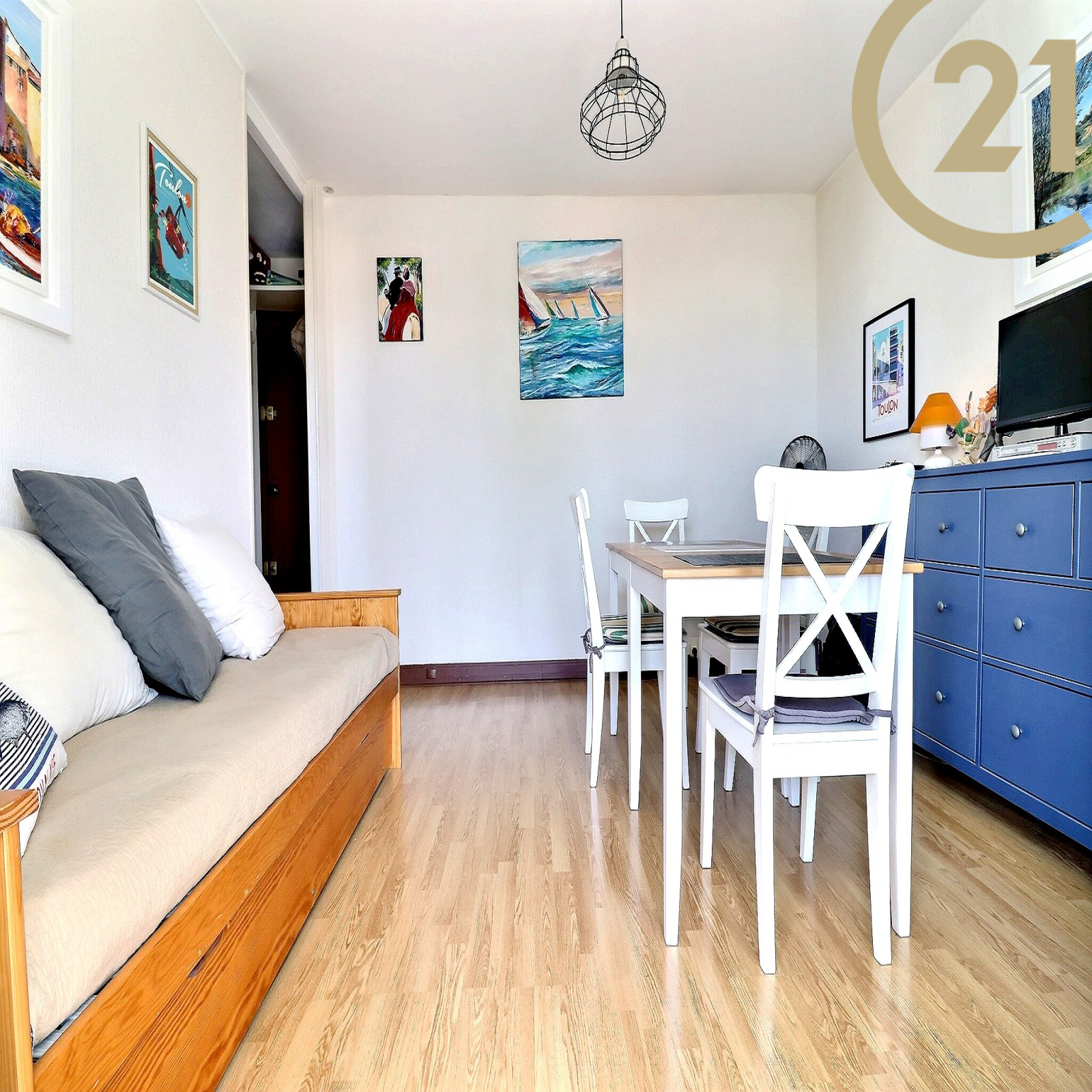 Cet appartement comprend une entrée, un séjour donnant sur une terrasse fermée exposée SUD-OUEST, une kitchenette, un coin nuit avec placard et une salle de bains avec WC.