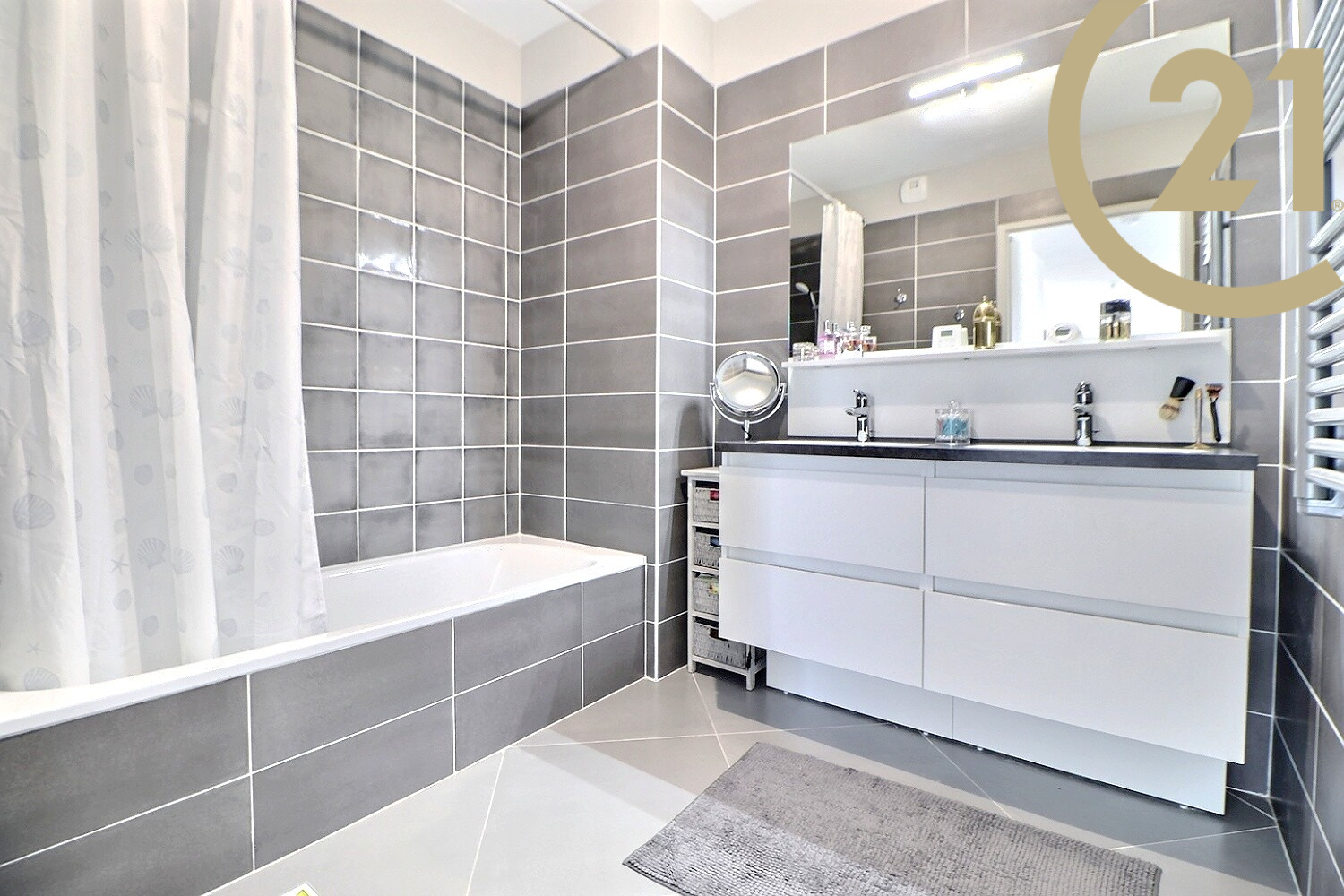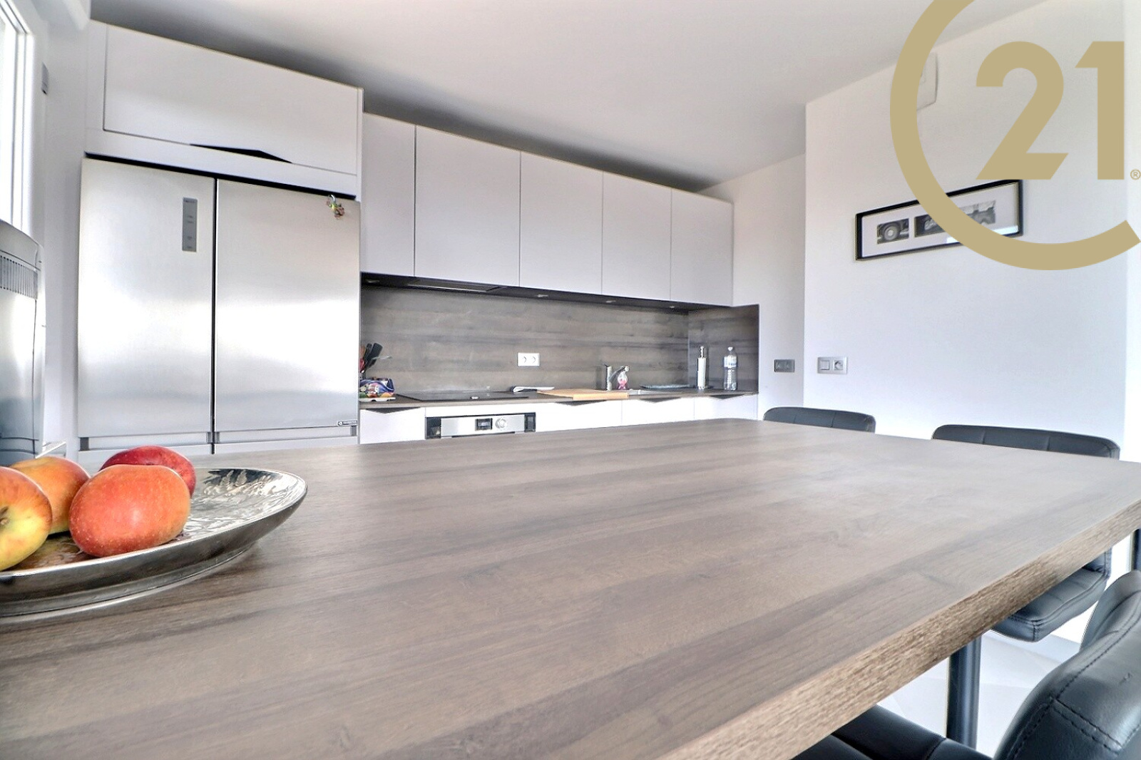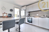 Cet appartement très lumineux offre un hall d'entrée avec dressing aménagé, une spacieuse pièce de vie avec grande cuisine ouverte neuve entièrement équipée dotée d'un grand îlot central avec rangements, deux chambres spacieuses avec placards aménagés, une salle de bains entièrement carrelée et des WC séparés avec lave-mains et espace buanderie.