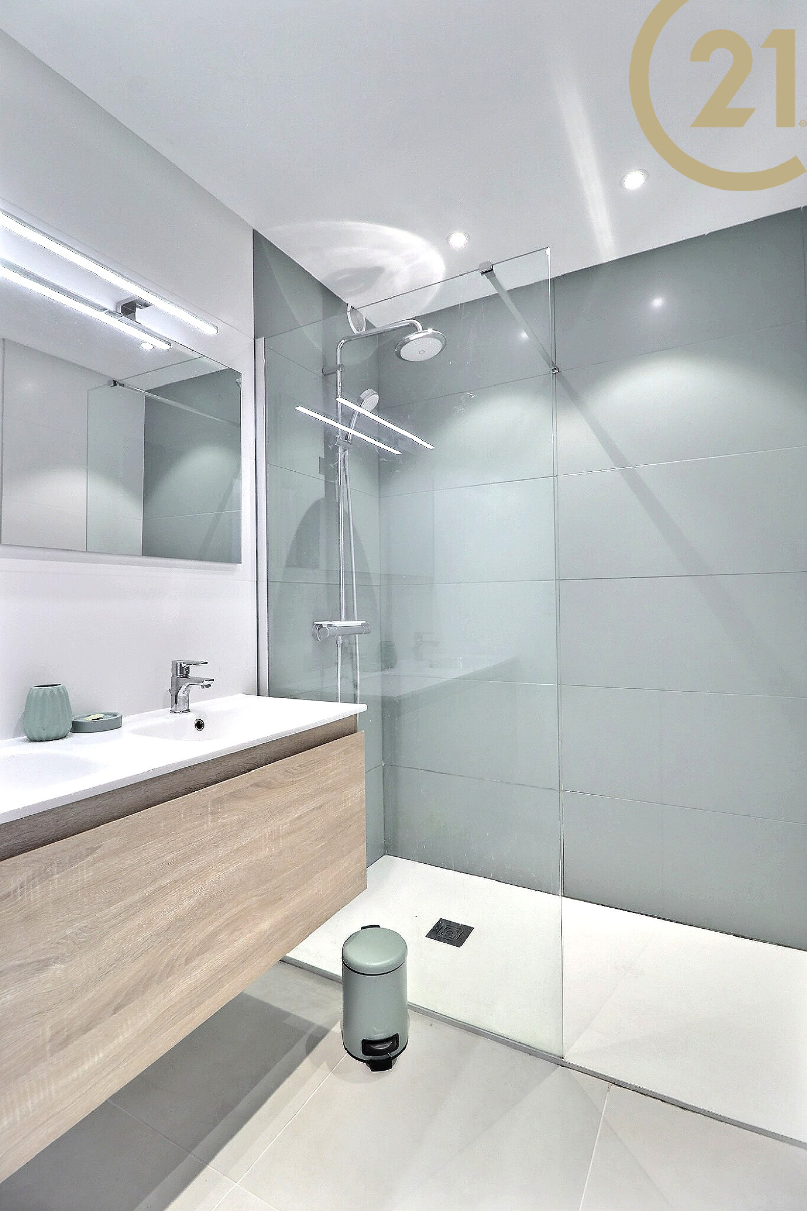Cet appartement entièrement rénové avec goût et idéalement agencé offre un hall d'entrée, un séjour avec mezzanine accueillant un lit double, une cuisine indépendante moderne entièrement équipée avec grand îlot et un cellier/espace buanderie, un dégagement avec placard, deux chambres avec rangements, une salle d'eau dotée d'une grande douche et des WC séparés.