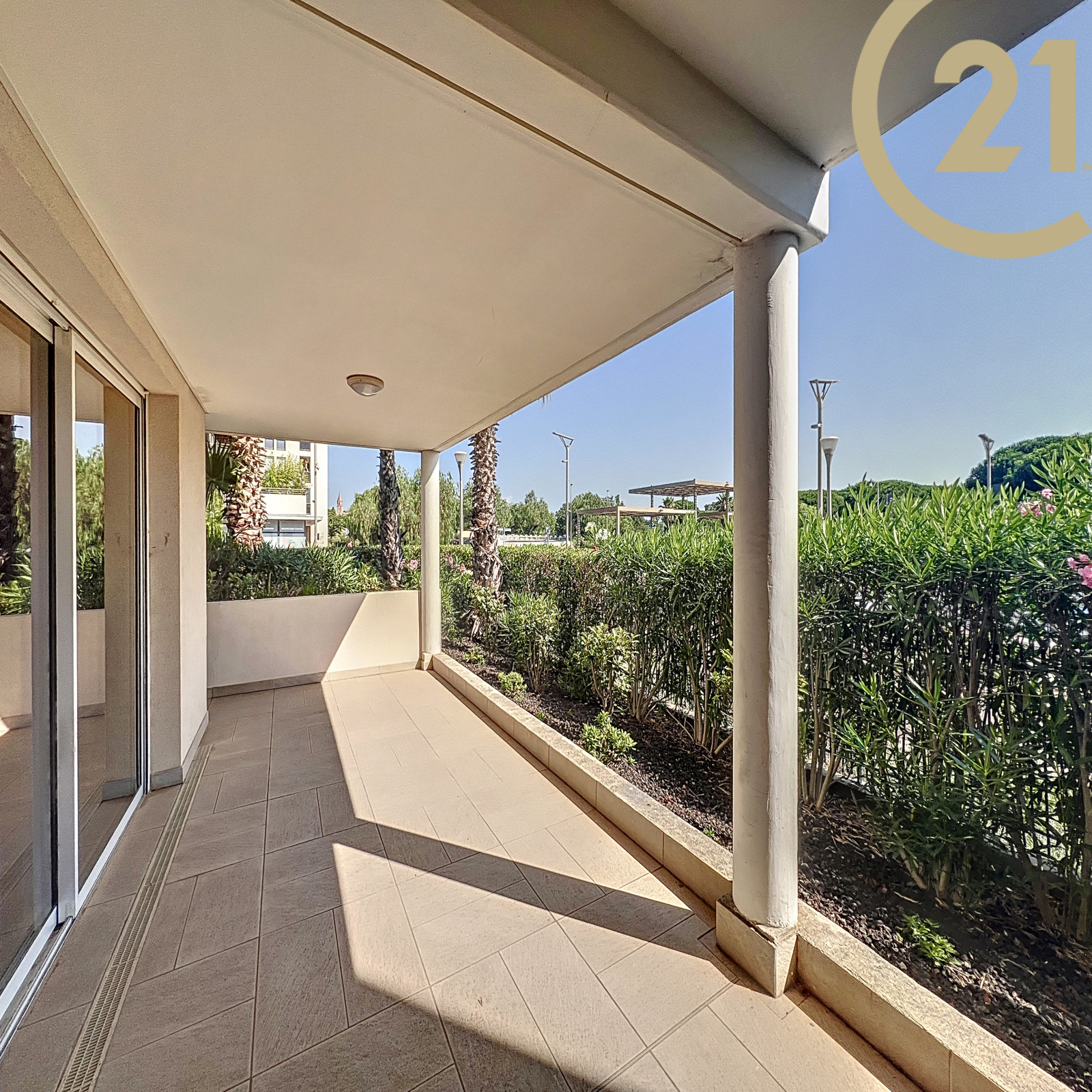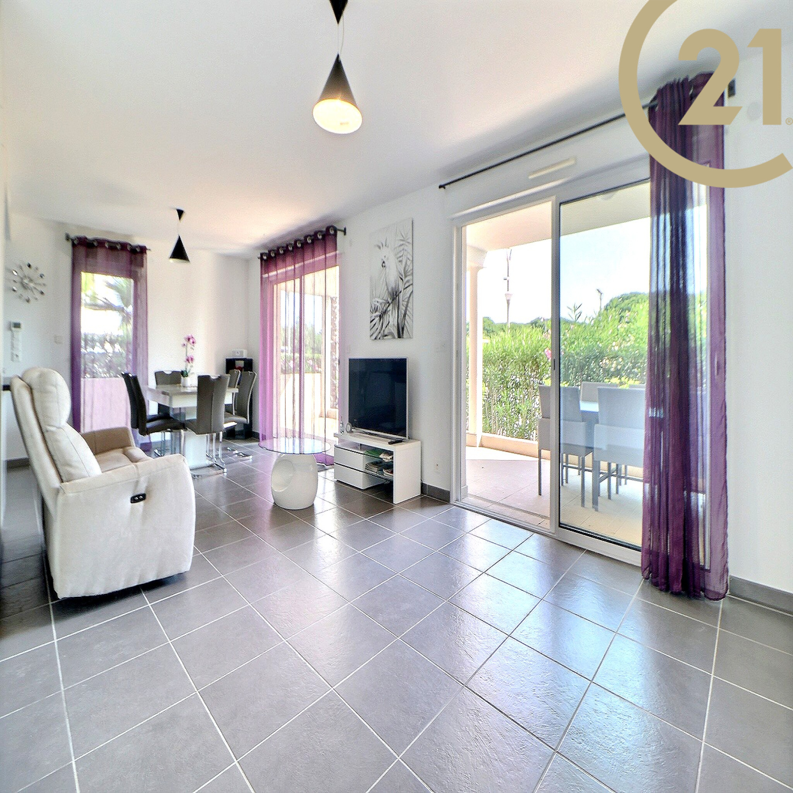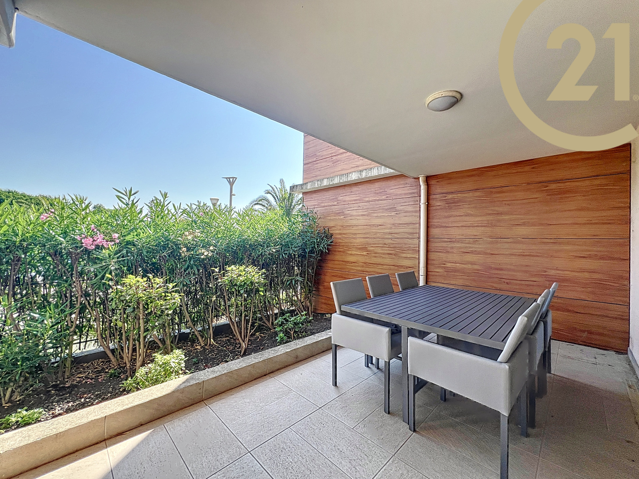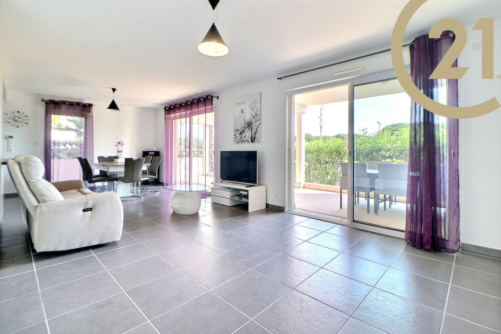 Le séjour offre un accès direct à une spacieuse terrasse de 29 m² donnant sur le canal de Port Fréjus.