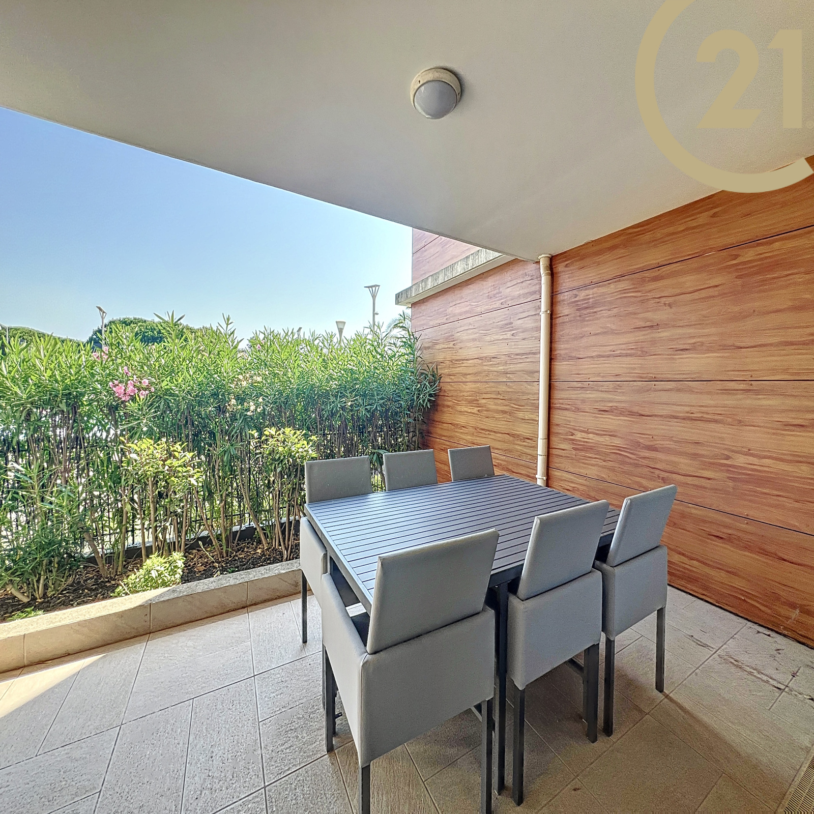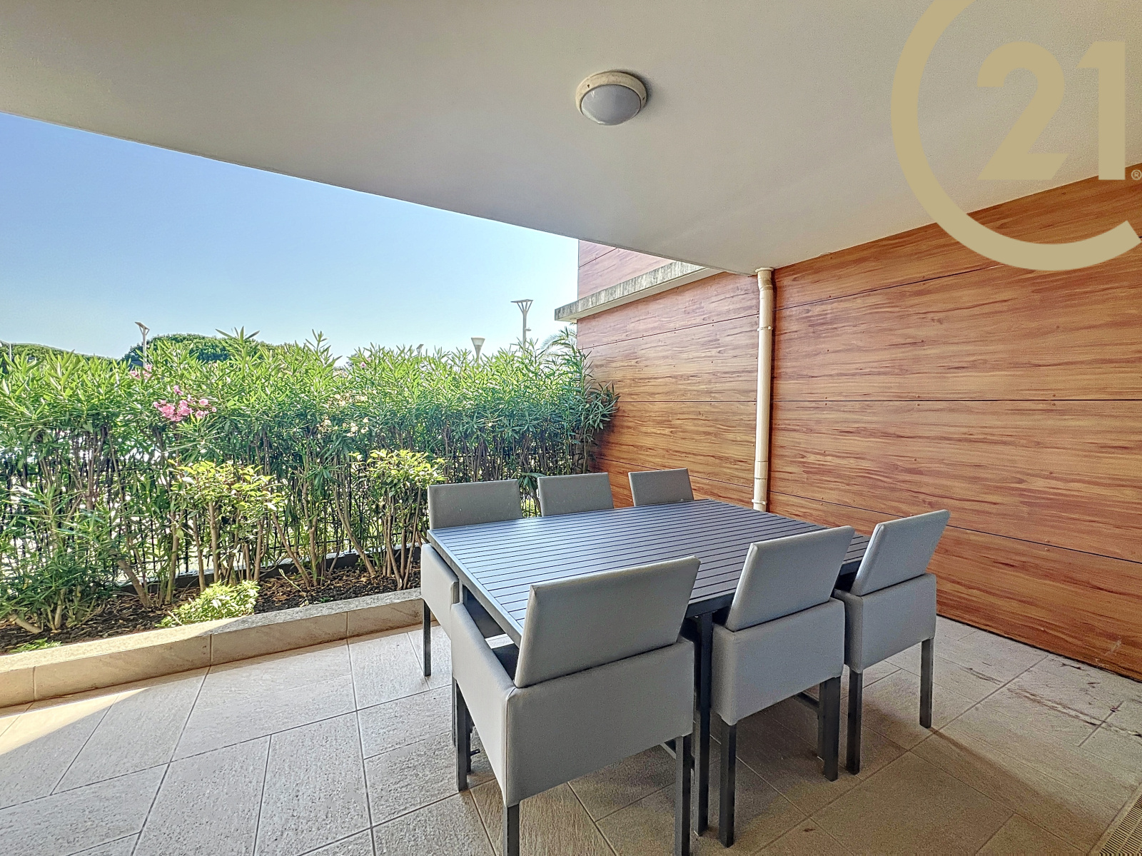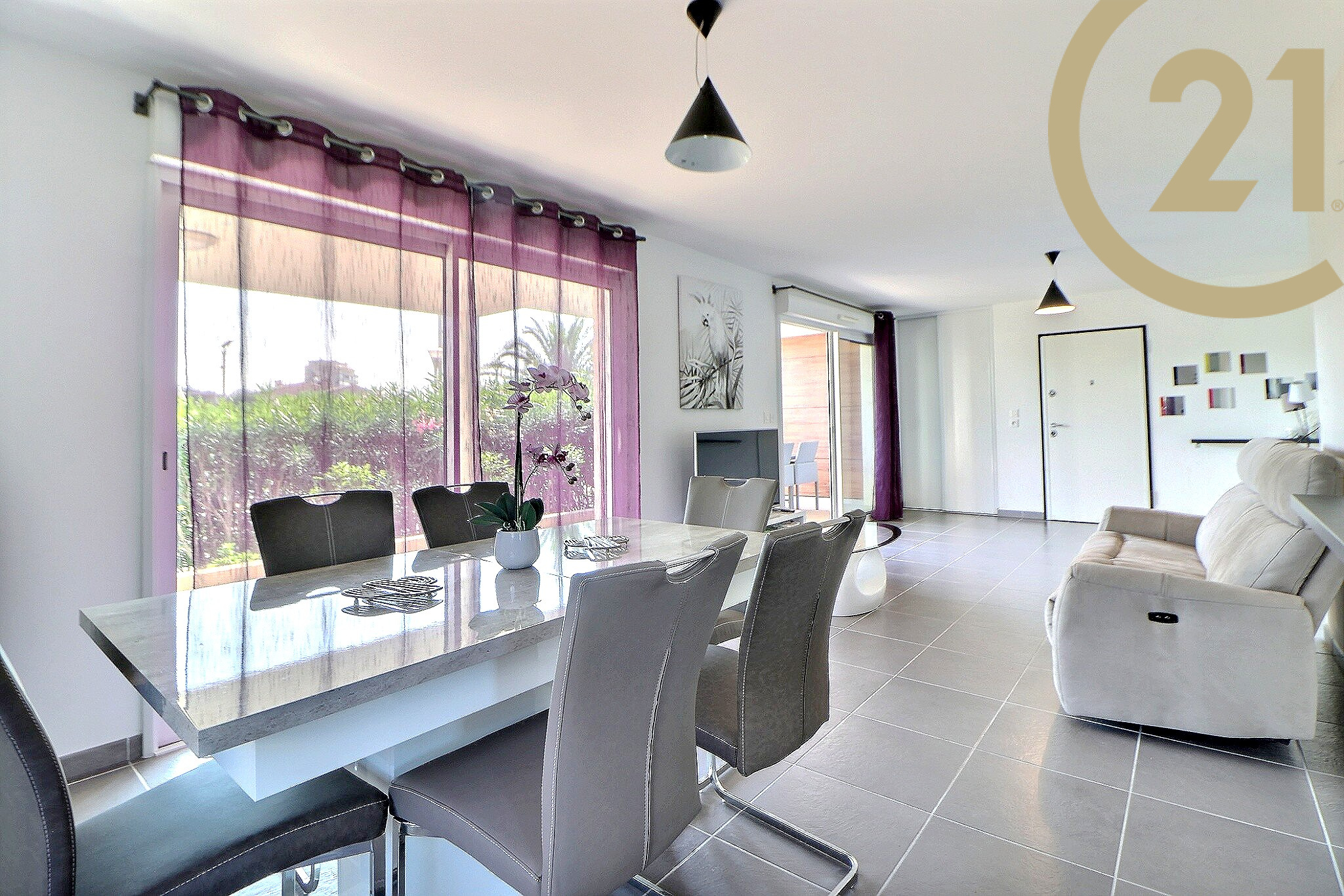 Le séjour offre un accès direct à une spacieuse terrasse de 29 m² donnant sur le canal de Port Fréjus.
