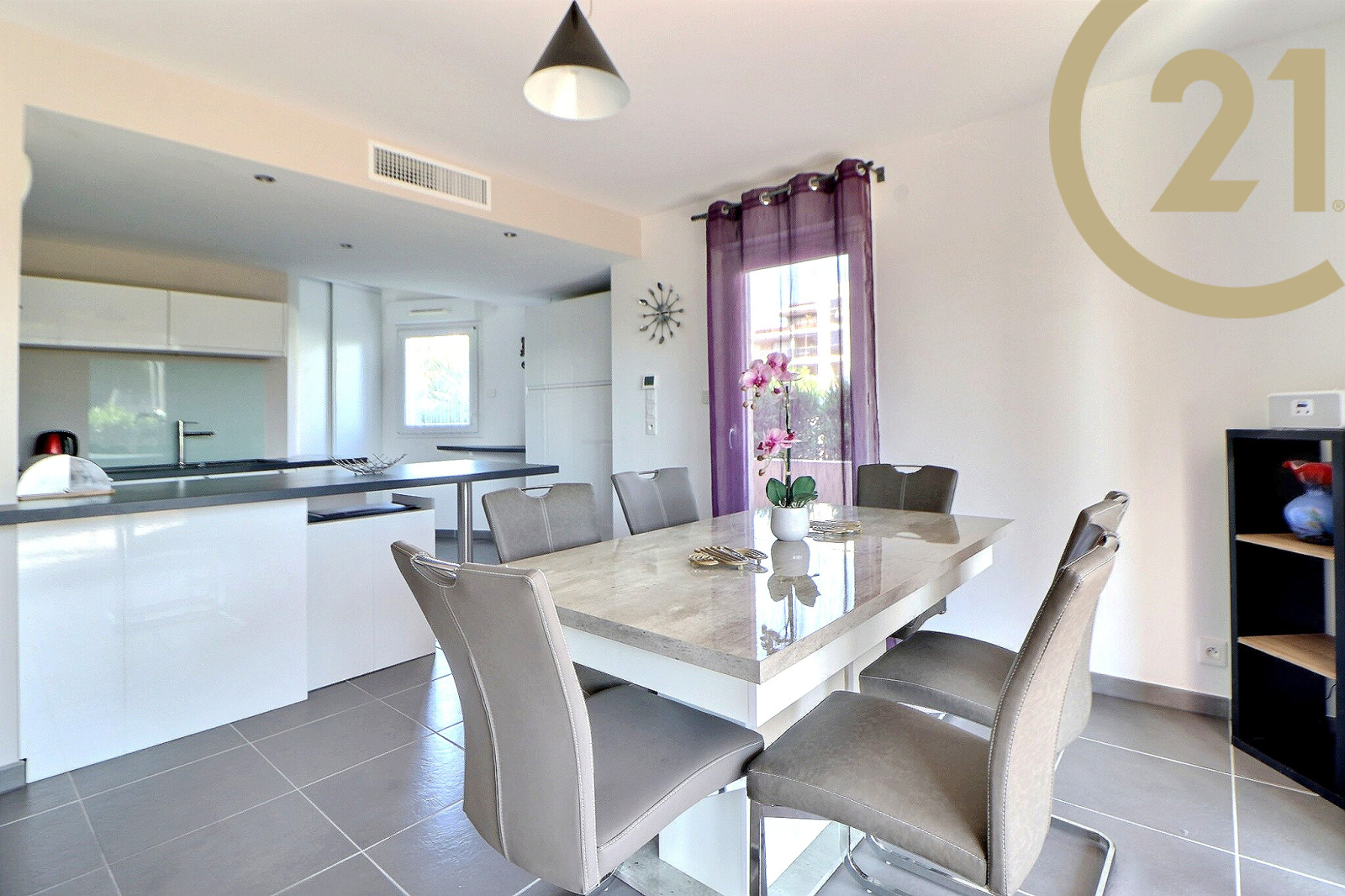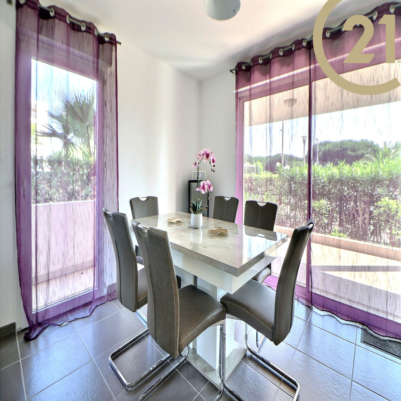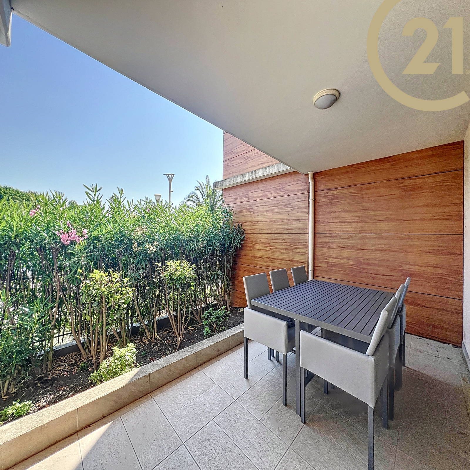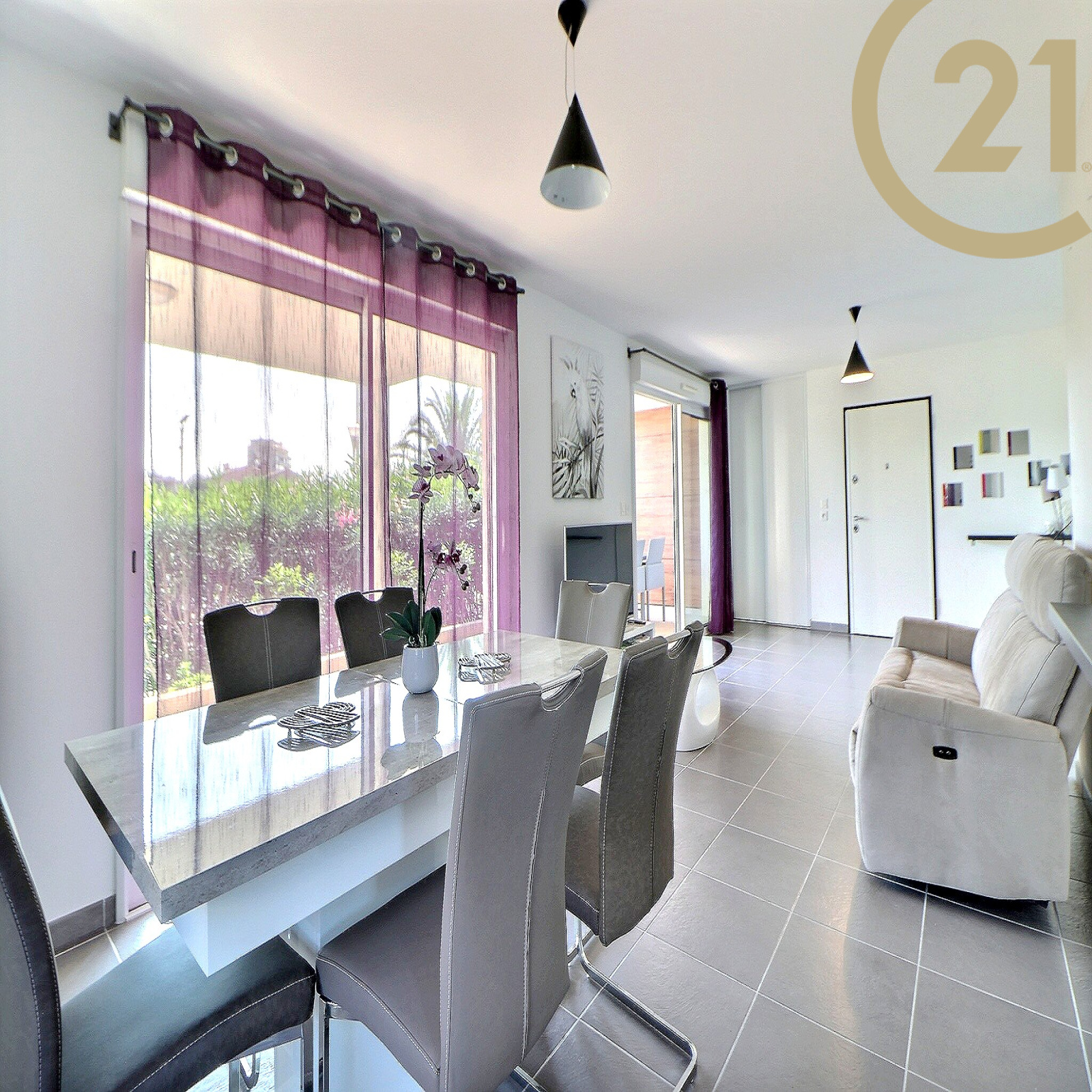 Le séjour offre un accès direct à une spacieuse terrasse de 29 m² donnant sur le canal de Port Fréjus.