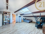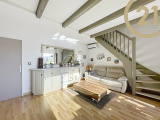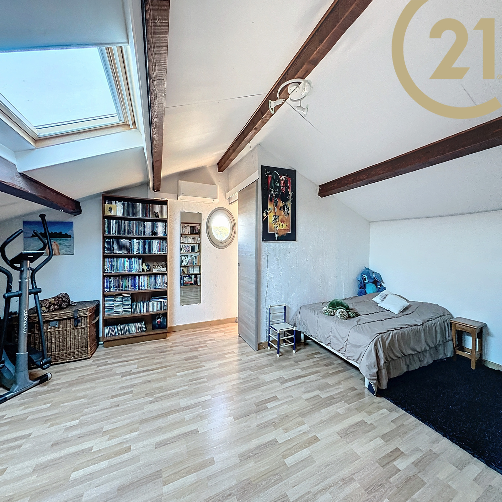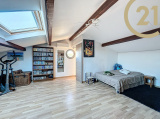 A l'étage : un vaste espace nuit climatisé de 33m² pouvant faire deux chambres et une salle d'eau avec WC ainsi qu'un grenier aménagé permettant un bel espace de stockage.