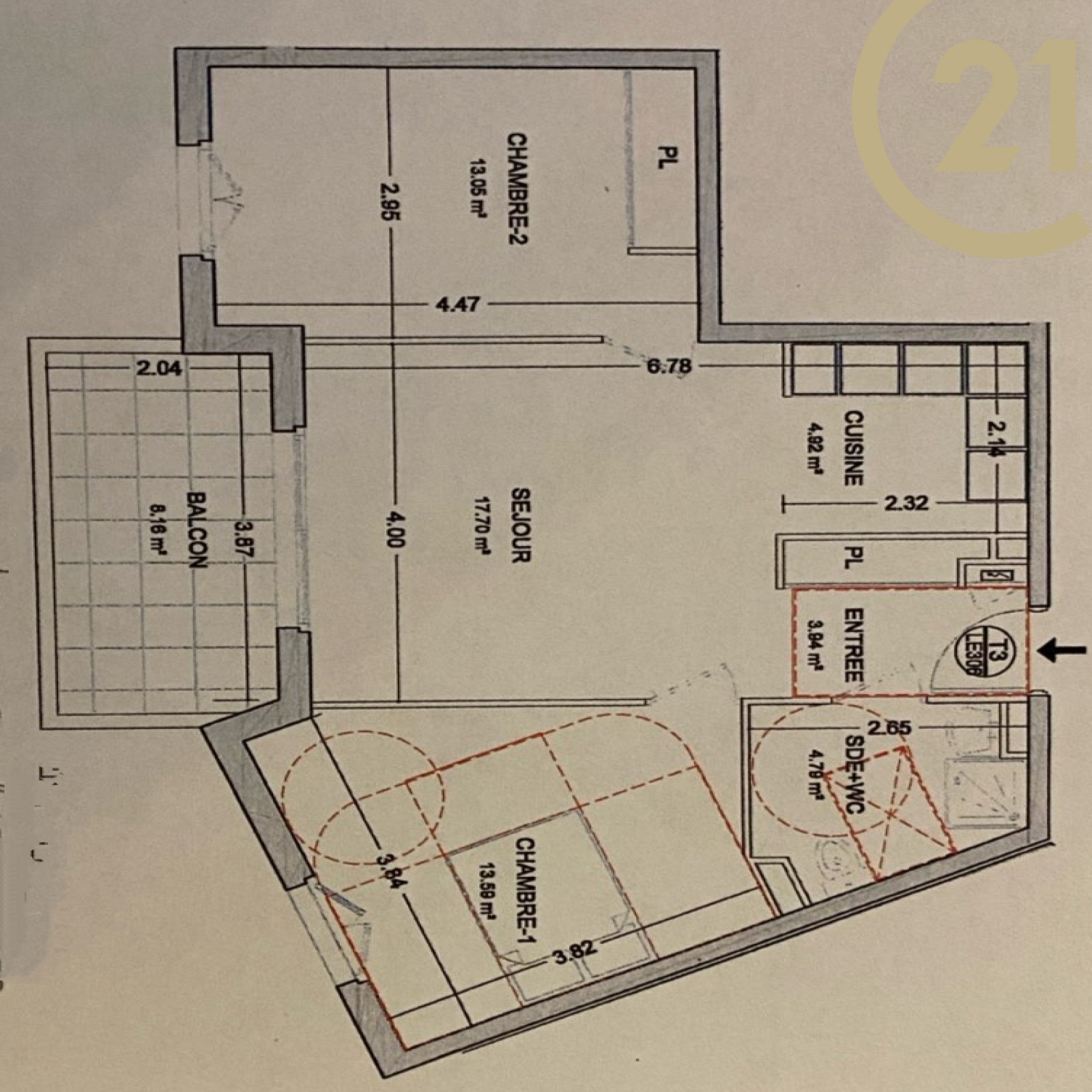 Il comprend une entrée avec placard, une pièce de vie de 24m² avec cuisine ouverte donnant sur une terrasse de 8m² exposée Sud, deux chambres de 11.89 et 13.44m² et une salle d'eau avec WC.