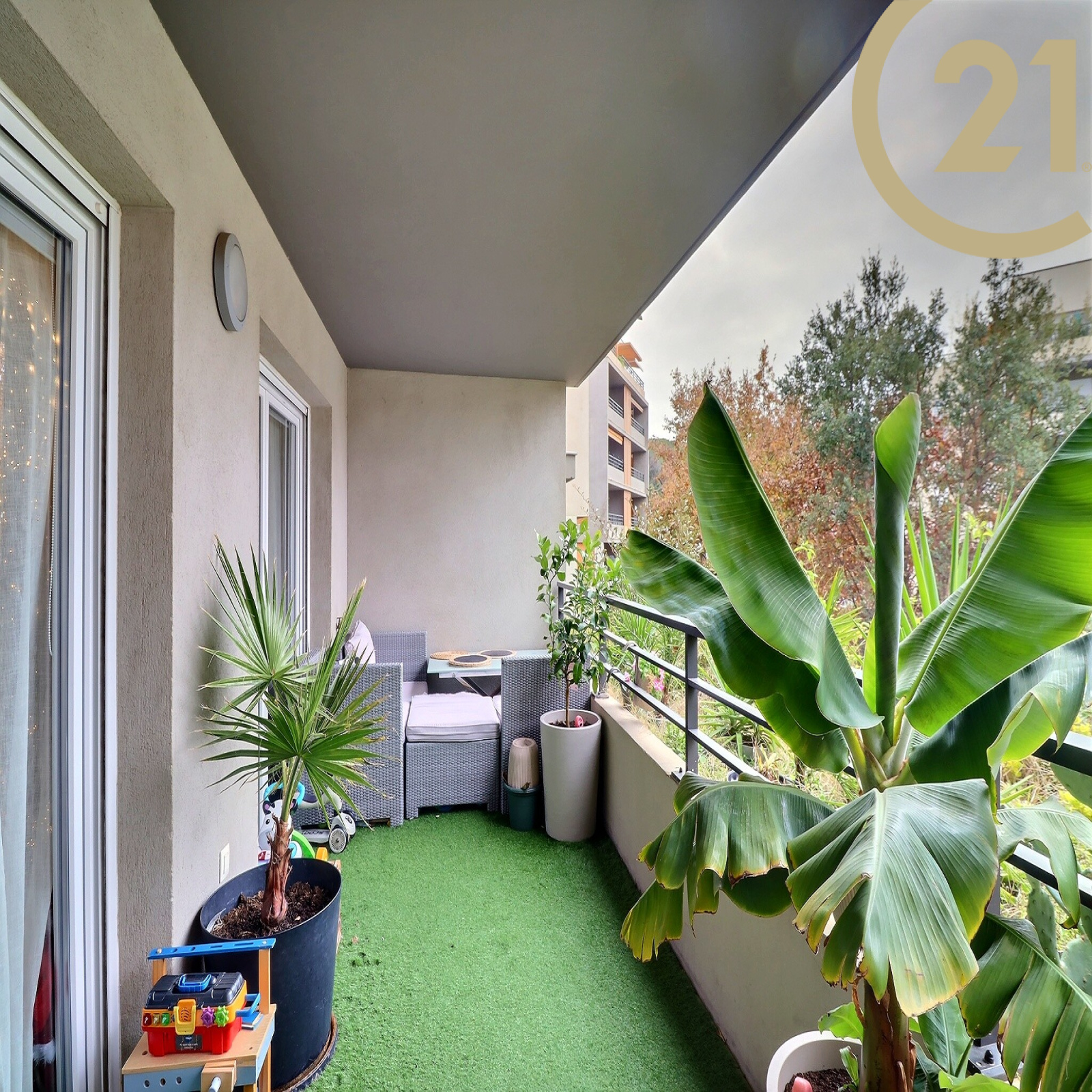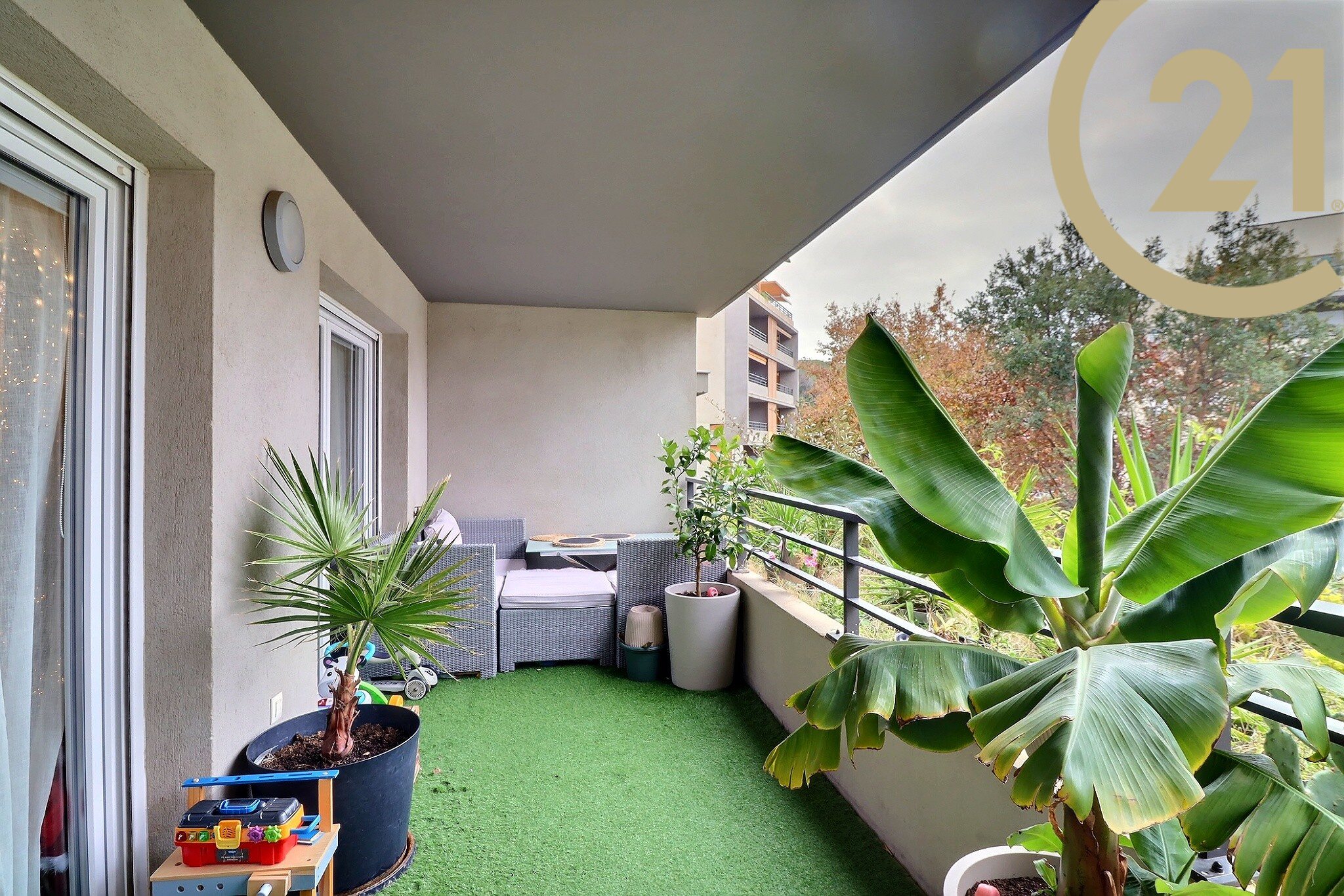 Vous apprécierez également sa confortable terrasse, idéale pour profiter d'un cadre extérieur apaisant, avec vue sur les jardins arborés et la piscine de la copropriété.