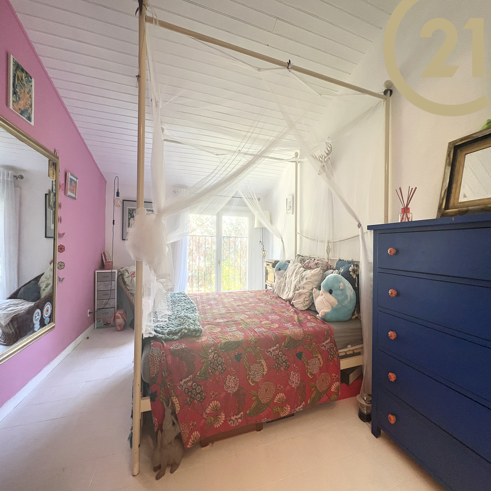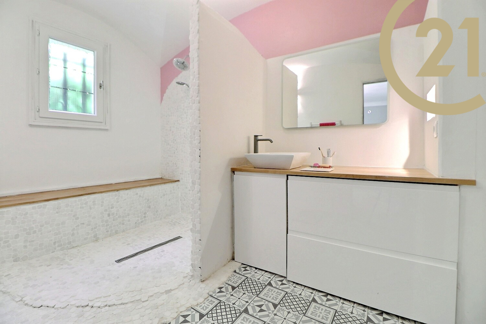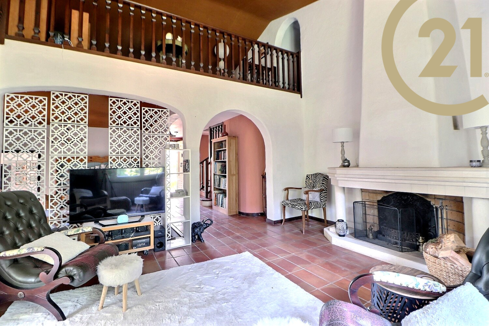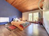 A l'étage : une grande mezzanine de 22 m² avec placards, deux chambres et une salle de bains/WC.