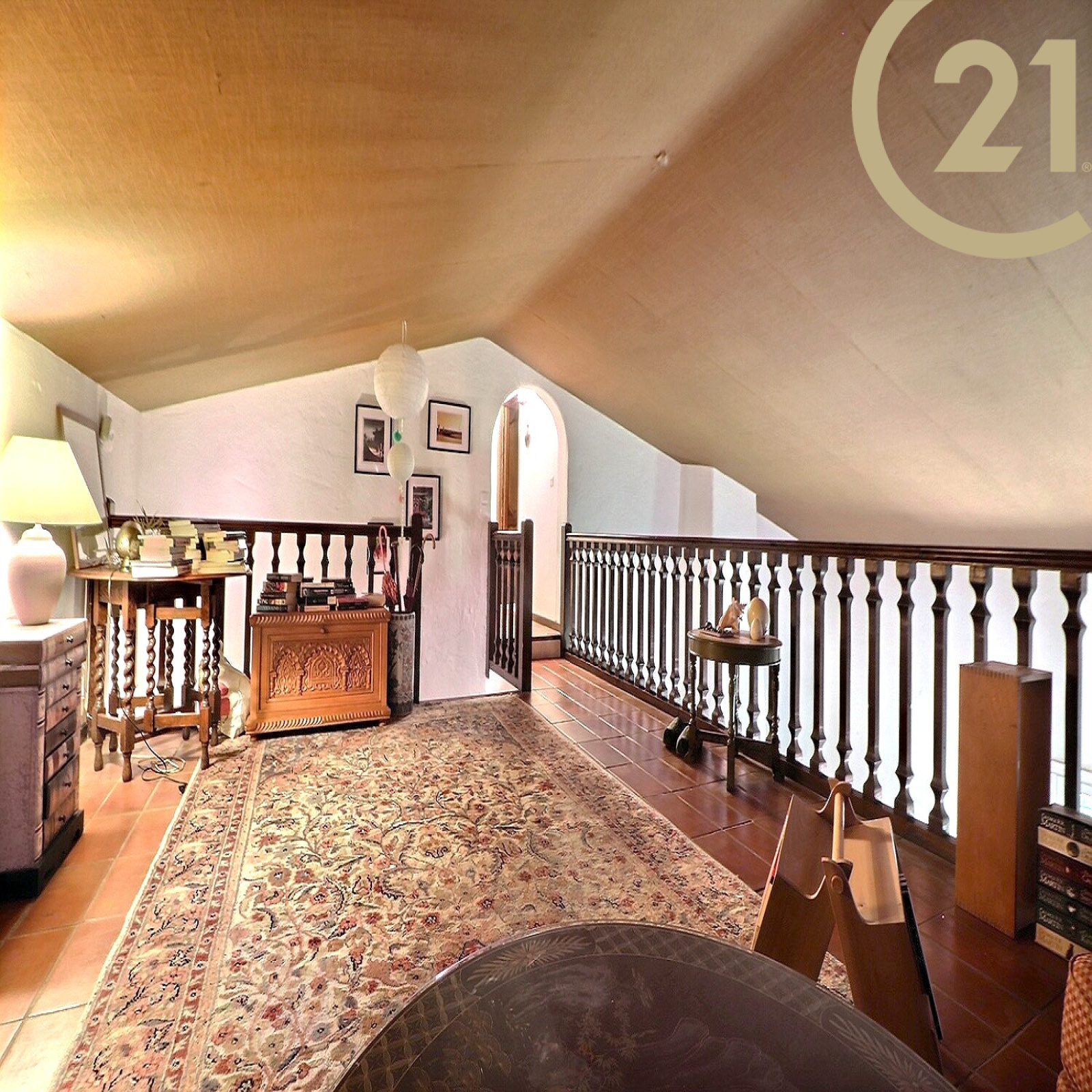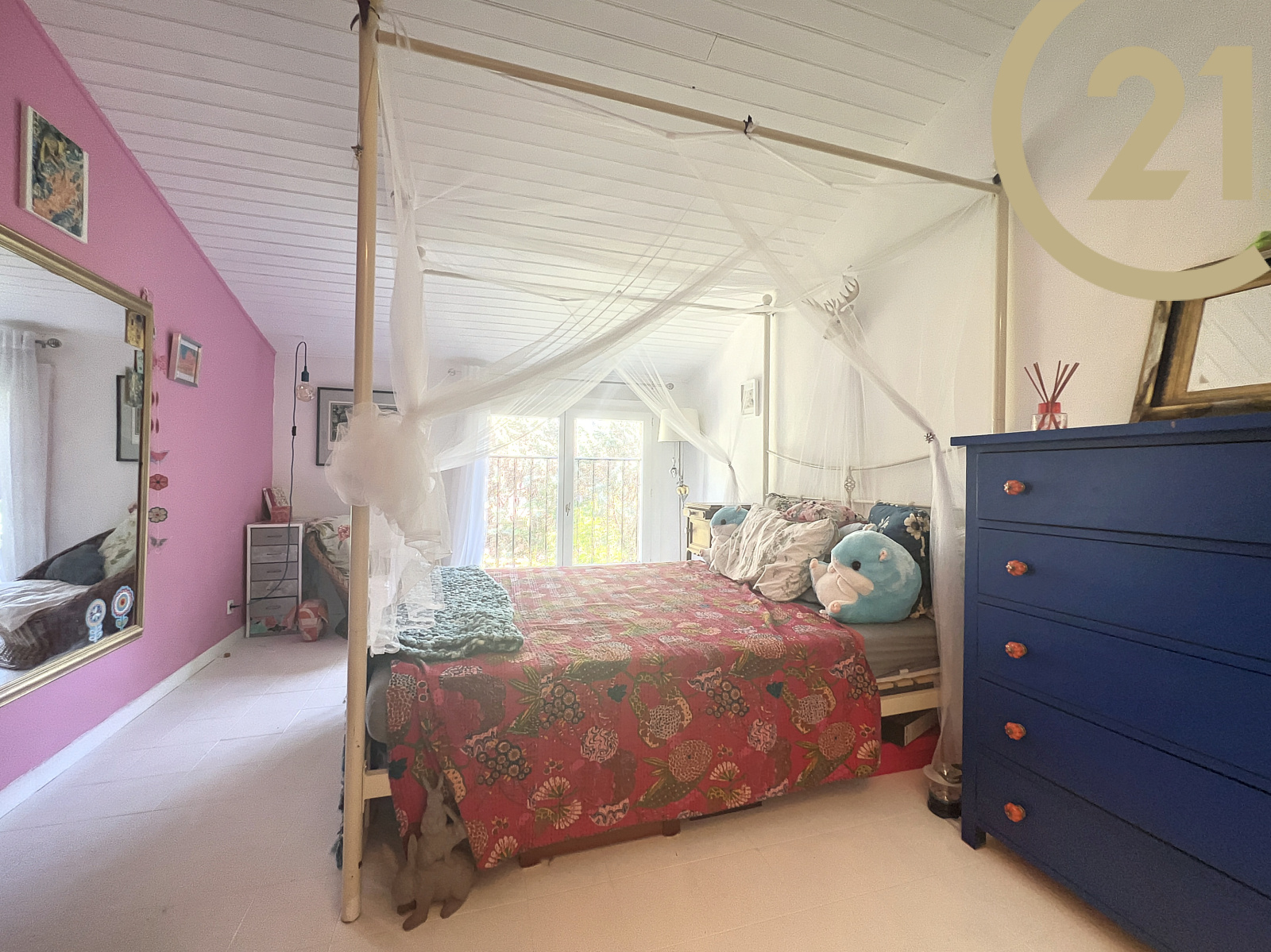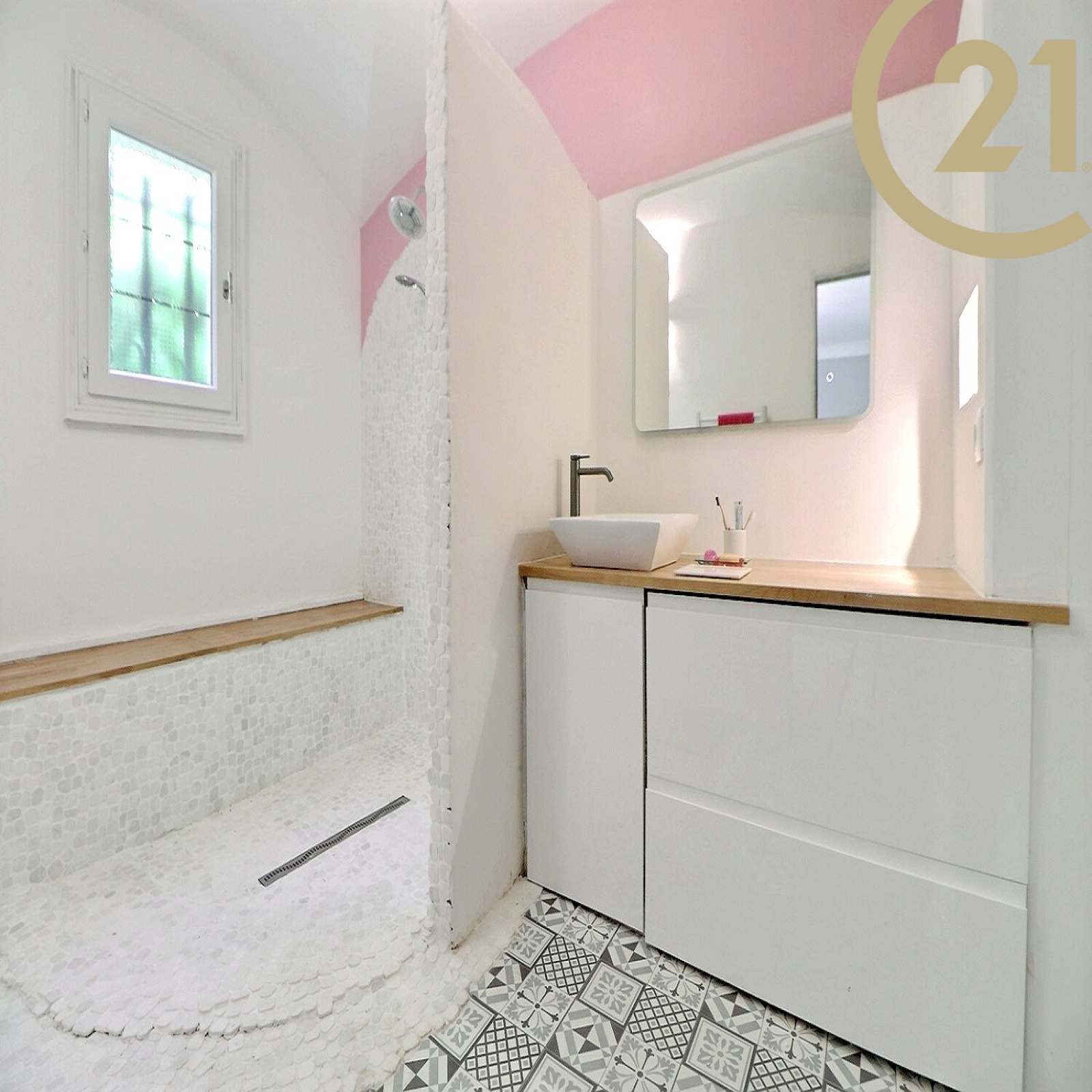 A l'étage : une grande mezzanine de 22 m² avec placards, deux chambres et une salle de bains/WC.