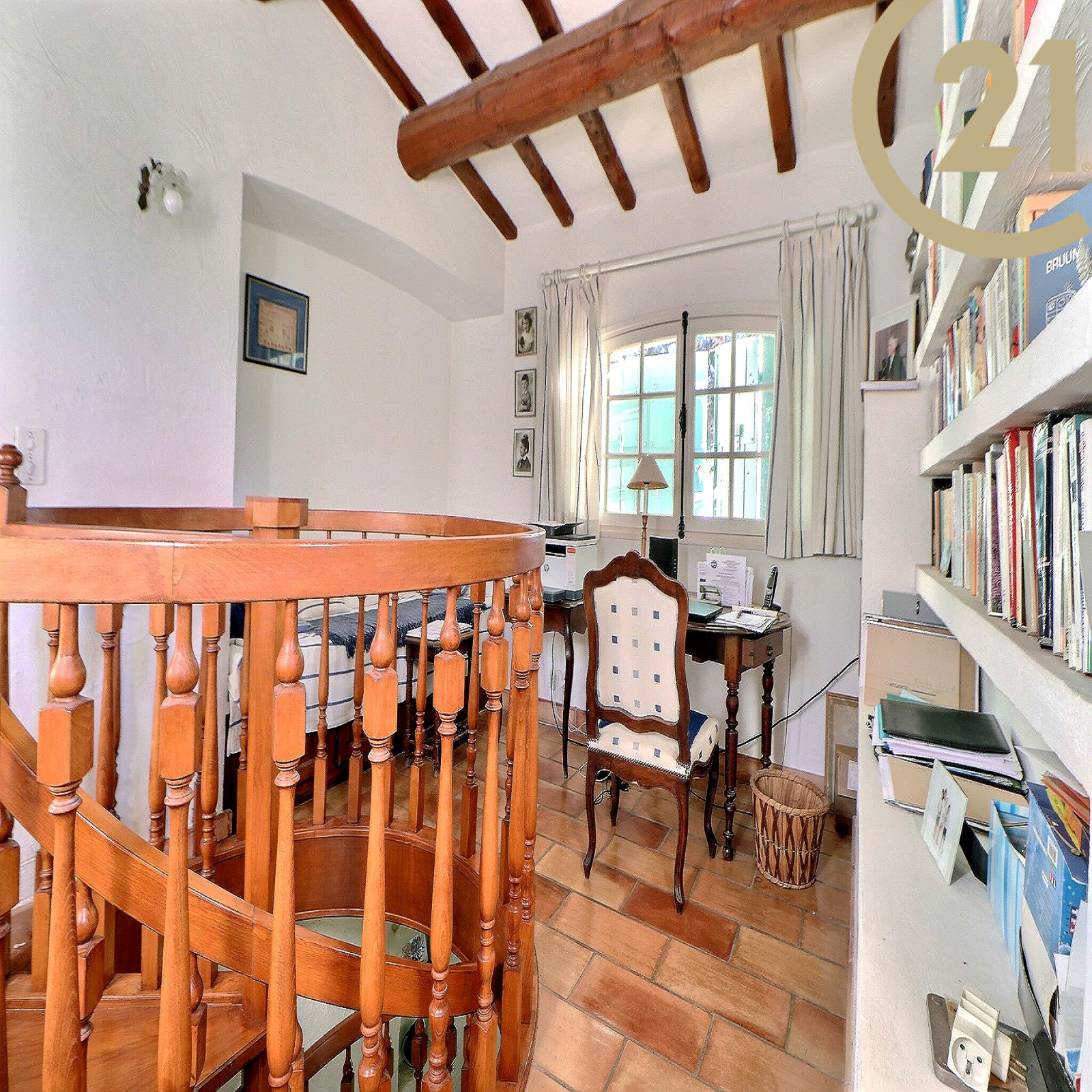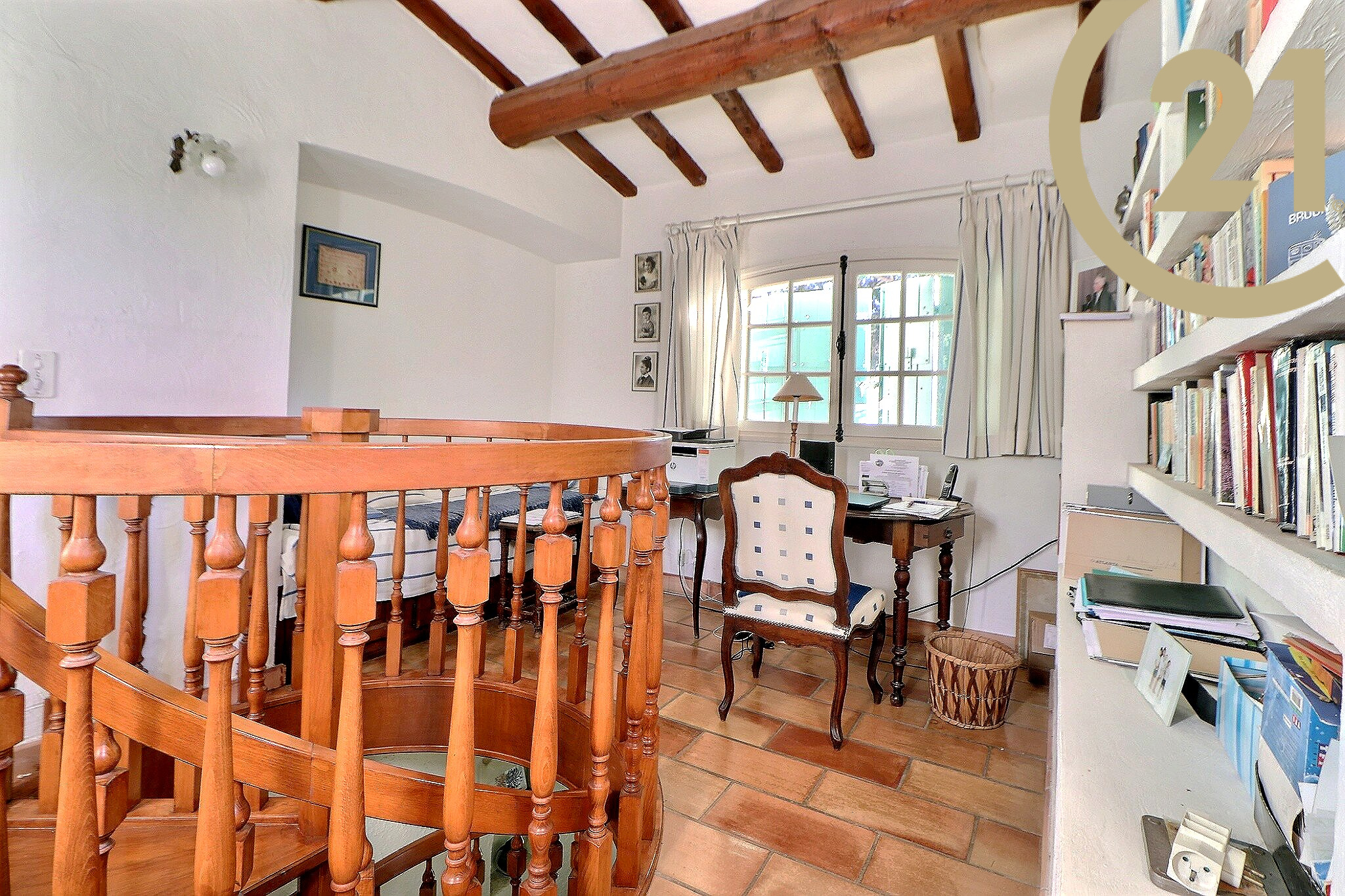 L'étage offre un dégagement avec coin lecture bénéficiant d'une superbe vue mer, ainsi qu'une grande suite de 35 m² avec salle d'eau et coin cuisine.