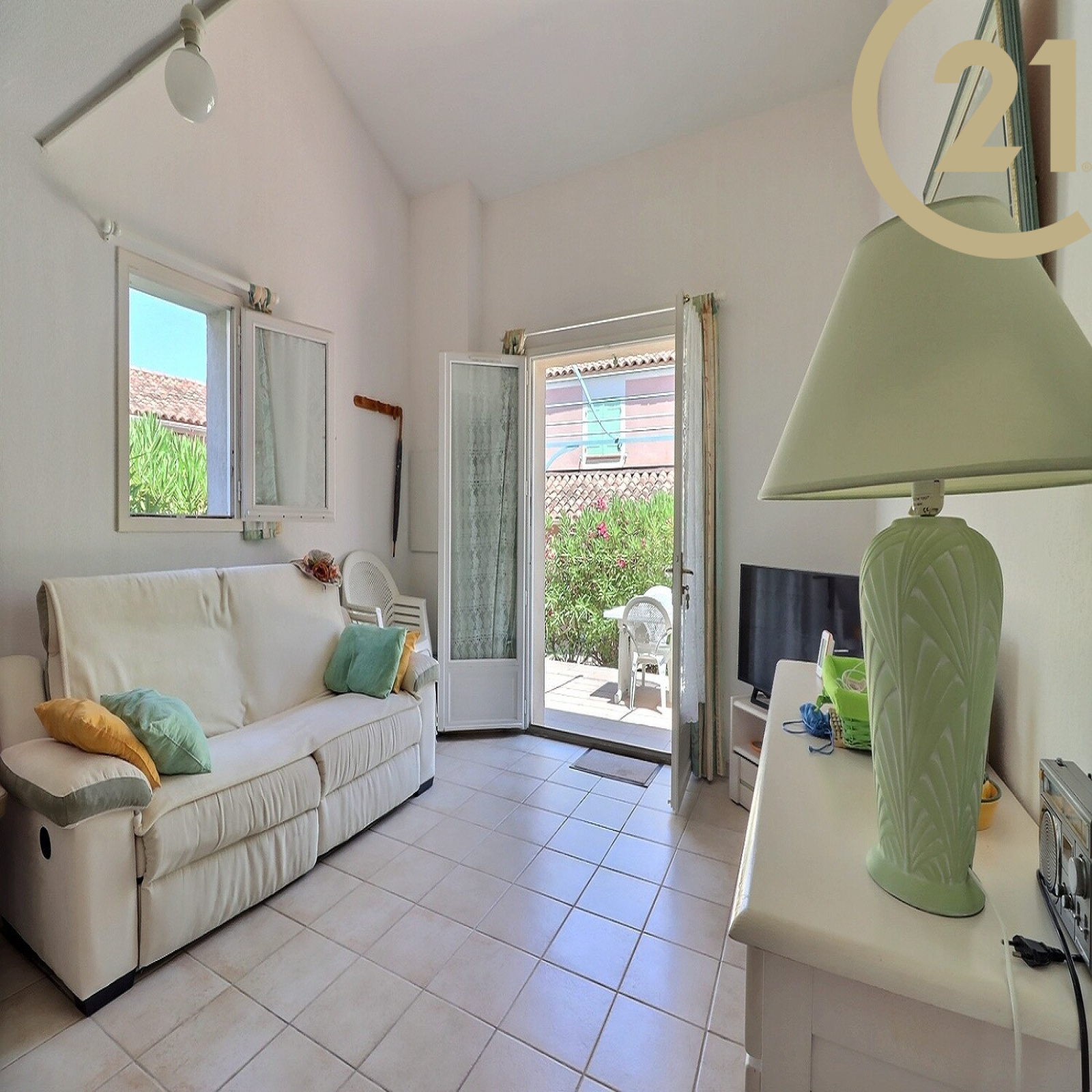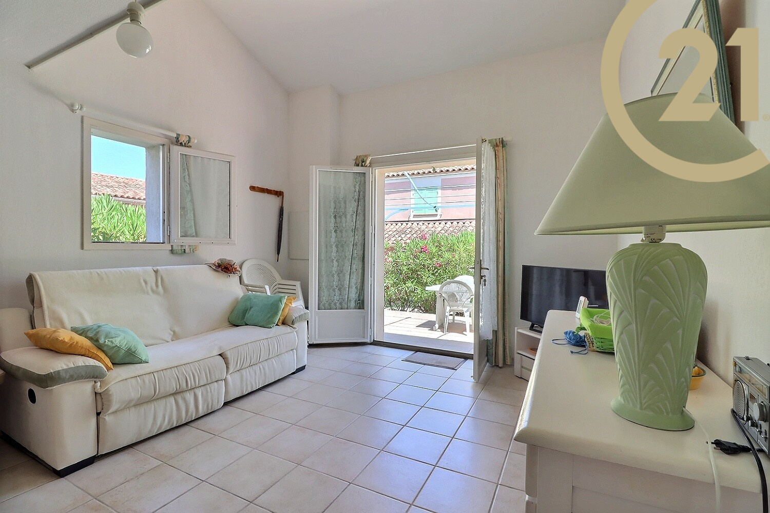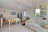 Un agréable salon-séjour donne sur une terrasse de plus de 20m² équipée de son cabanon de rangement.