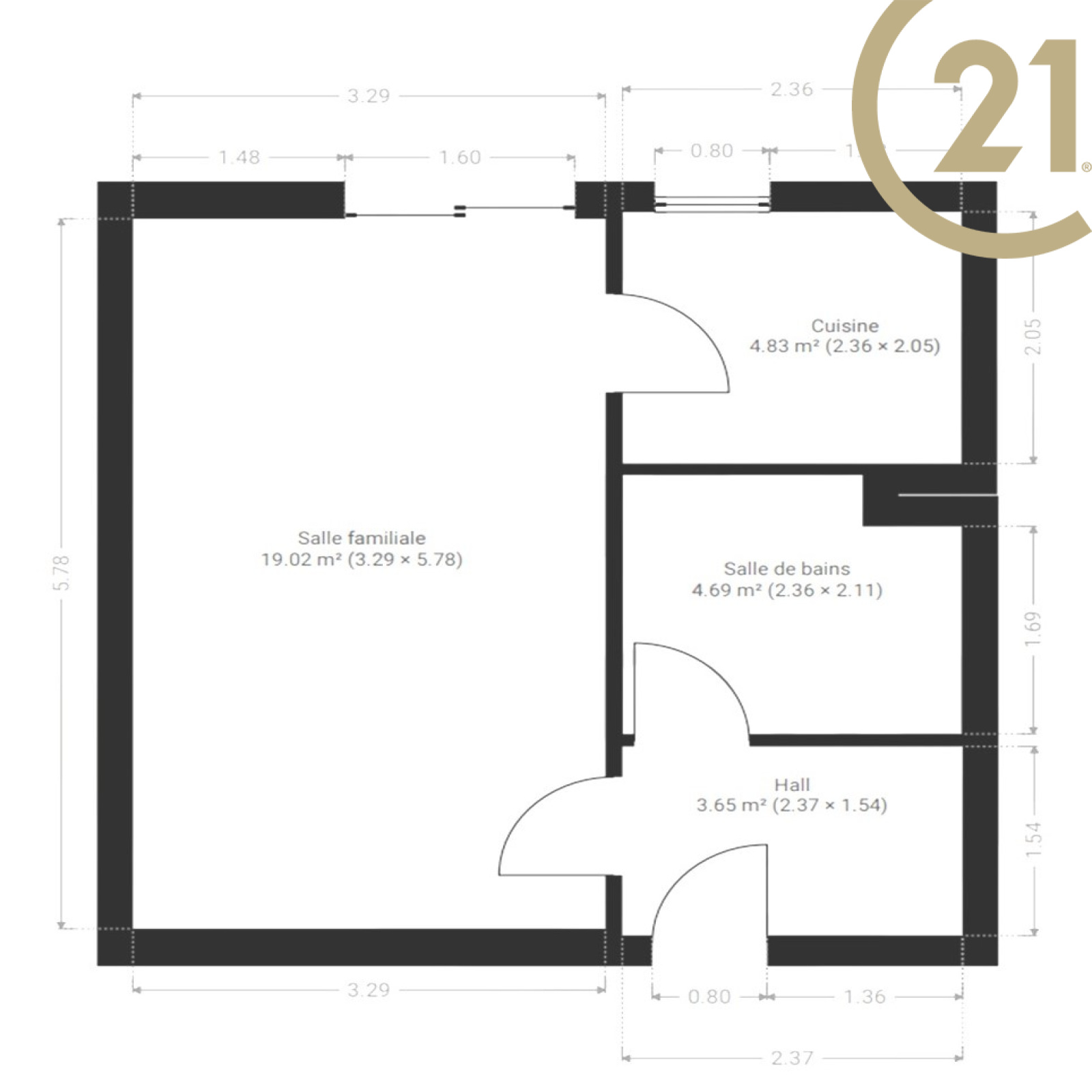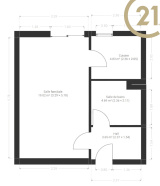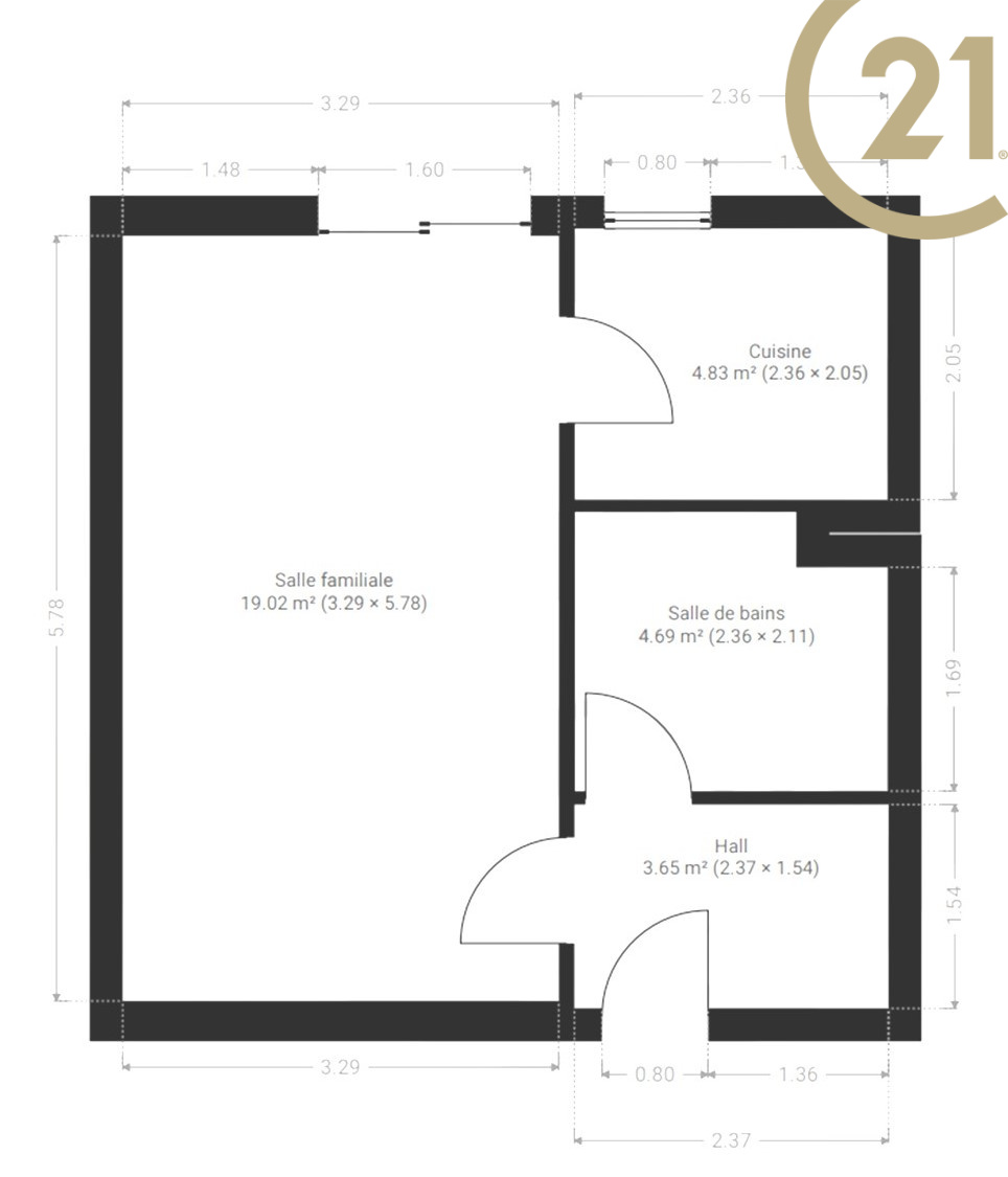 Il comprend une entrée avec placard (3.65m²), un grand salon séjour (19m²) avec balcon, une cuisine indépendante (4.83m²) et une salle de bains avec WC (4.69m²).