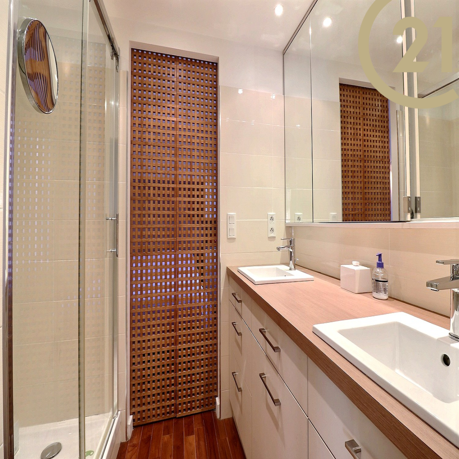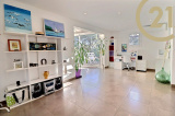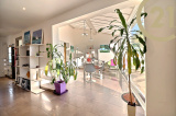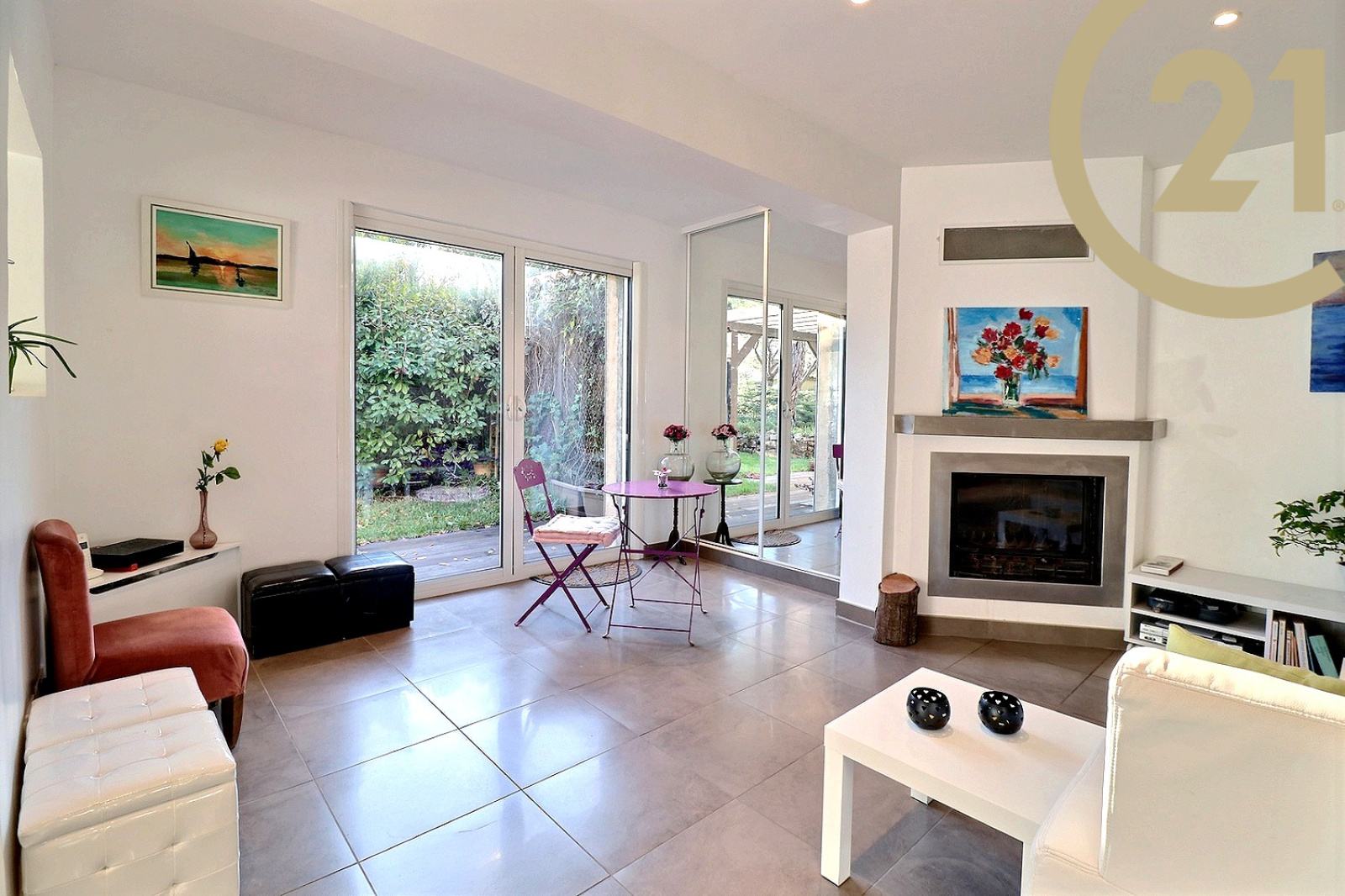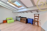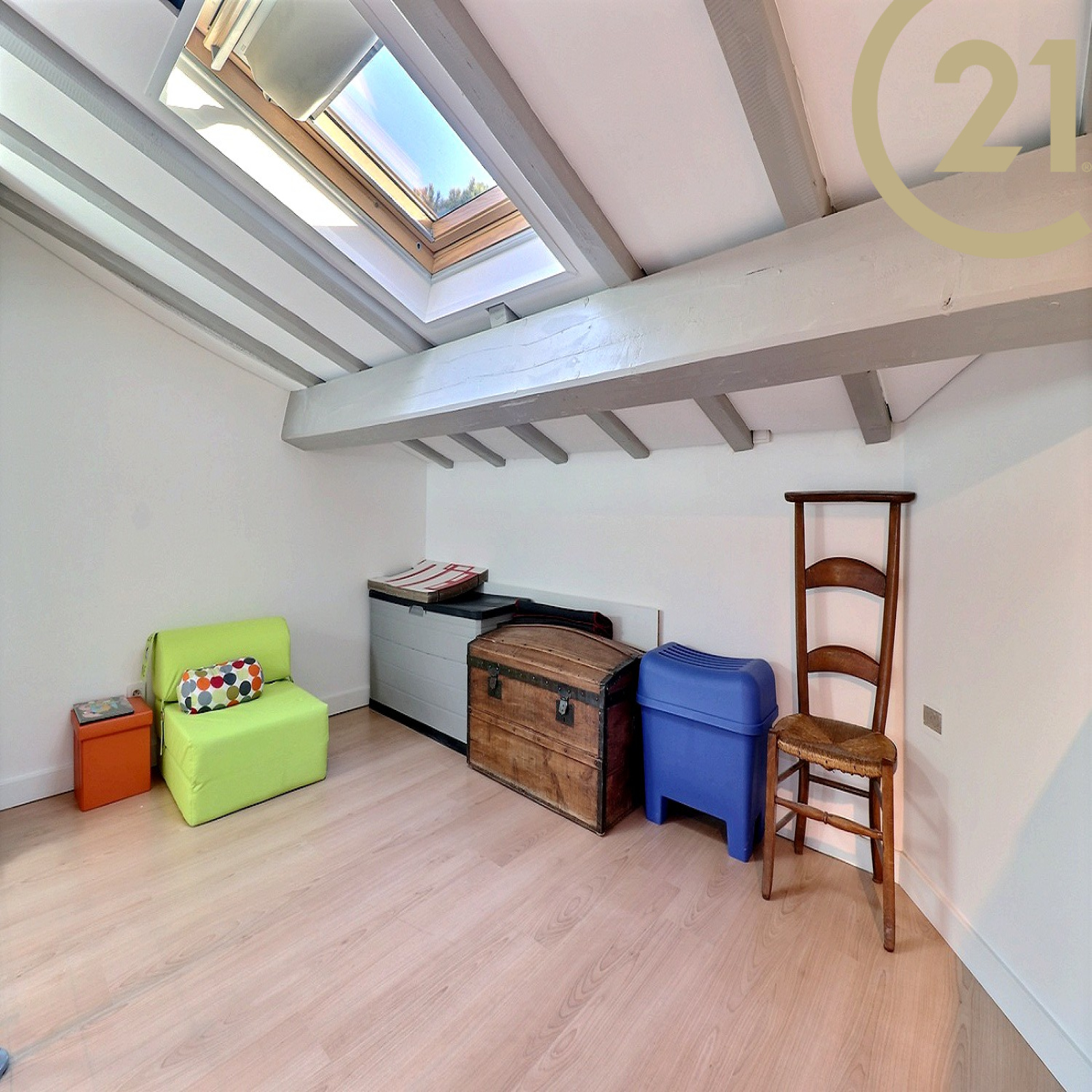 Elle se compose : d'une entrée avec placard, d'un double séjour lumineux avec poutres apparentes, d'une cuisine ouverte entièrement équipée et aménagée, d'une véranda, d'une suite parentale avec salle d'eau, d'un WC indépendant et d'un cellier. A l'étage : une chambre avec salle d'eau et WC, un espace mezzanine et des combles aménagées. Possibilité d'aménager une troisième chambre. Le séjour donne sur un jardin arboré de 300 m² sans vis à vis. Place de parking privative. Belles prestations : double vitrage, volets roulants électriques, climatisation dans toutes les pièces.