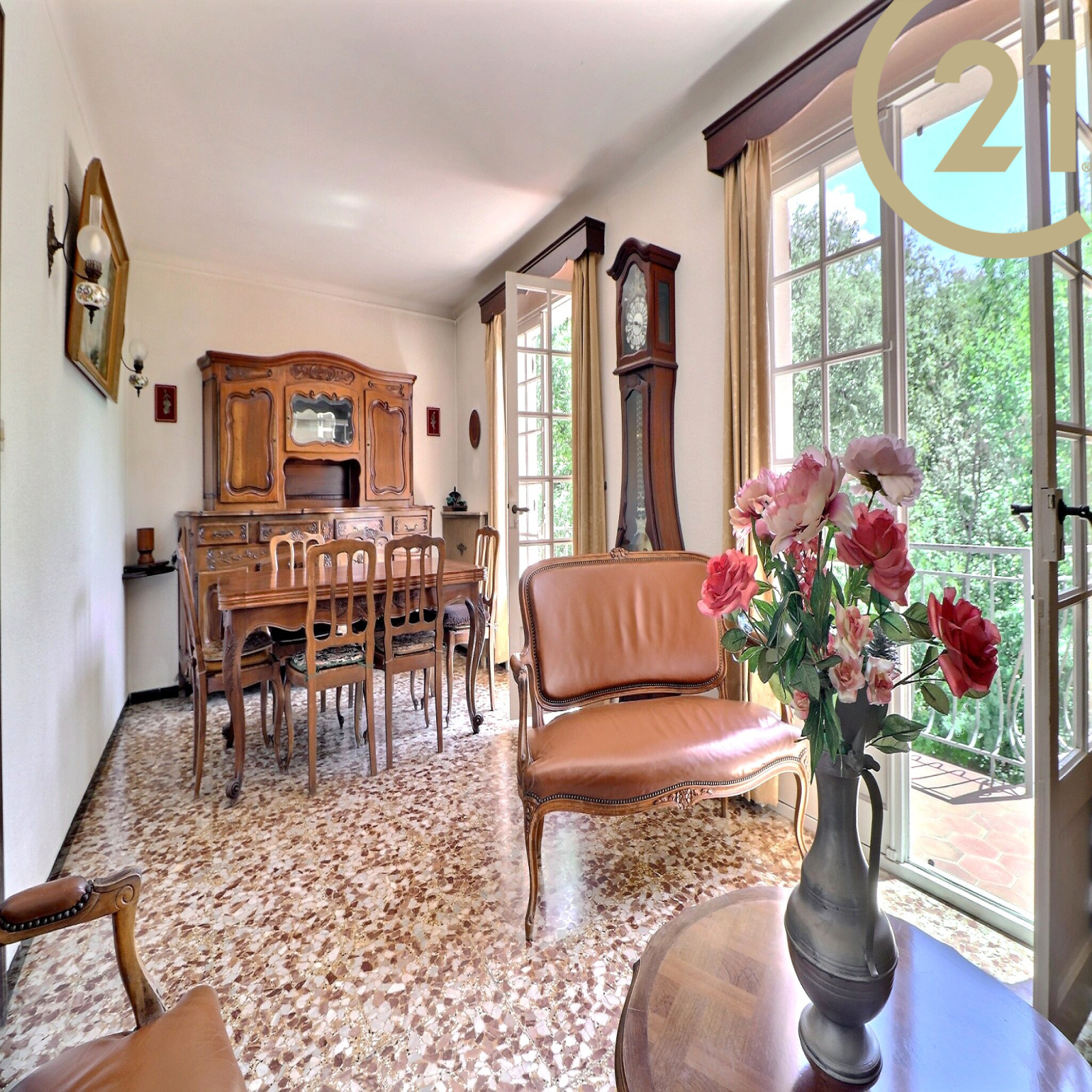 Au rez-de-chaussée : un appartement trois pièces avec entrée, séjour et cuisine ouverte, deux chambres, salle de bains et WC séparé. Le séjour donne sur une grande terrasse exposée Sud-Est avec vue dégagée.