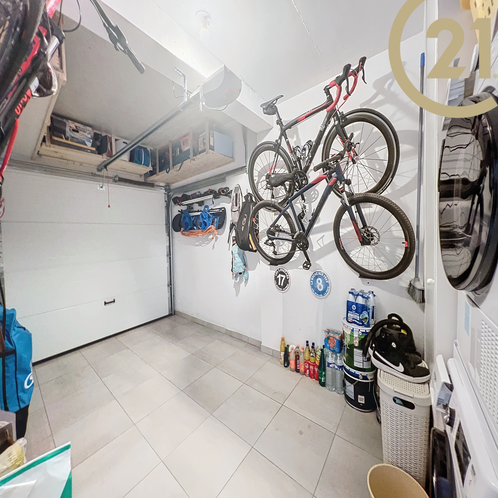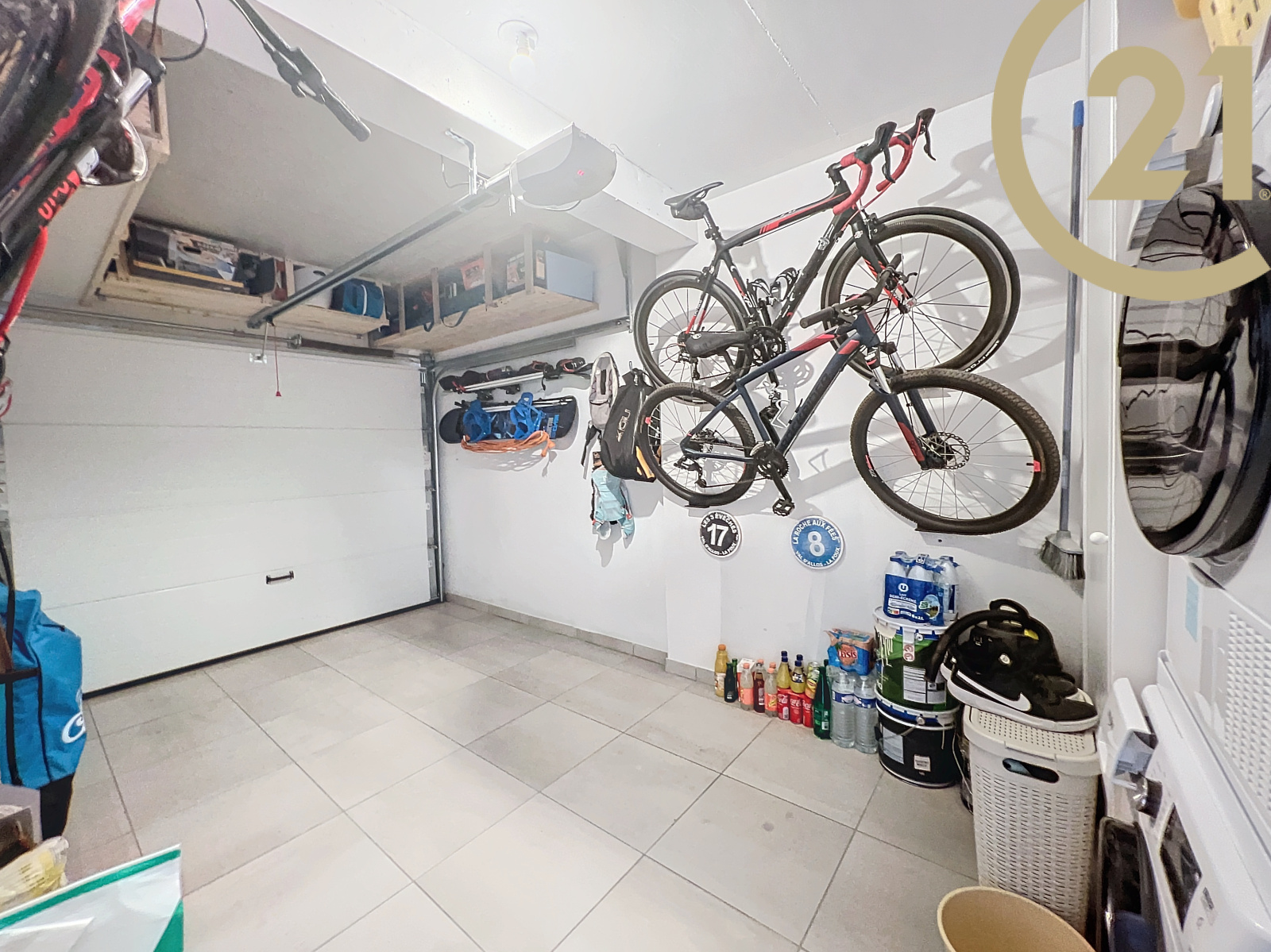 Grand garage motorisé de 13.25 m² avec espace buanderie et prise pour véhicule électrique.