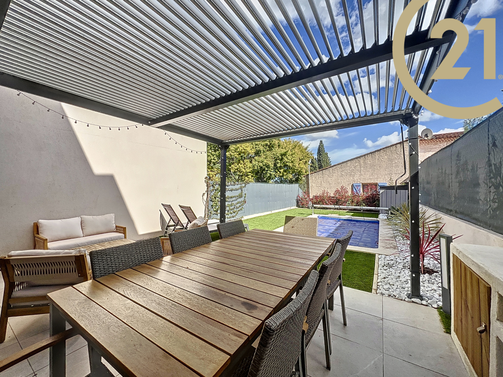 Le séjour donne sur un extérieur de 82 m² nécessitant peu d'entretien. Belle piscine et terrasse avec pergola.