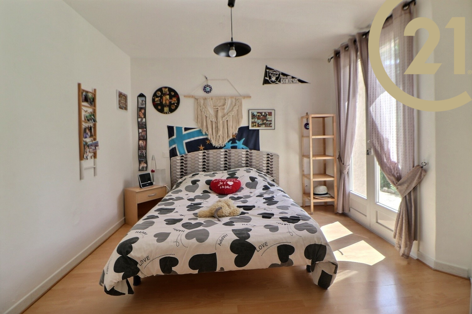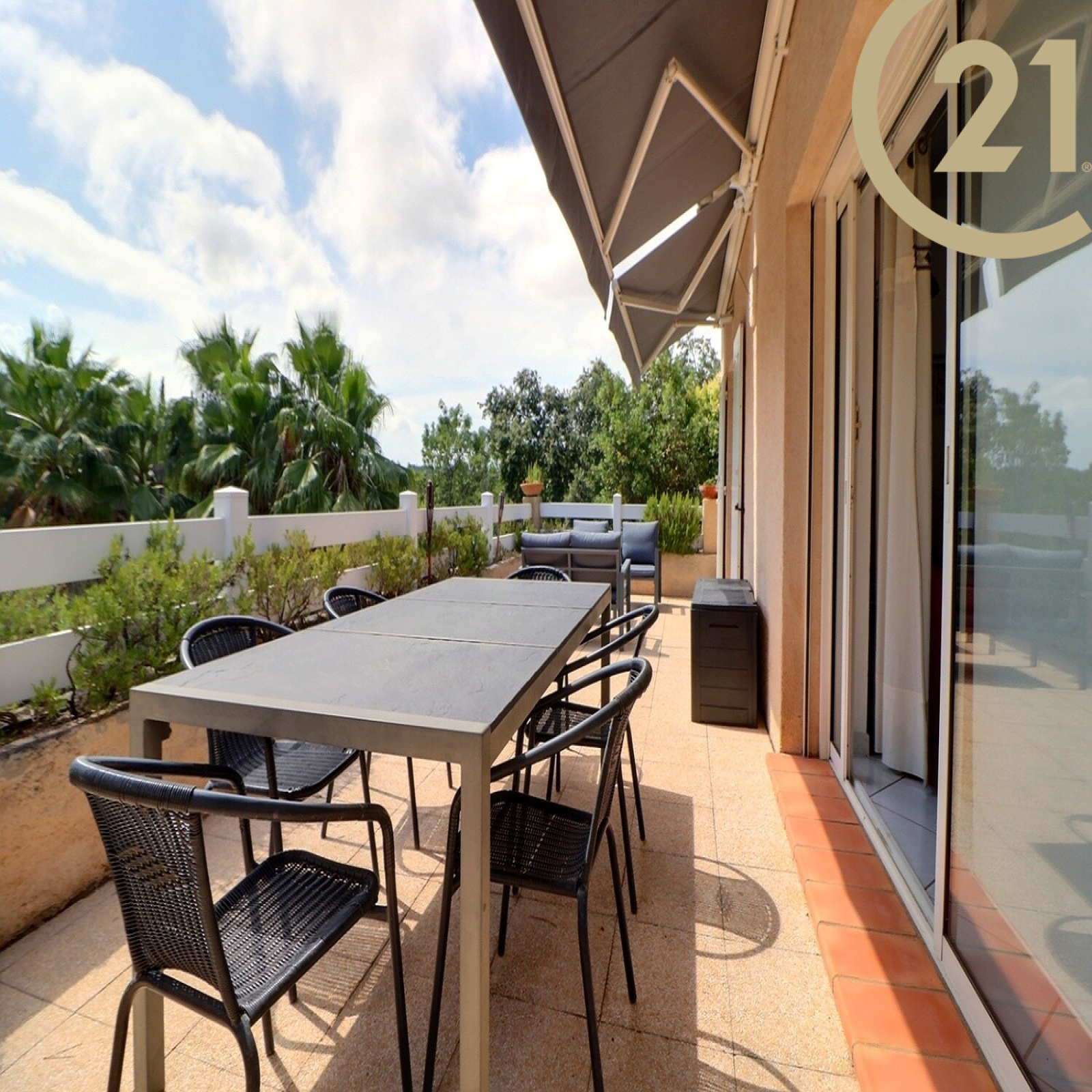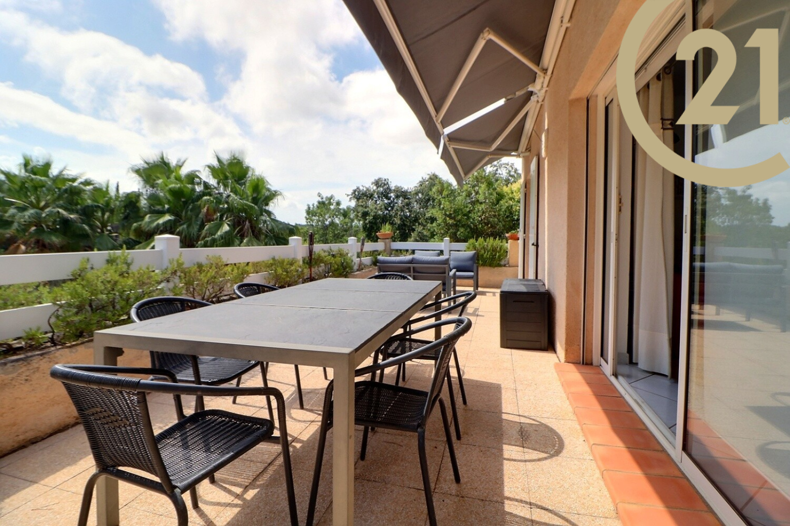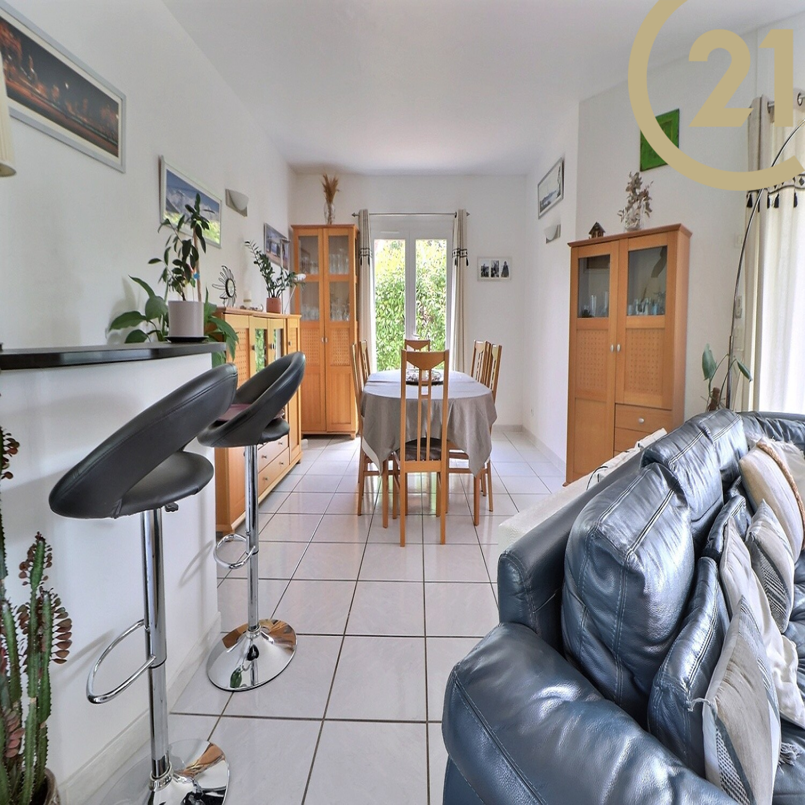Elle comprend de plain-pied : une entrée, un grand séjour-salle à manger avec cheminée donnant sur une belle et spacieuse terrasse avec store banne, une cuisine indépendante, un WC indépendant et une suite parentale avec baignoire et douche.