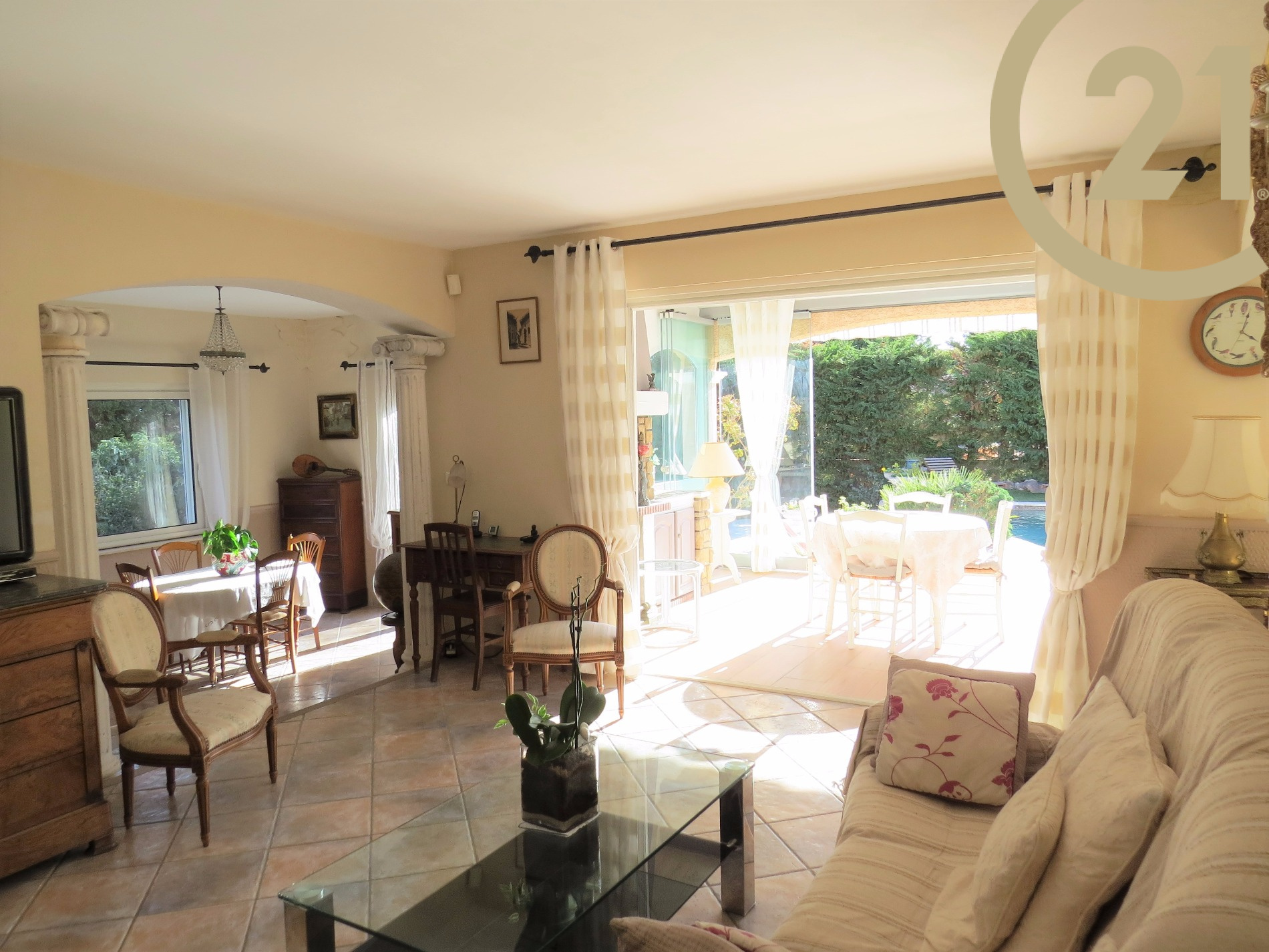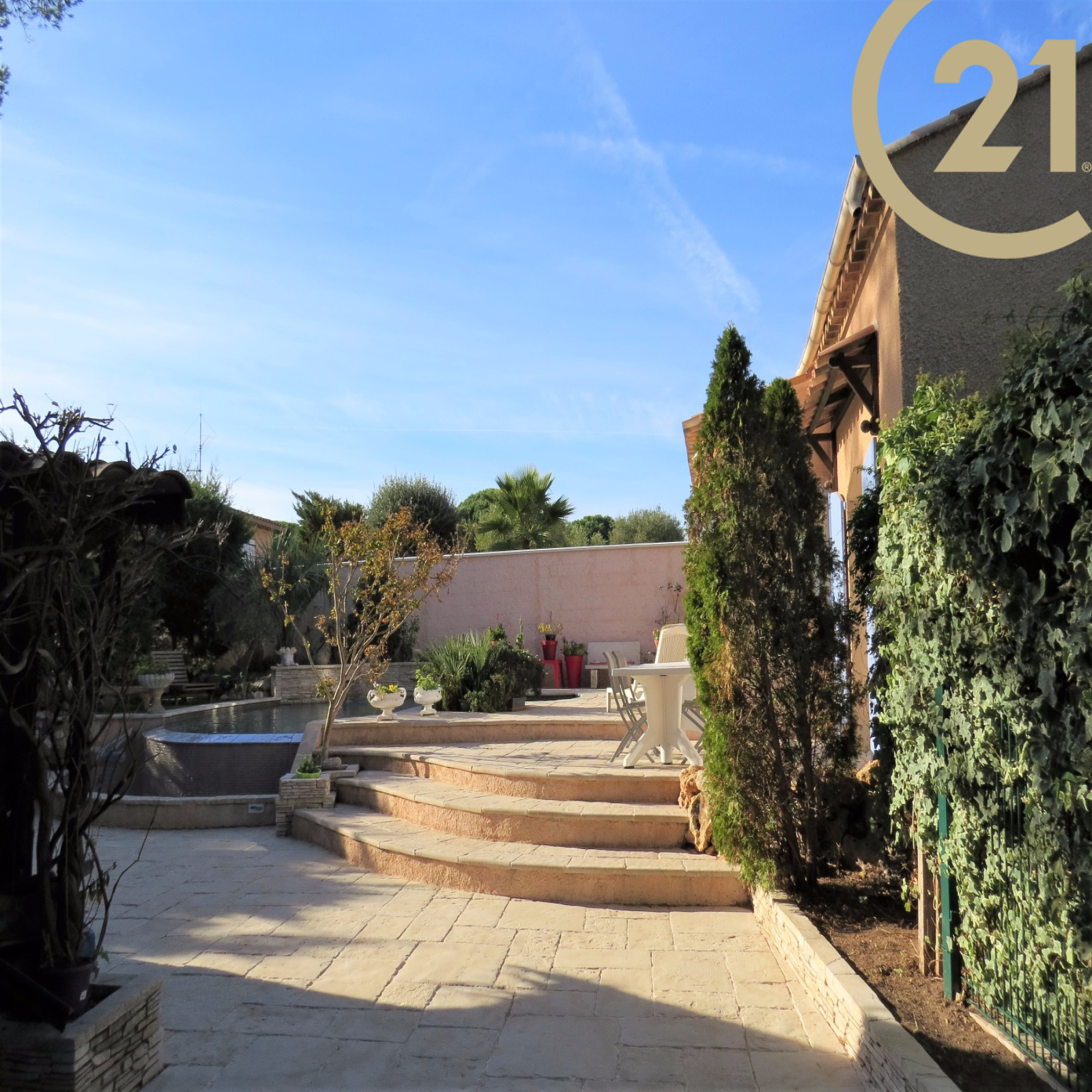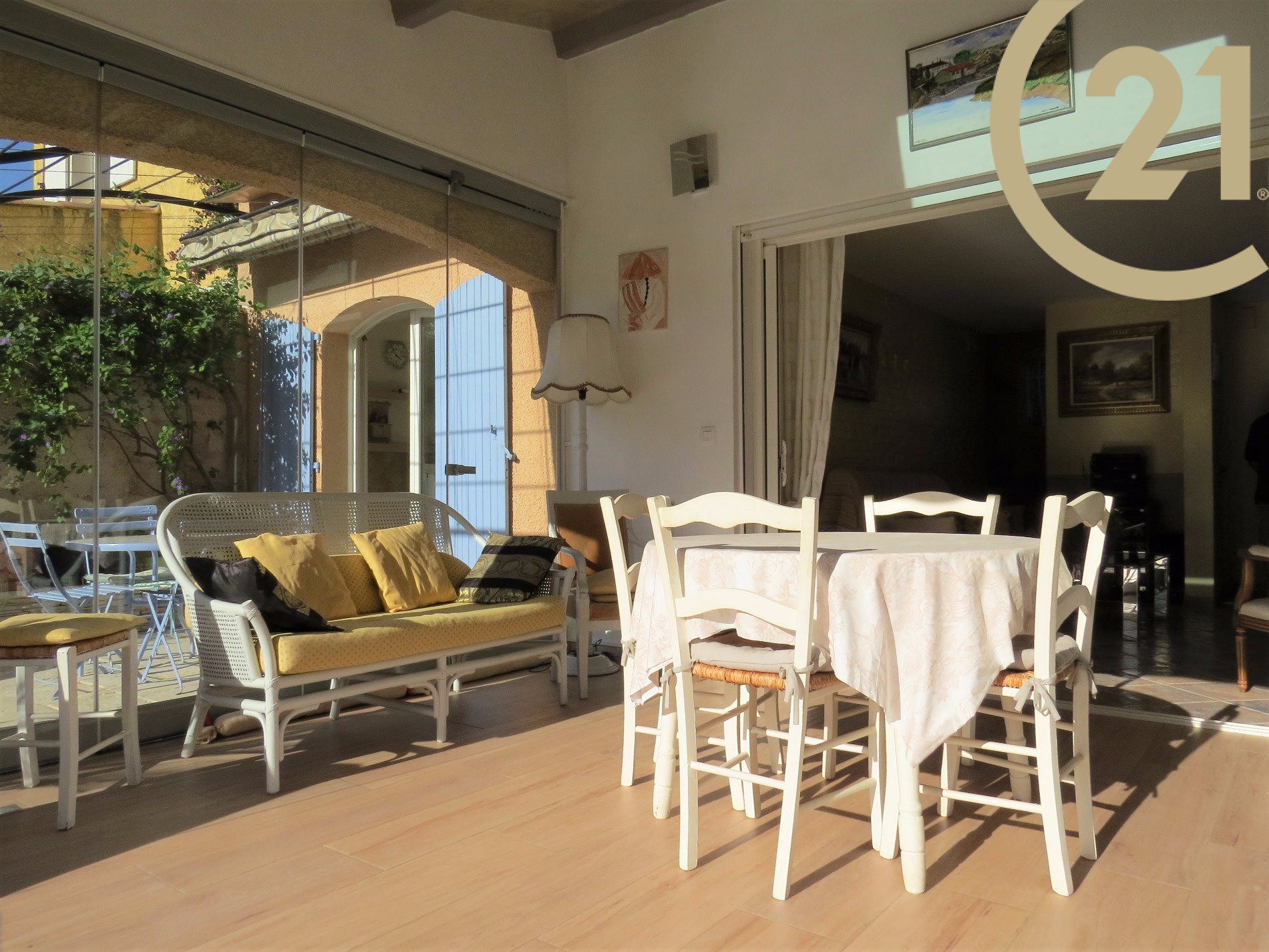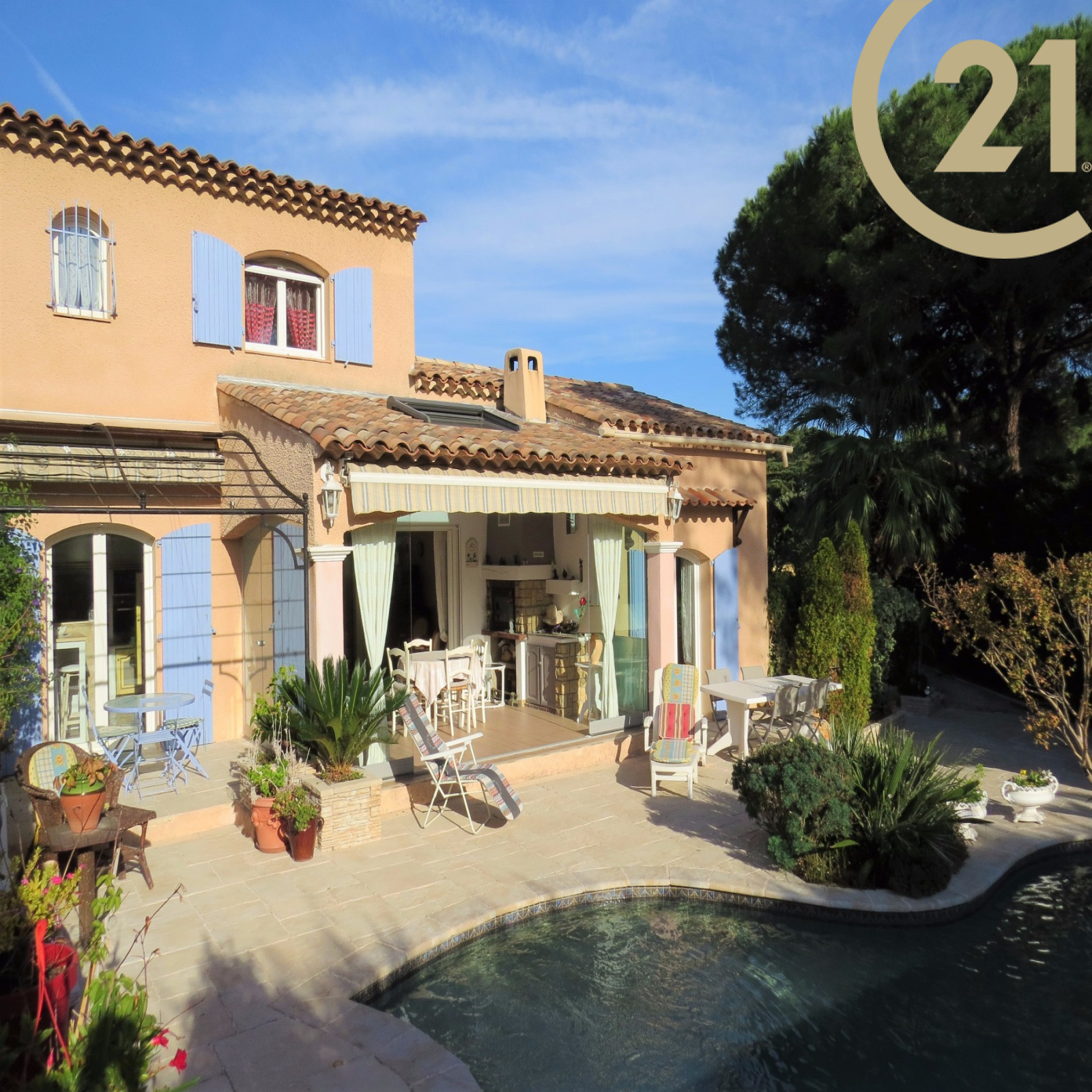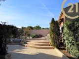 FREJUS - TOUR DE MARE - Charmante villa 4 pièces de 117 m² implantée sur un terrain soignement aménagé de 791 m² dans un quartier résidentiel de la Tour de Mare. Cette maison parfaitement entretenue offre de plain pied : un hall d'entrée, un spacieux séjour ouvert sur une veranda orientée plein sud avec vue sur piscine à débordement, une salle à manger offrant un accès à l'extérieur, une cuisine ouverte entièrement équipée avec cellier donnant sur une terrasse abritée par un store motorisé, une suite parentale comprenant une salle d'eau avec douche à l'italienne et des toilettes séparées. L'étage se compose de 2 chambres, d'une salle de bains/ salle d'eau et de toilettes séparées. Terrain nécessitant très peu d'entretien. Un abri voiture et un grand garage motorisé avec mezzanine viennent compléter ce bien. Belles prestations : baies à galandage, chauffage au sol, volets roulants électriques. Aucun travaux à prévoir. Copropriété de 2 lots. Pas de charge annuelle.