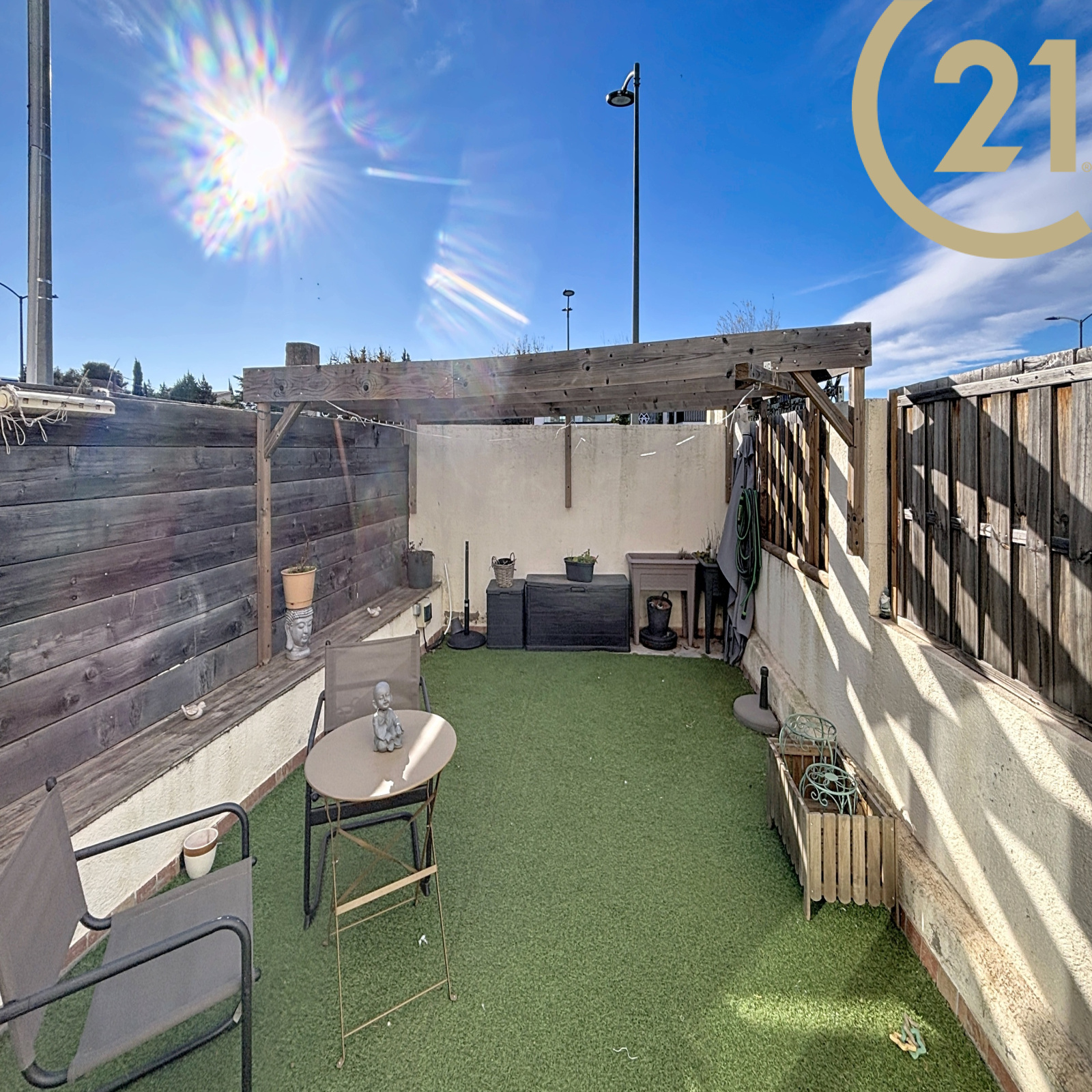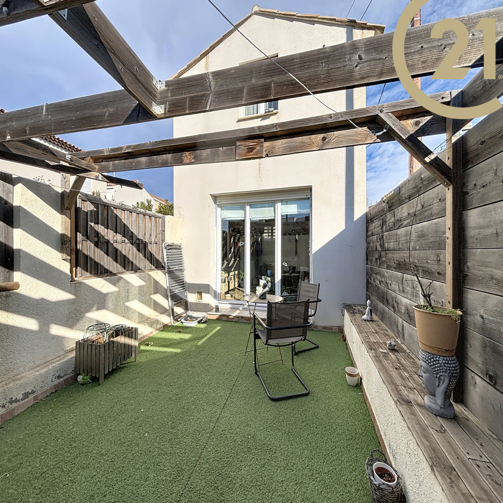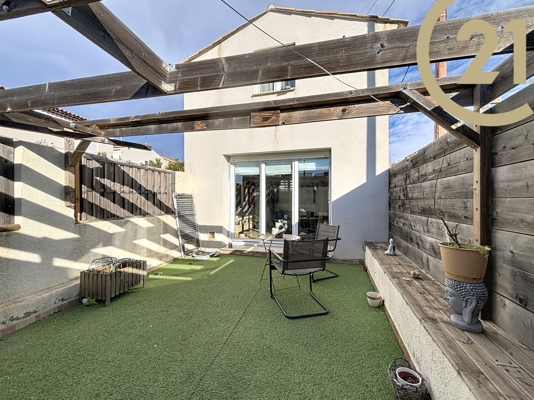 Les plus, une belle terrasse sans vis à vis de 21 m² exposée SUD, un abri de jardin et une place de stationnement.