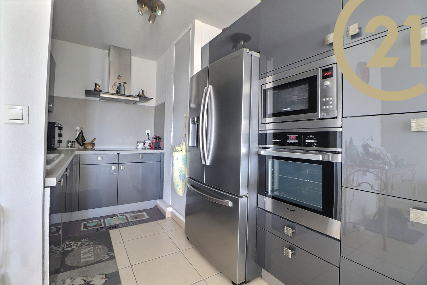 La pièce de vie, baignée de lumière, offre un cadre convivial avec sa cuisine américaine équipée. Elle s’ouvre sur une agréable terrasse, idéale pour vos moments de détente, avec une vue dégagée.