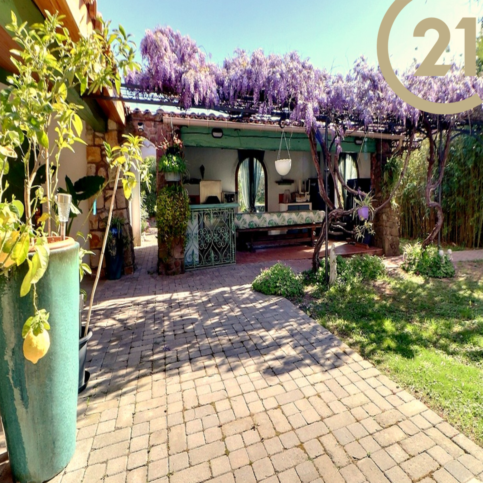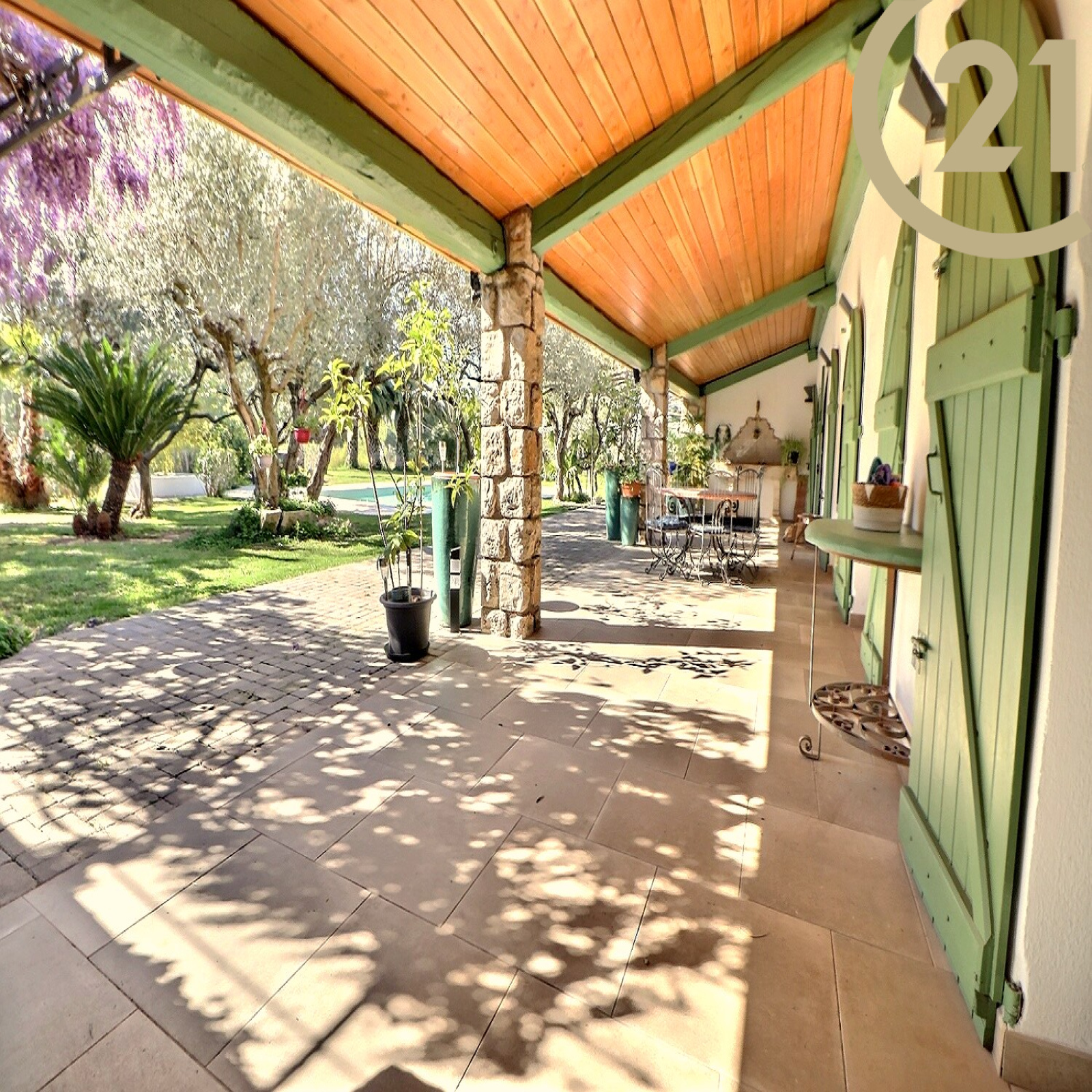 Très agréable terrasse couverte avec fontaine d'environ 46 m2 et cuisine d'été d'environ 22 m2.