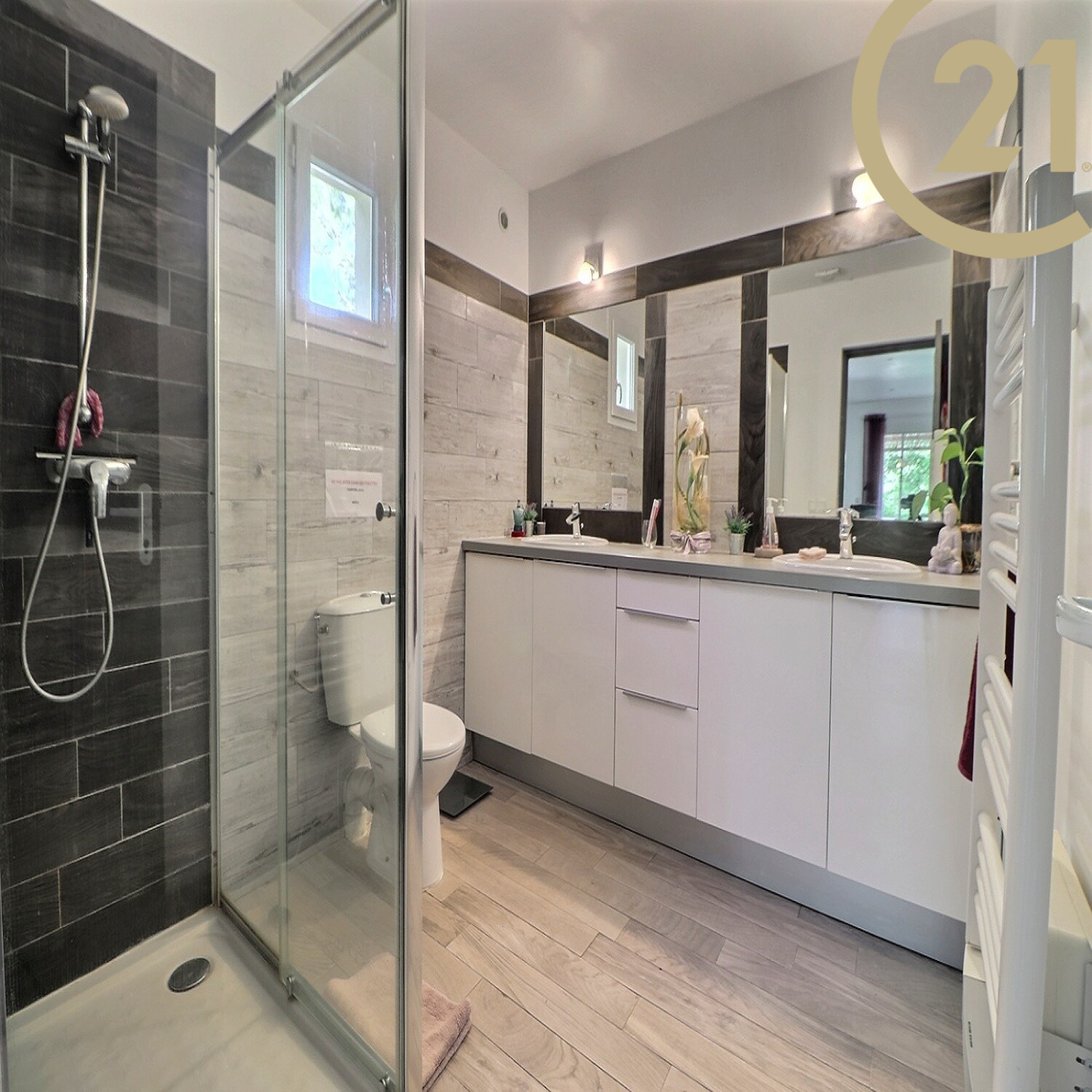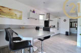 Cette villa entièrement de plain-pied comprend une entrée donnant sur un beau séjour avec cheminée à insert, une cuisine semi-ouverte, trois belles chambres avec placard, une salle de bains, une salle d'eau avec WC et un WC indépendant.