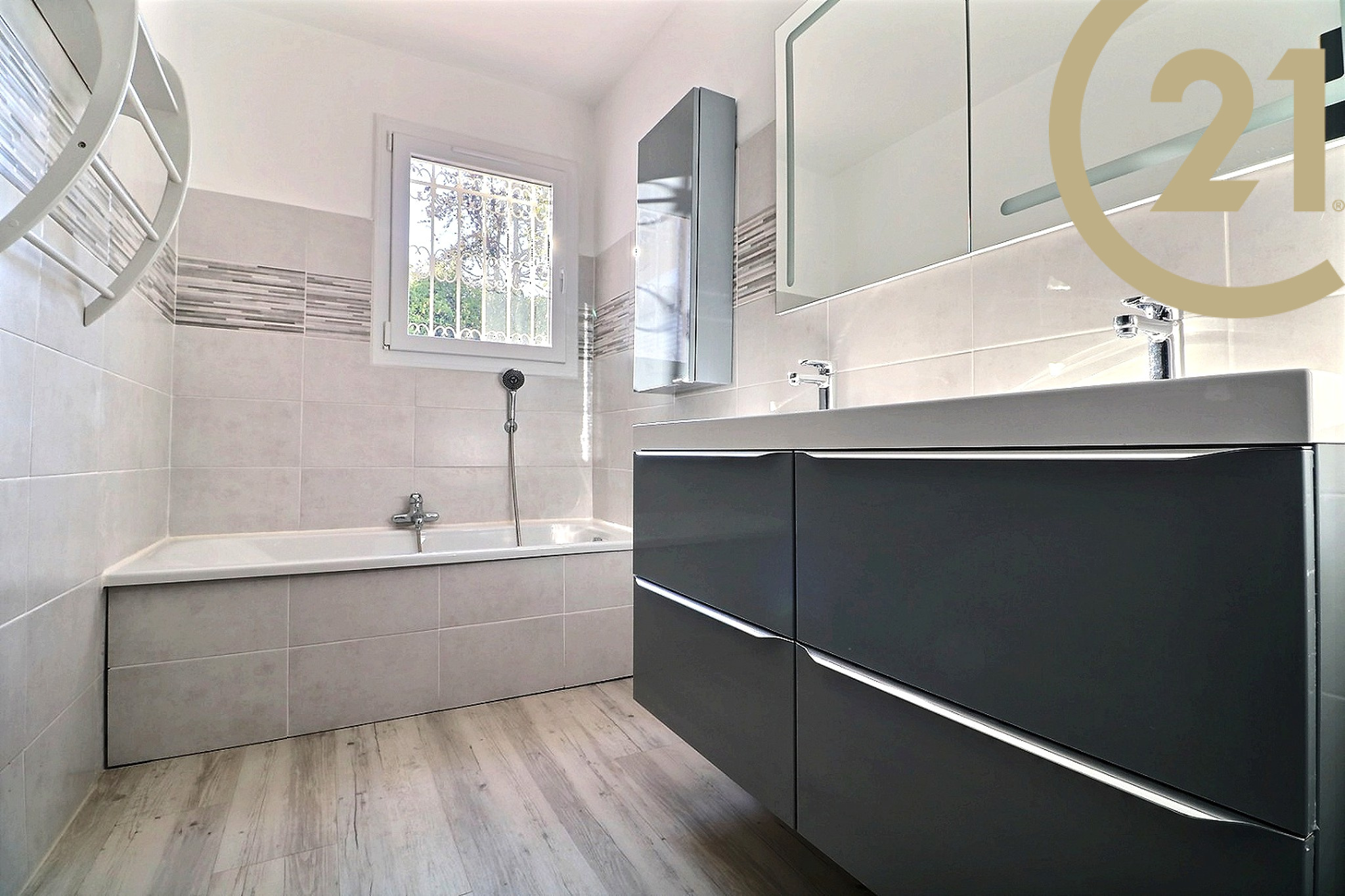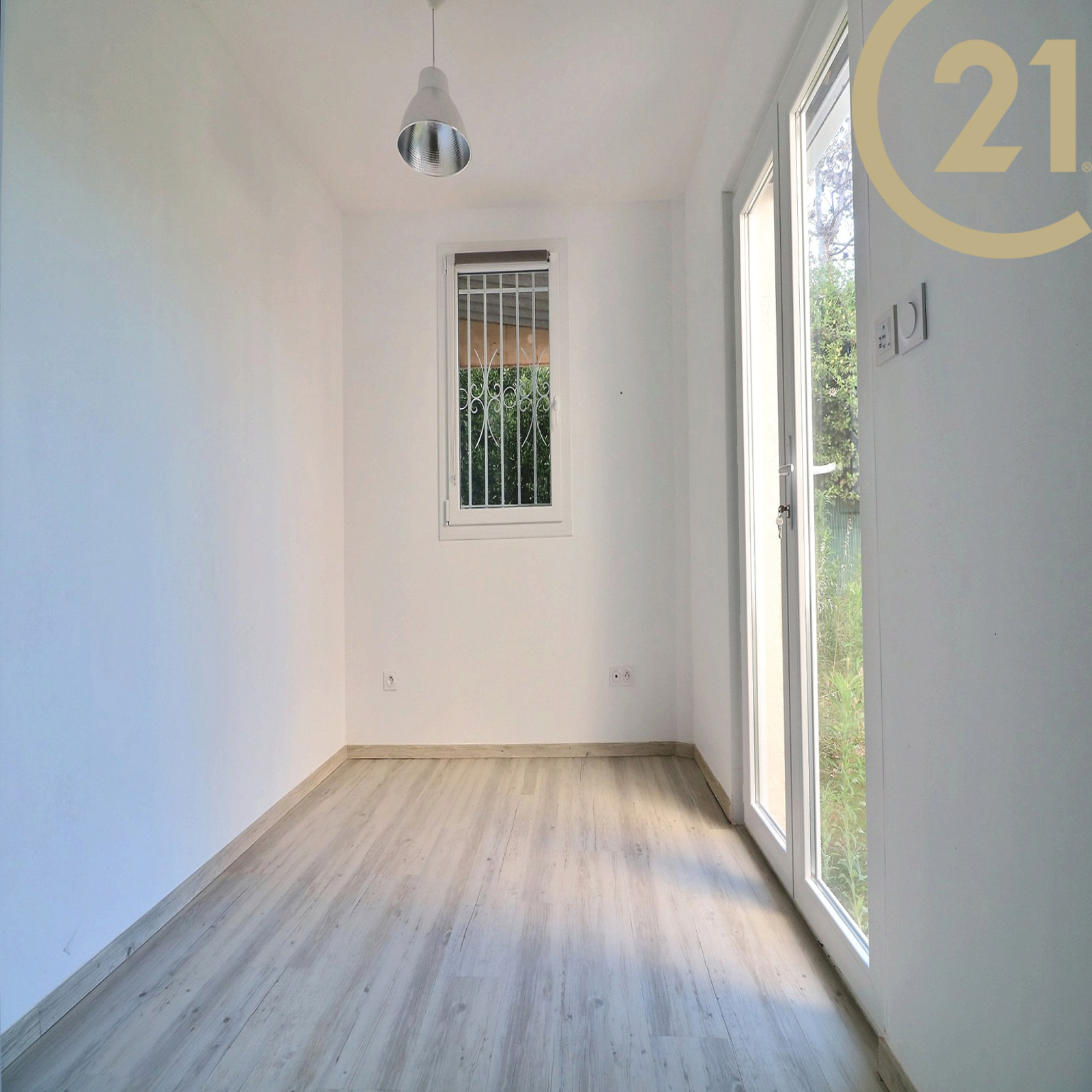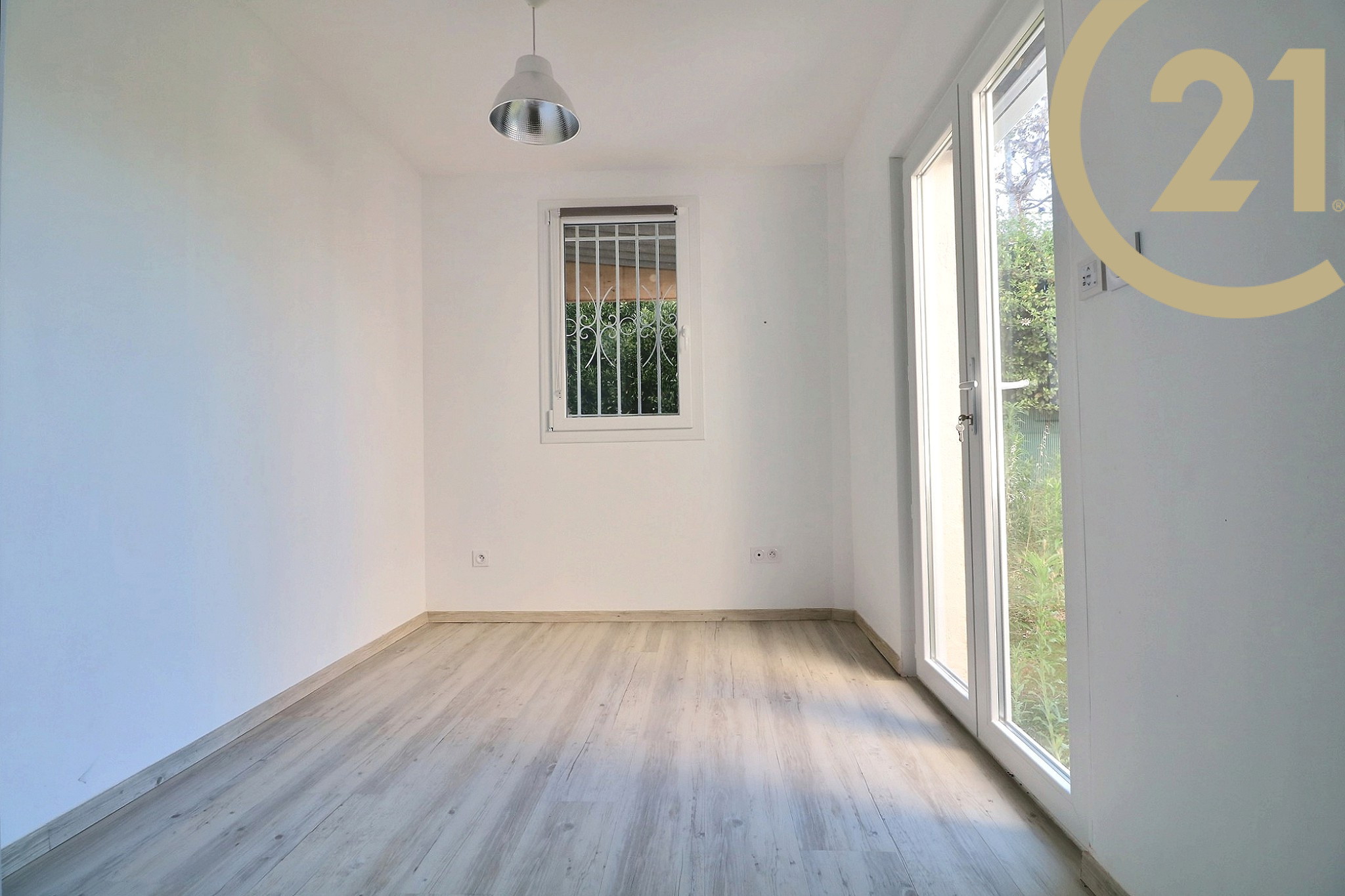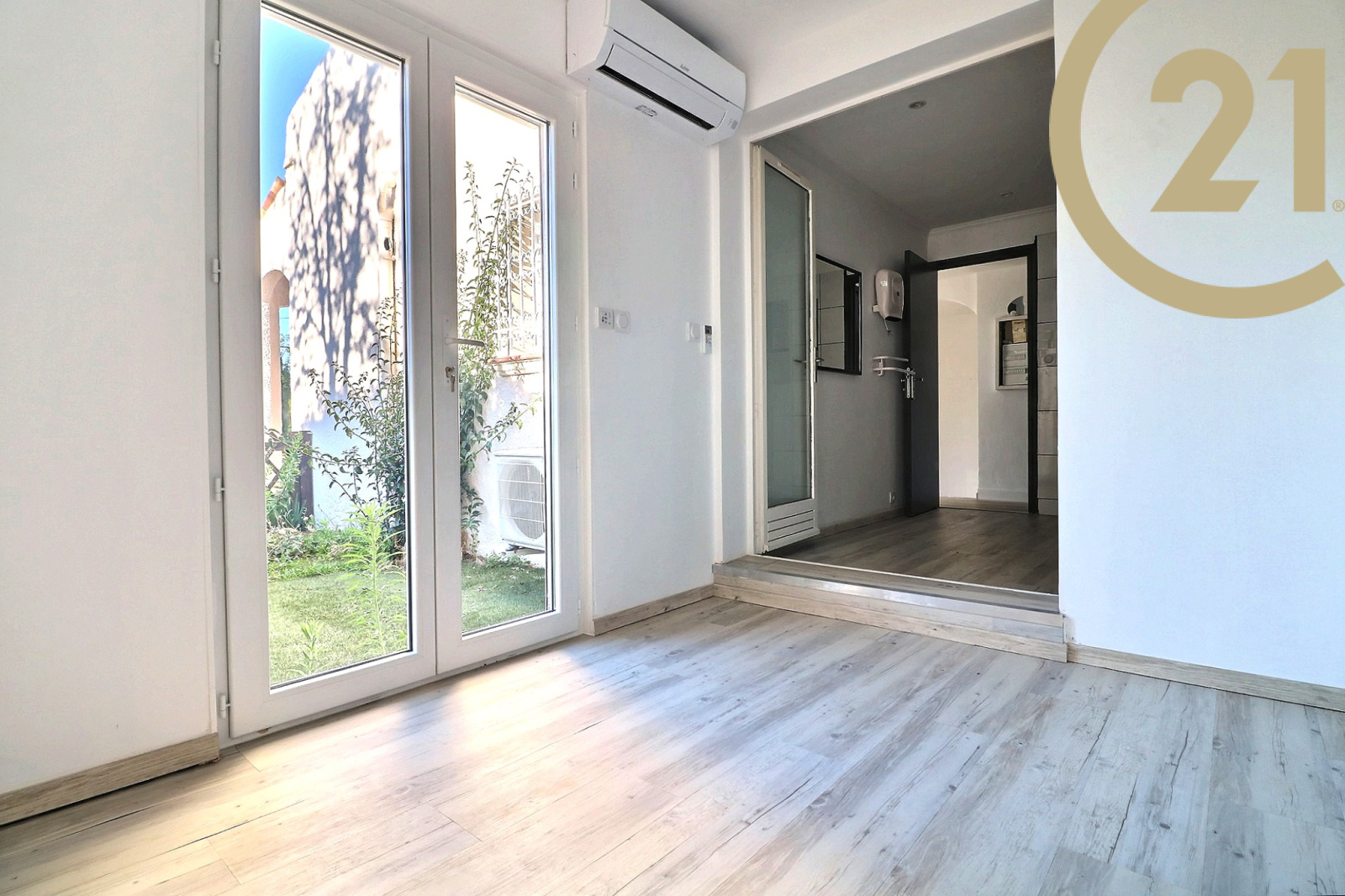 SAINT-RAPHAEL - Appartement 3 pièces en rez-de-jardin situé dans une petite résidence sécurisée au coeur d'un quartier très prisé à quelques minutes du centre-ville. Il offre un hall d'entrée, un lumineux séjour exposé au Sud et ouvert sur le jardin, une cuisine semi-ouverte équipée, une grande chambre avec placard donnant sur une deuxième terrasse privative, une salle de bains avec double vasque et ouverture sur l'extérieur, une chambre avec salle d'eau bénéficiant d'un espace extérieur et des WC séparés. Un très grand jardin en position dominante avec aperçu mer complète cet appartement. Prestations contemporaines : baies vitrées neuves, stores électriques avec fermeture centralisée, climatisation réversible. Vendu avec parking et cave. Vous apprécierez le calme absolu et la qualité d'environnement de cet appartement à proximité immédiate du centre-ville et de la mer. Ravalement de façade récent. Petite copropriété. Charges annuelles : x €