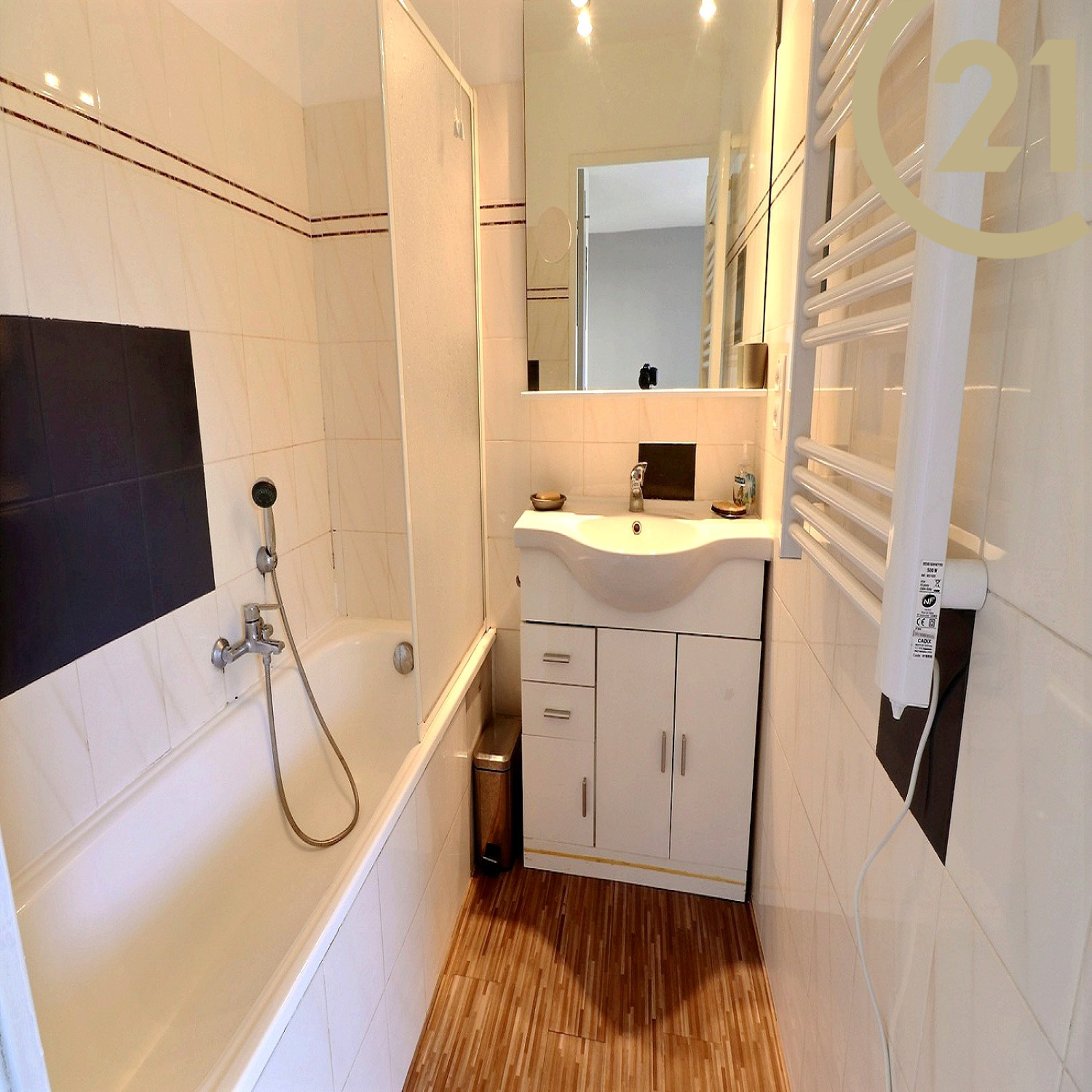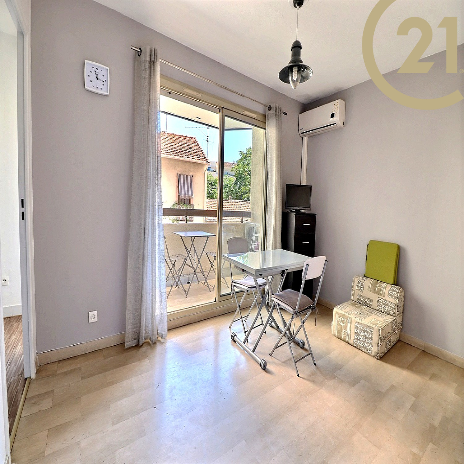 Ce studio est composé d'un hall d'entrée avec placard, d'un cuisine indépendante équipée, d'une salle de bains, d'une pièce de vie lumineuse climatisée et d'un balcon exposé EST.