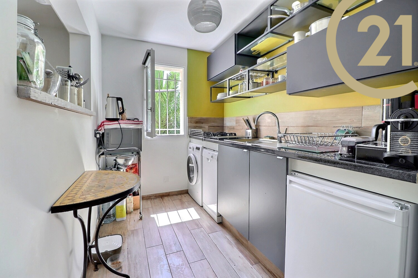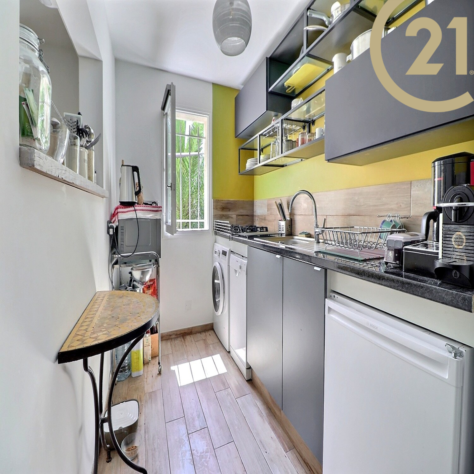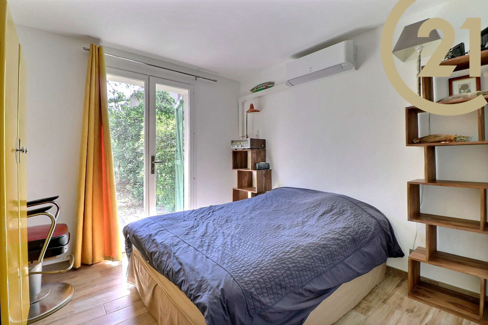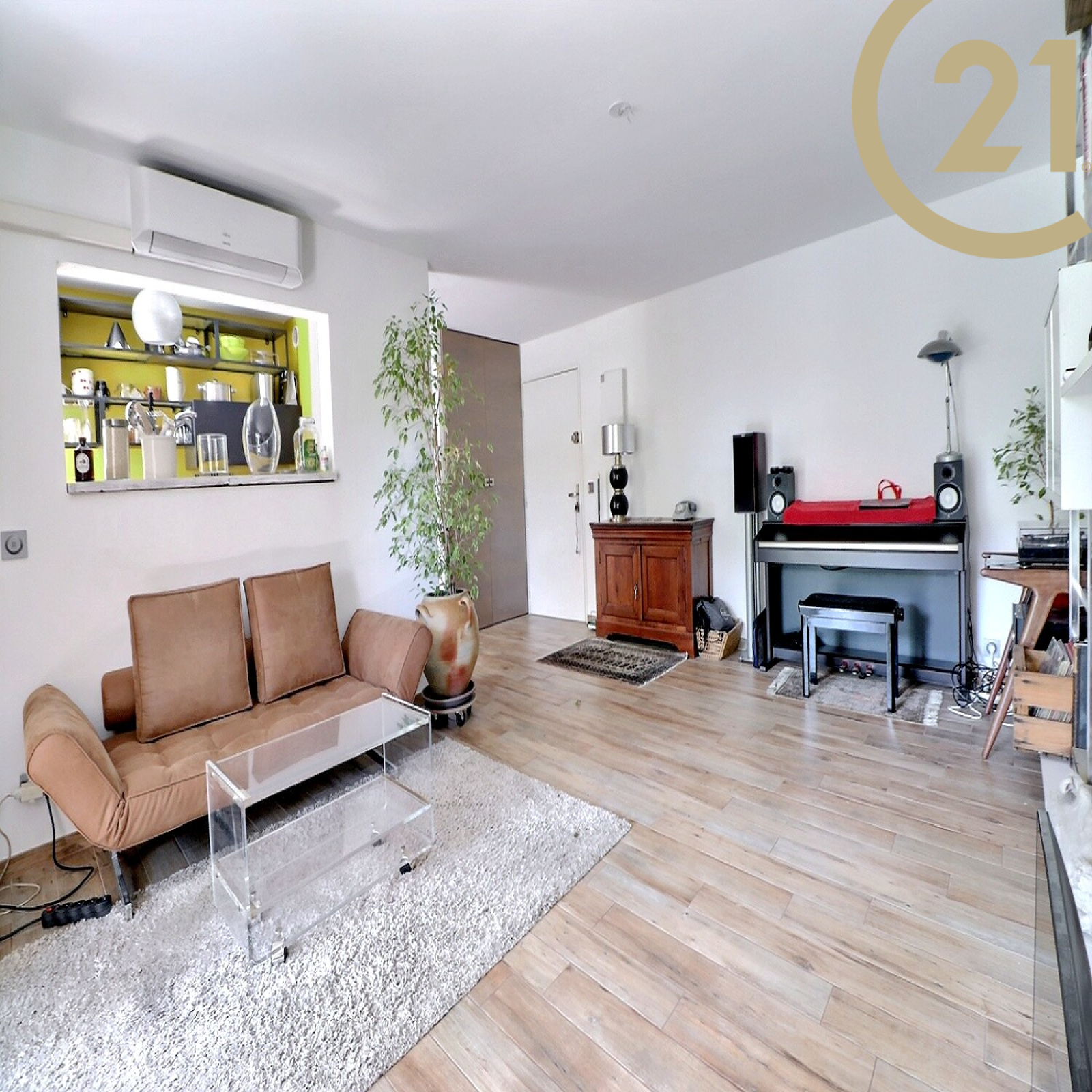 Il se compose : d'un salon, d'une cuisine, d'un hall d'entrée avec placard, d'un wc indépendant, d'une chambre, d'une salle d'eau et d'un beau jardin de plus de 50 m² arboré. Prestations de qualité : Climatisation Daikin, portes coulissantes.