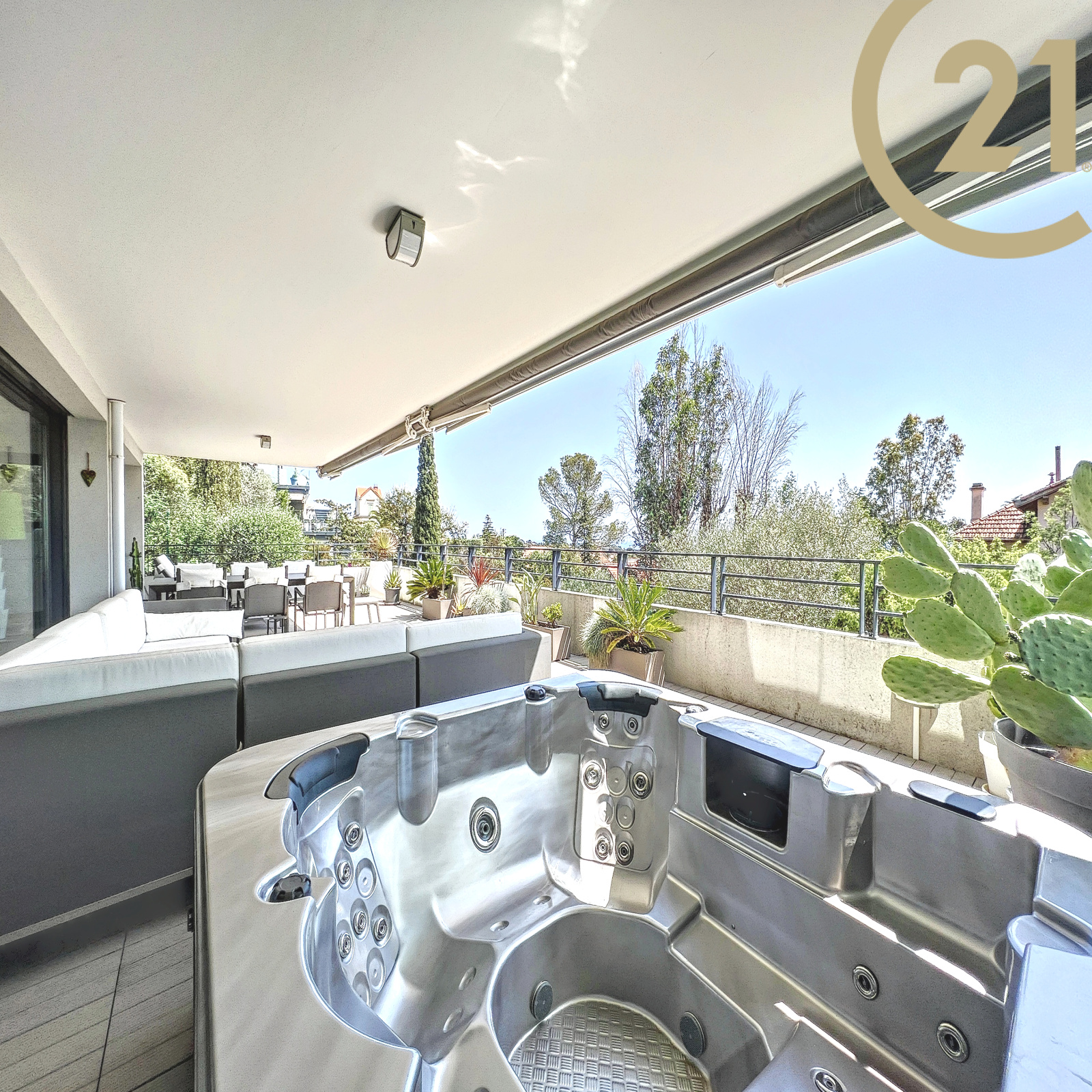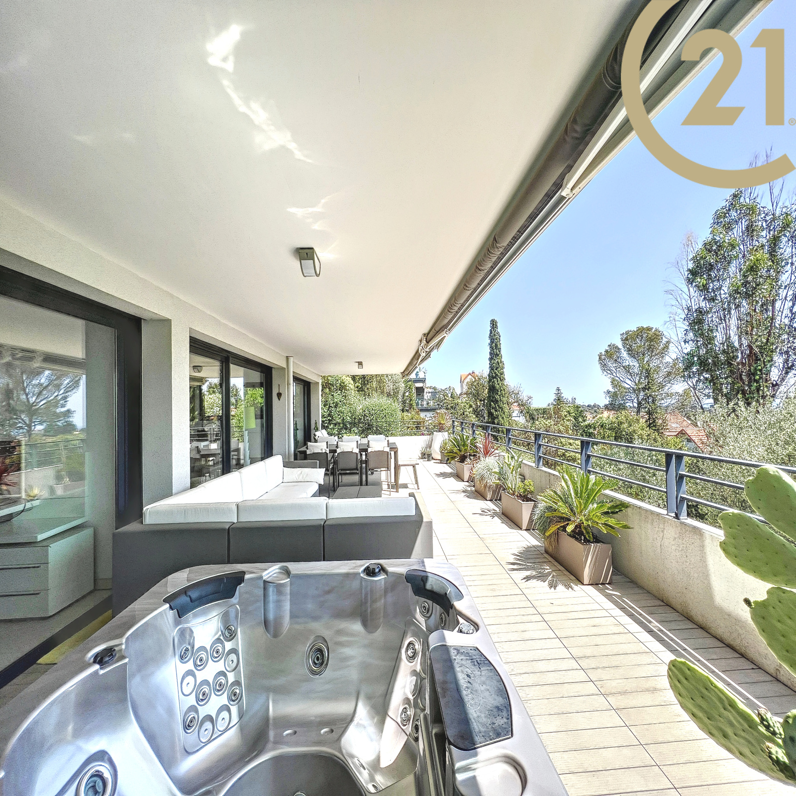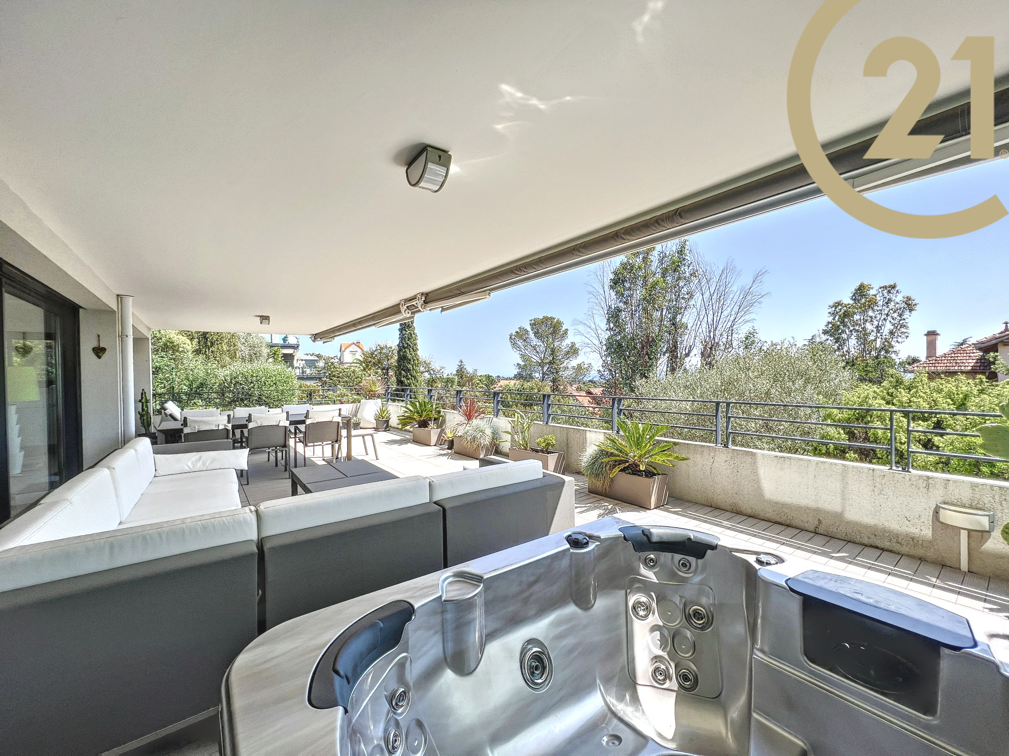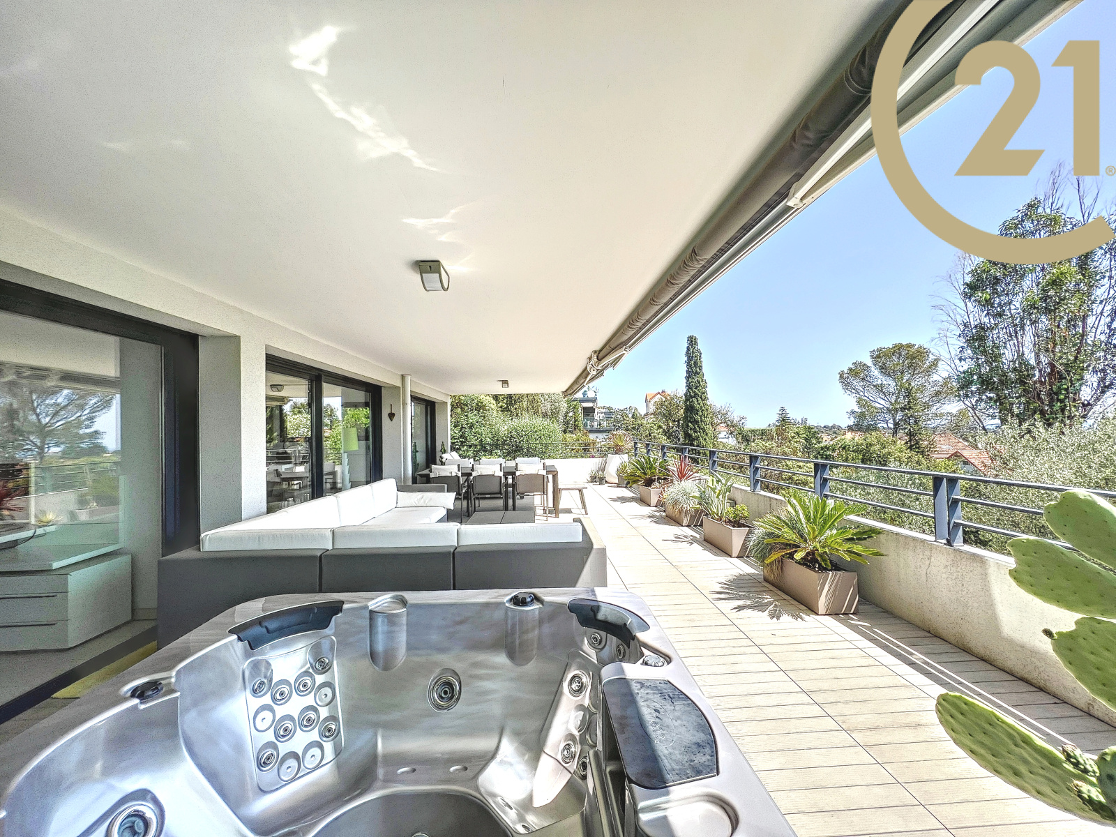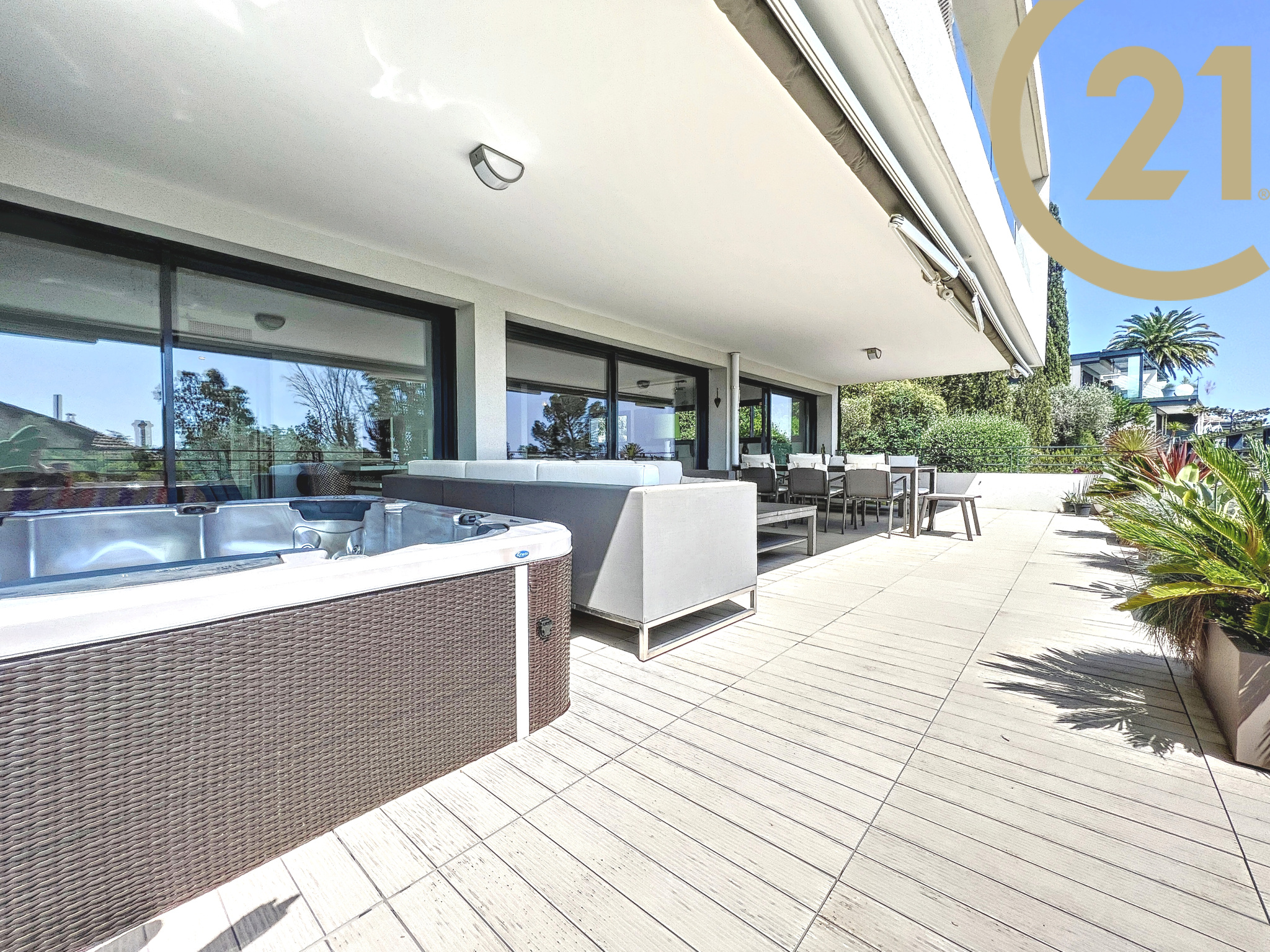 L'appartement dispose d'une superbe terrasse semi-couverte de 59 m² avec jacuzzi et stores motorisés offrant une belle vue sur la baie de Saint-Raphaël.