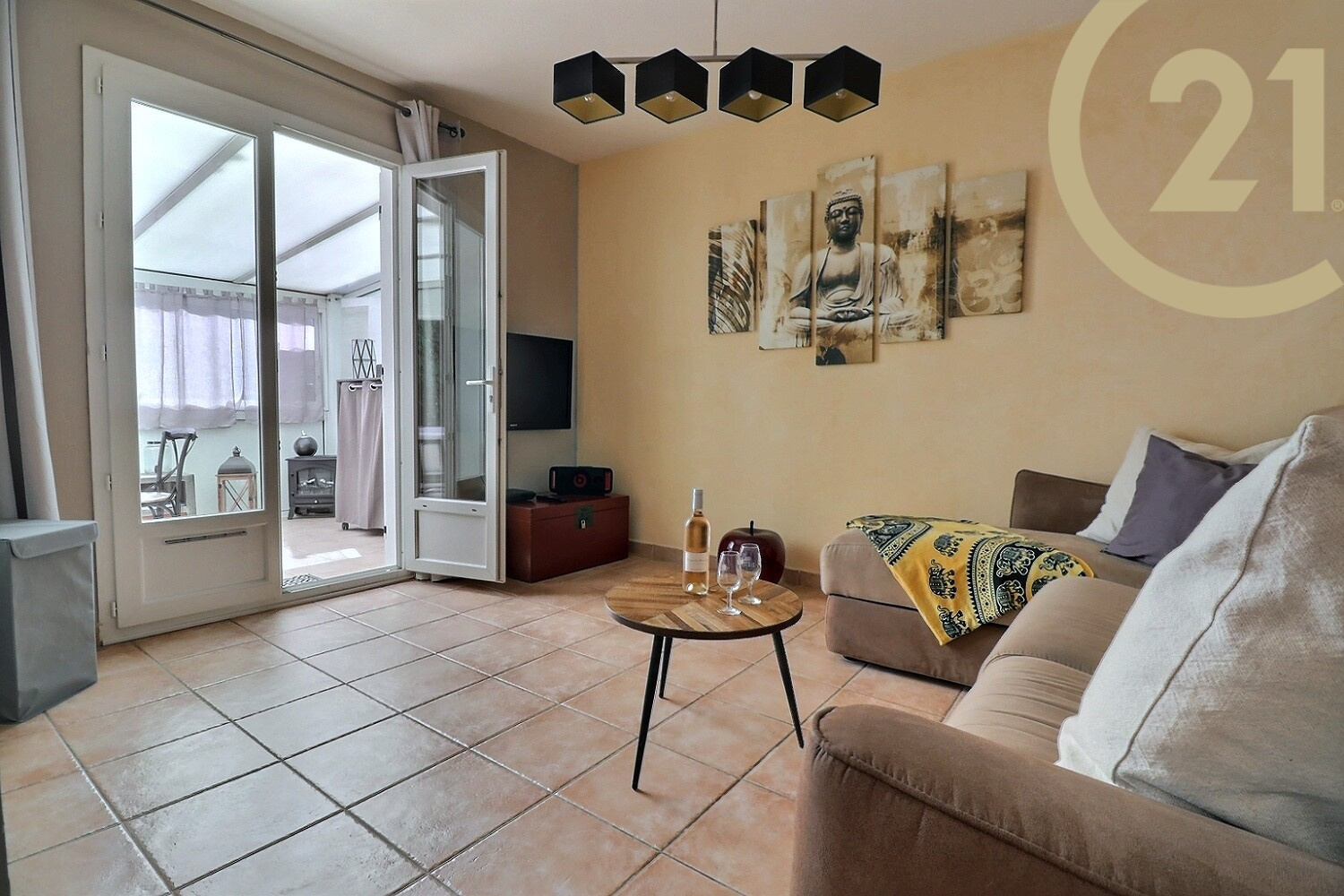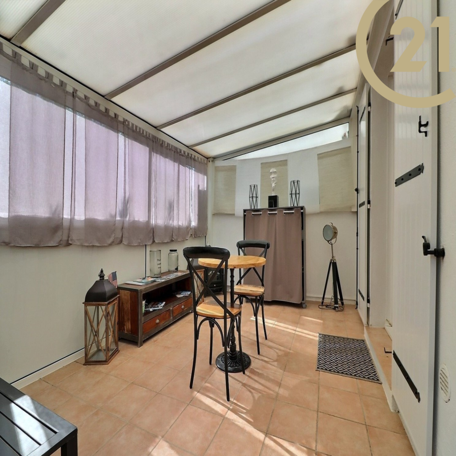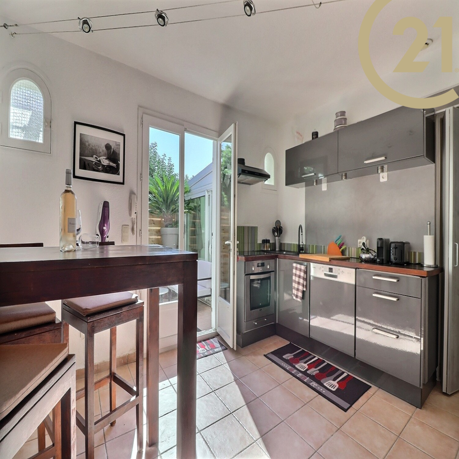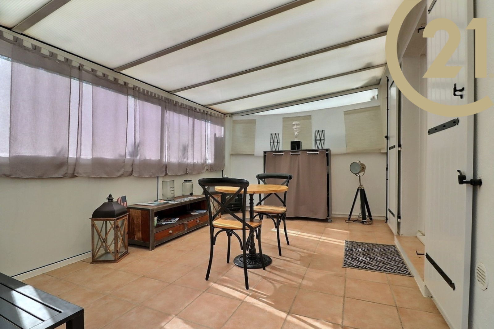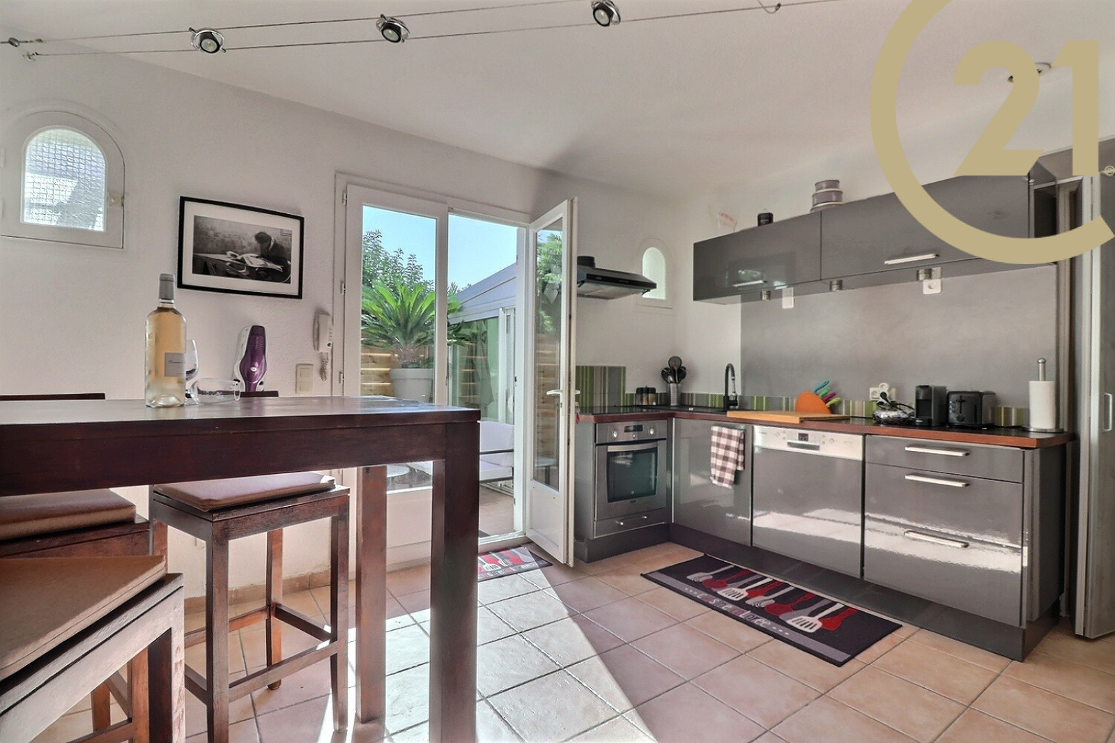 L'appartement comprend un séjour s'ouvrant sur une belle véranda, une cuisine spacieuse aménagée et équipée, une chambre avec grand dressing et sa salle d'eau avec WC et un WC/buanderie pouvant se modifier en 2e salle d'eau.