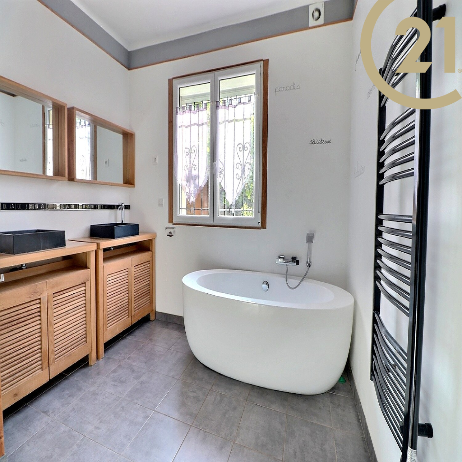 VENTE - SAINT-RAPHAËL PROCHE CENTRE-VILLE, Belle villa 6 pièces d'une superficie de 158 m² situé dans un quartier résidenciel calme et proche des commerces. Edifiée sur un terrain de 392 m², elle se compose de plain-pied : d'une cuisine ouverte donnant sur un agréable séjour, de deux chambres, d'une grande salle de bains avec baignoire et douche à l'italienne, d'une salle de jeux et d'un wc indépendant. A l'étage vous retrouverez 3 chambres, un dressing, une salle d'eau et un wc séparé. Cette maison dispose également d'un garage avec espace buanderie et atelier. Possibilité de stationner plusieurs véhicules devant la maison. Belles prestations: double vitrage, volets roulants électriques, stores électriques.