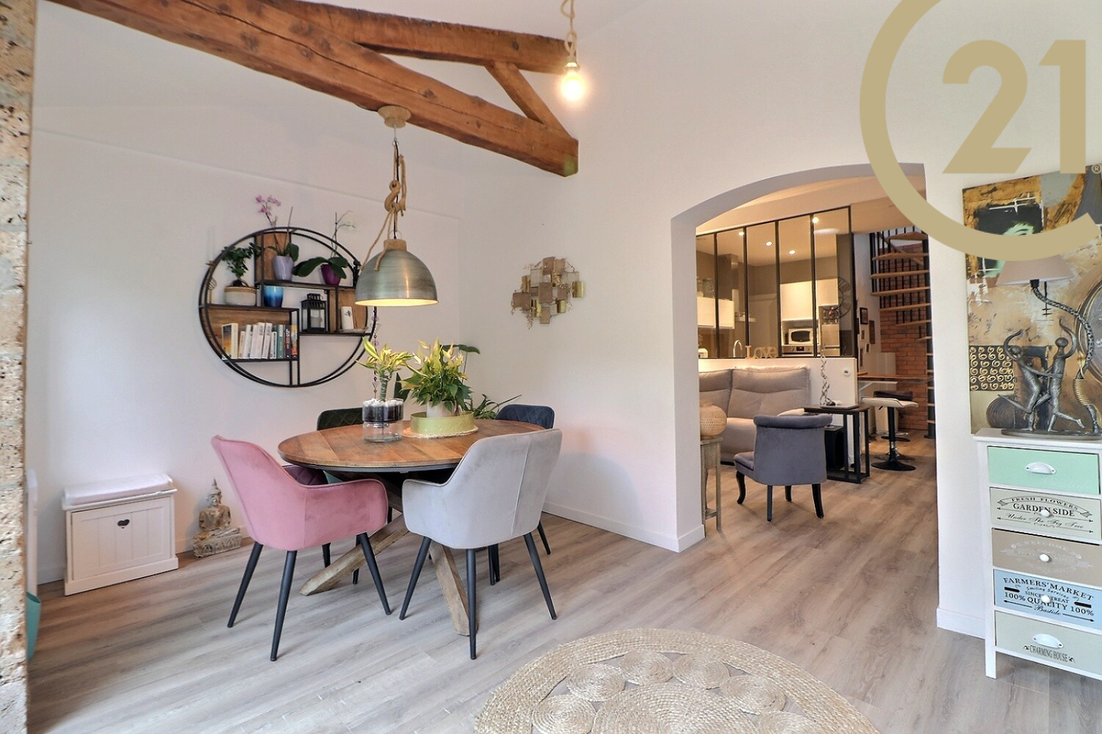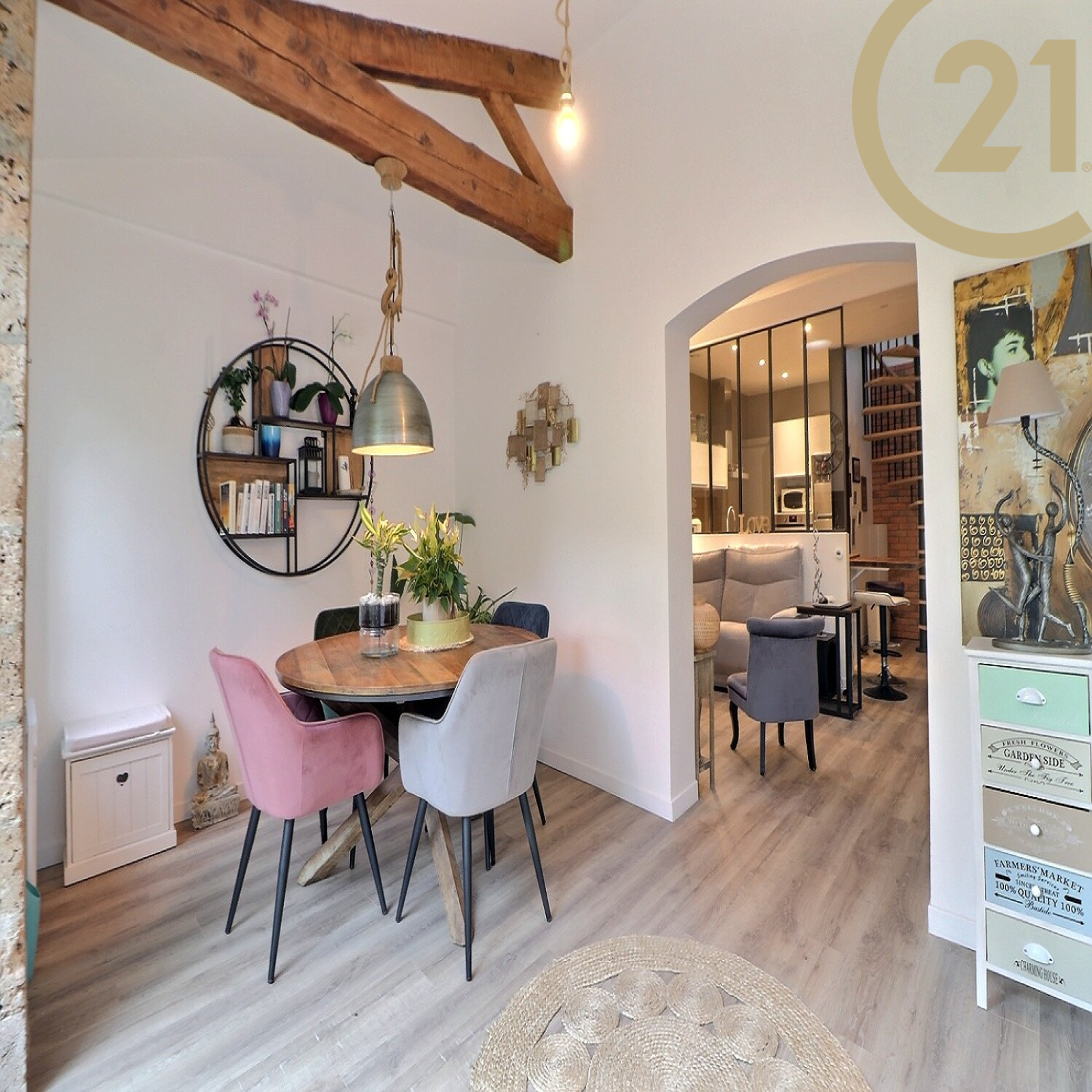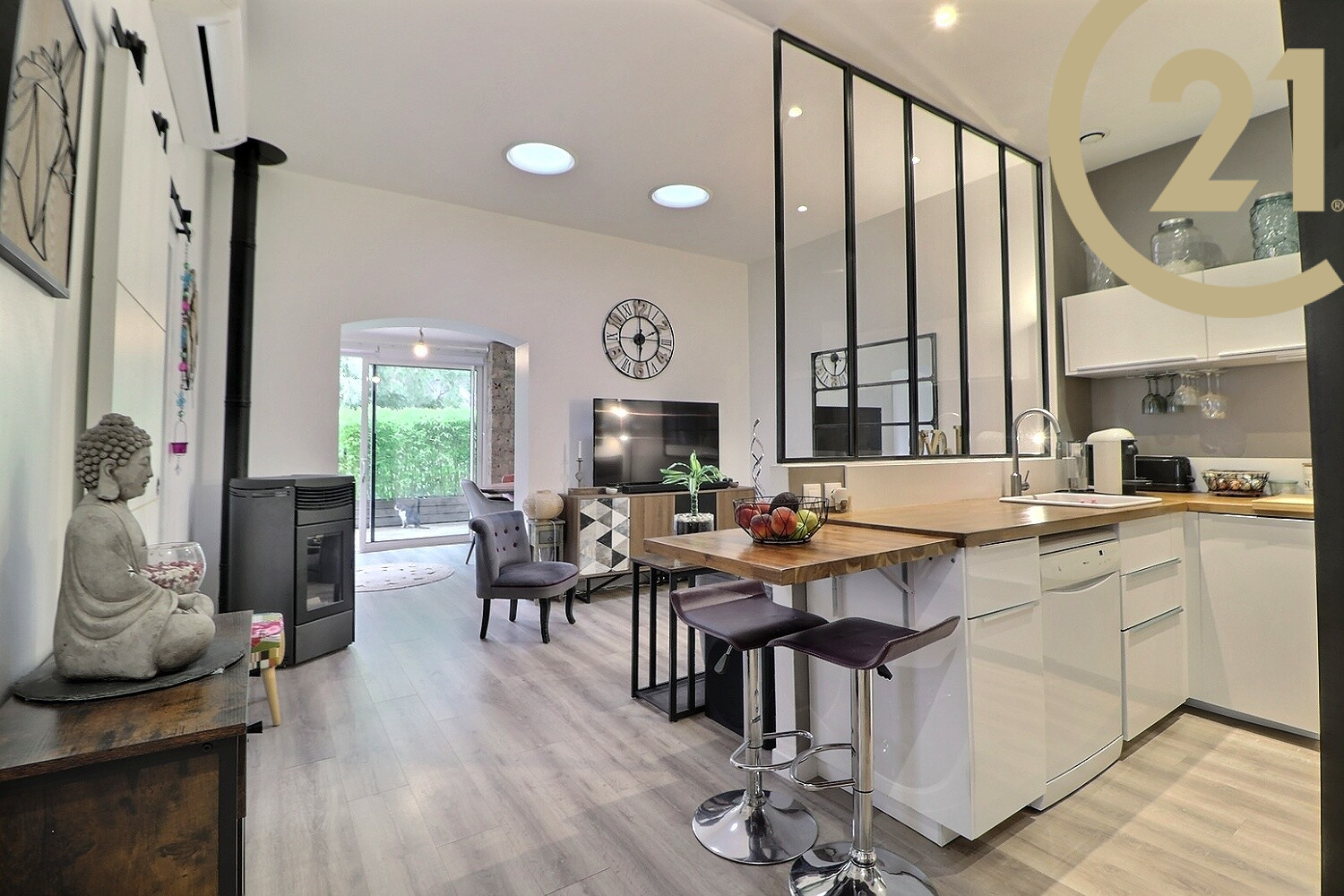Elle se compose au rez-de-chaussée d’un lumineux espace séjour donnant sur une terrasse d’environ 20m², d’un salon, d’une cuisine équipée, d’une chambre, d’un bureau, d’une salle d’eau et d’un WC.