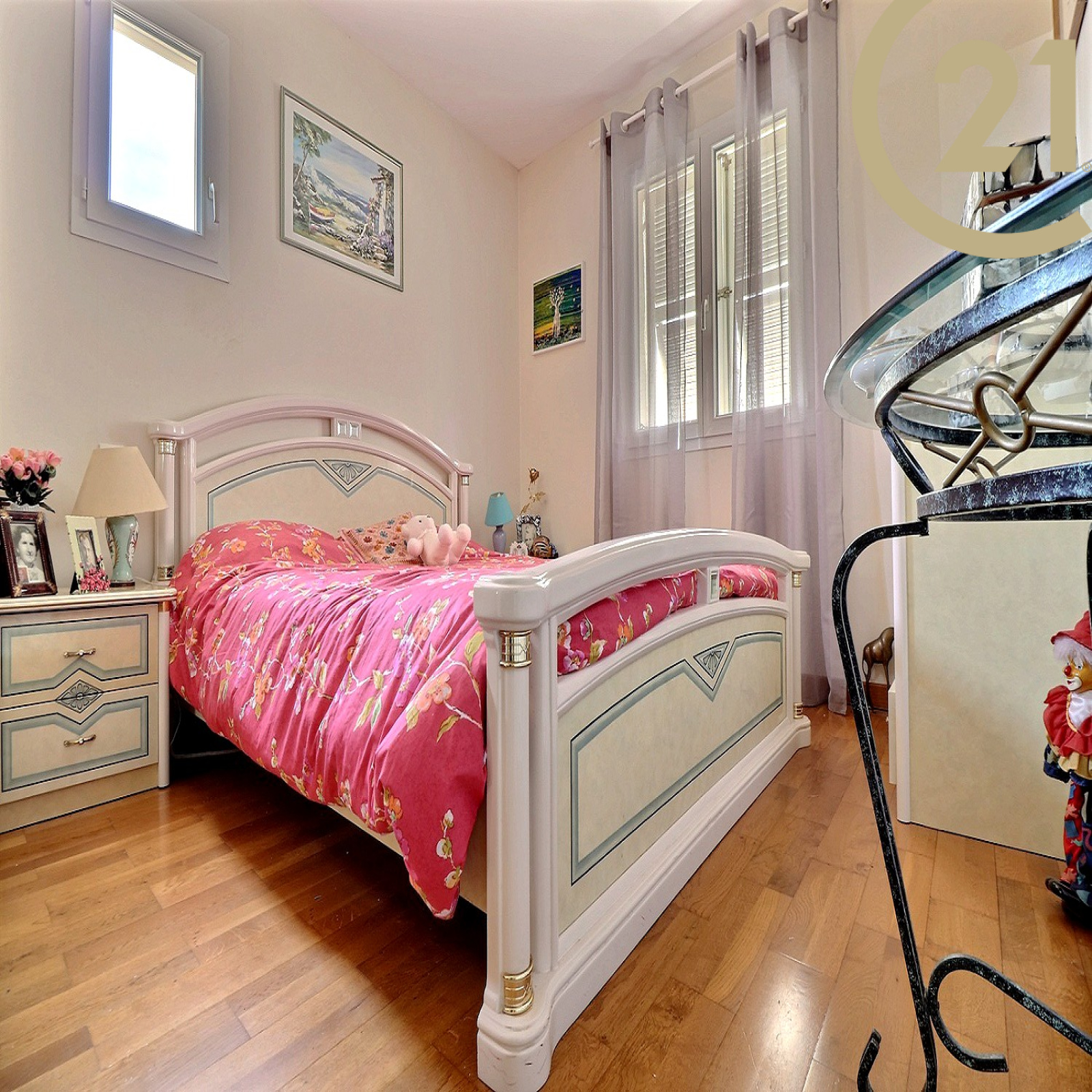 A l'étage on bénéficie de deux chambres, d'une salle d'eau, d'une salle de bains et d'un wc séparé.