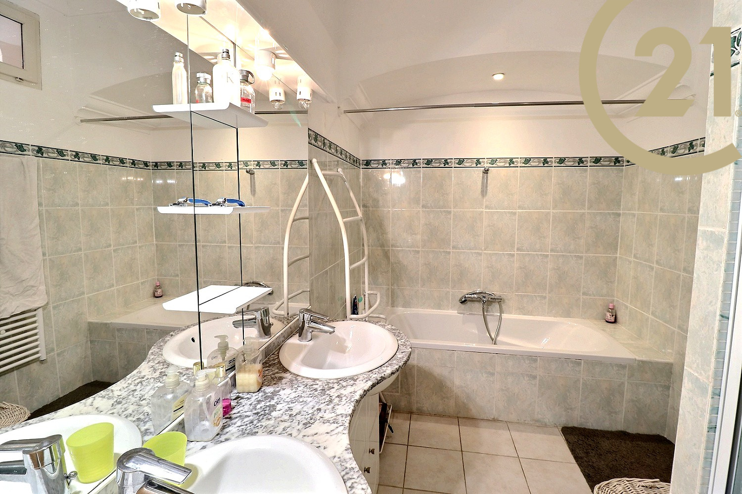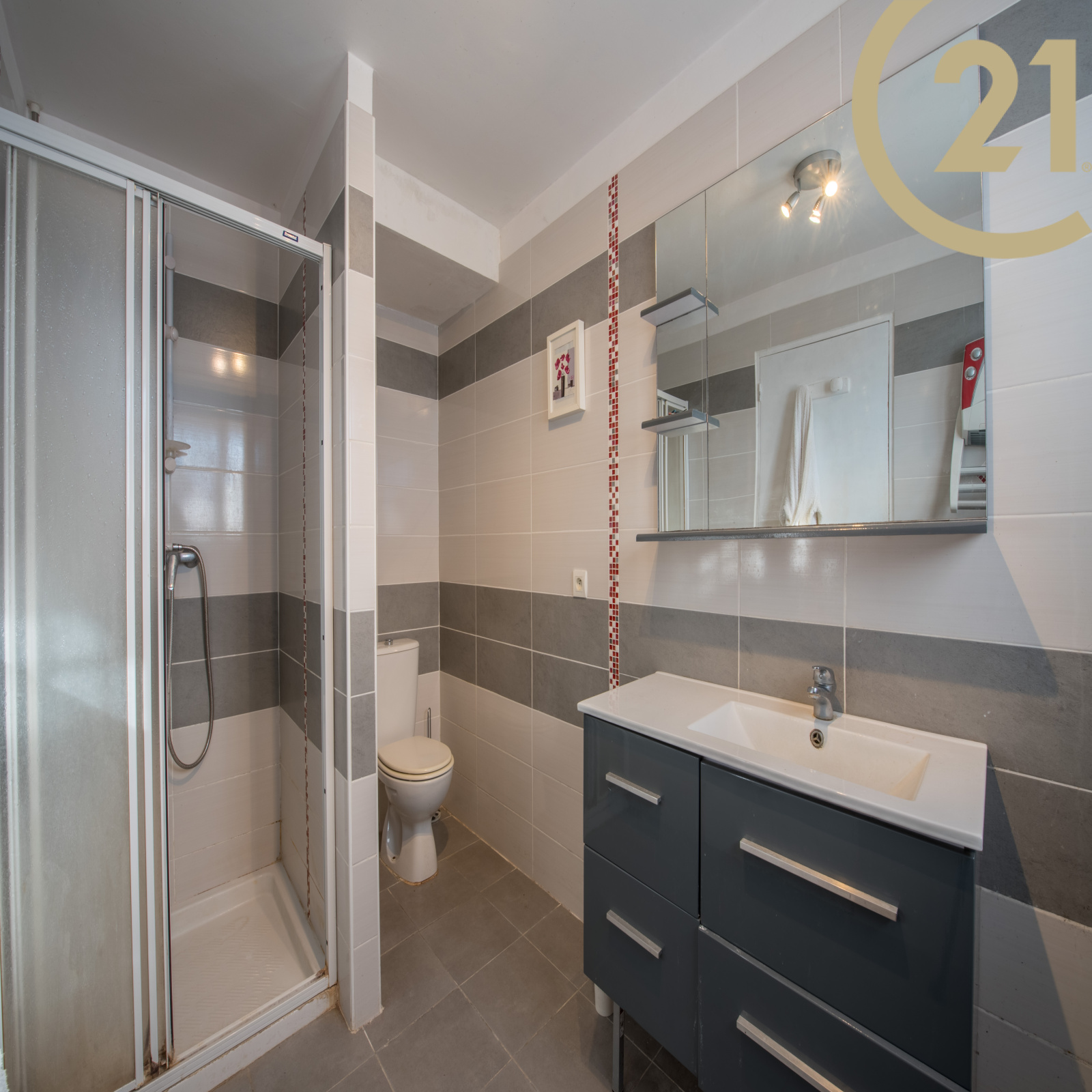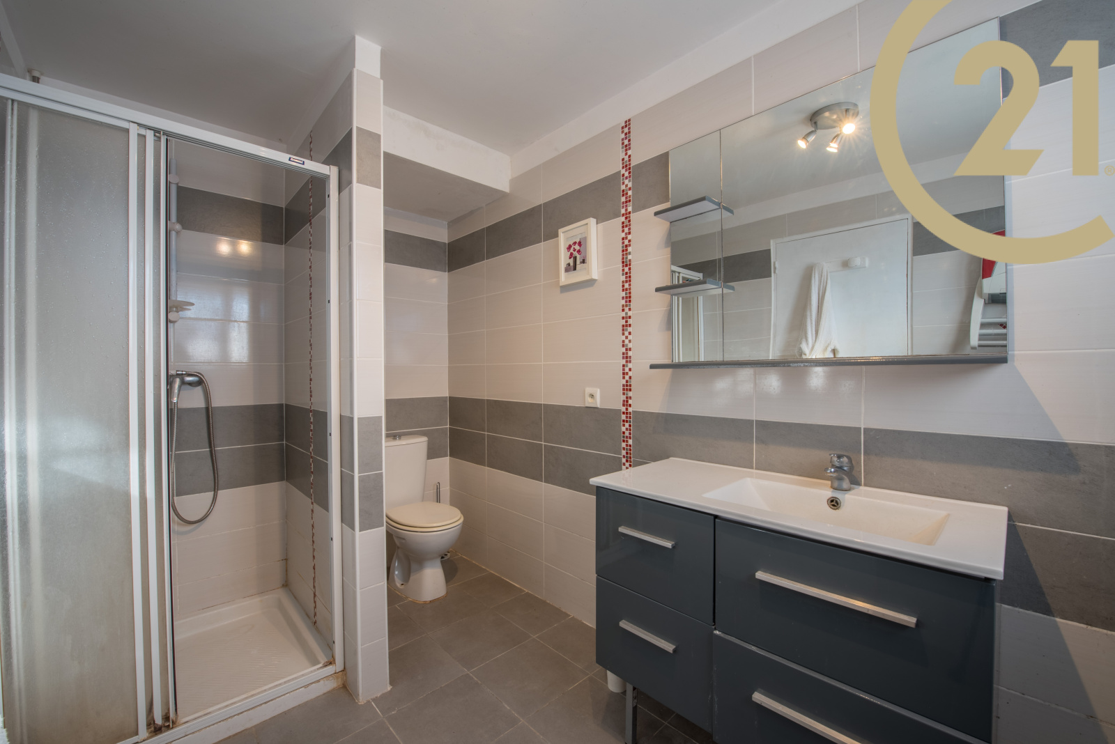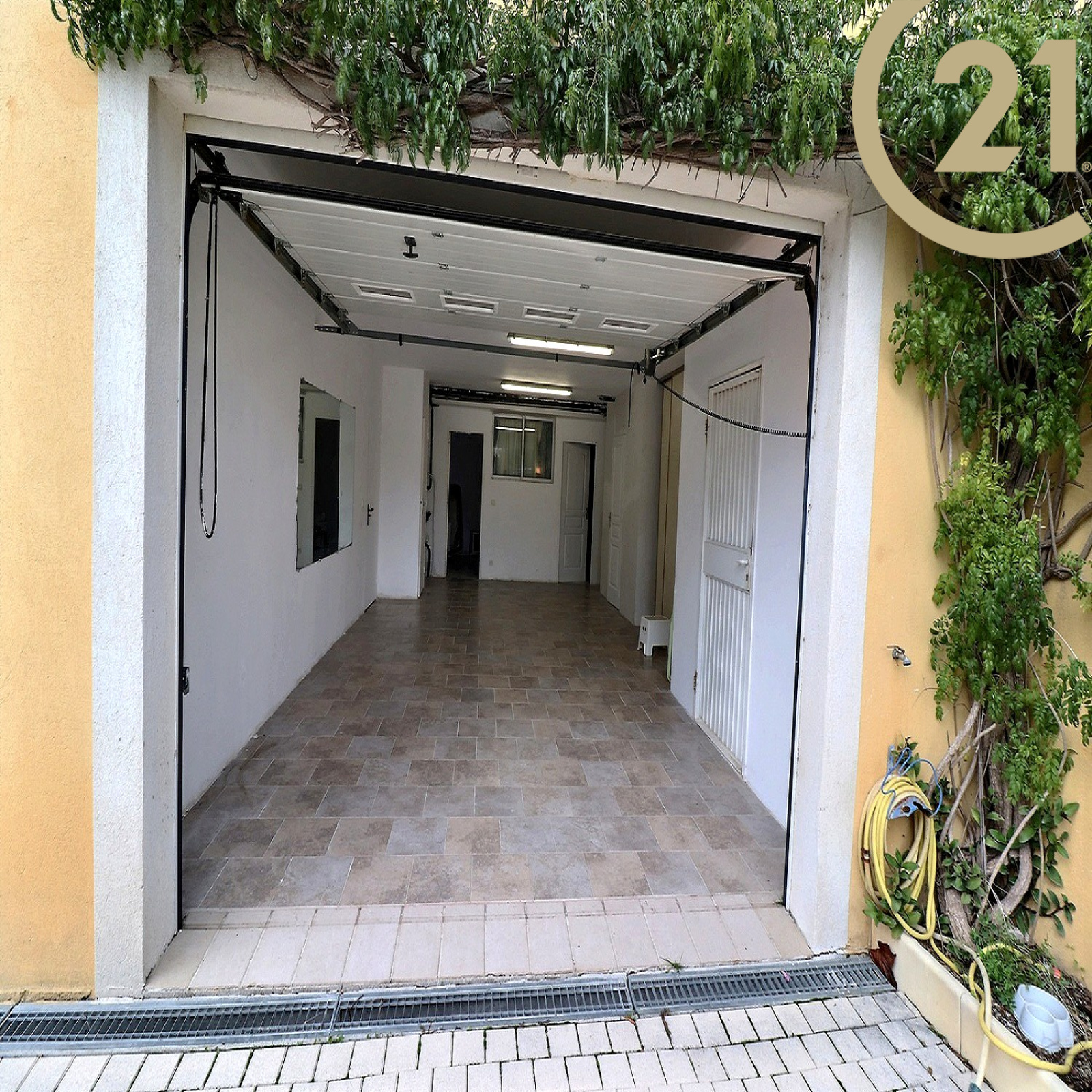 Salle de bains, garage d'environ 40 m², cour extérieure avec portail électrique, climatisation, exposition sud.
