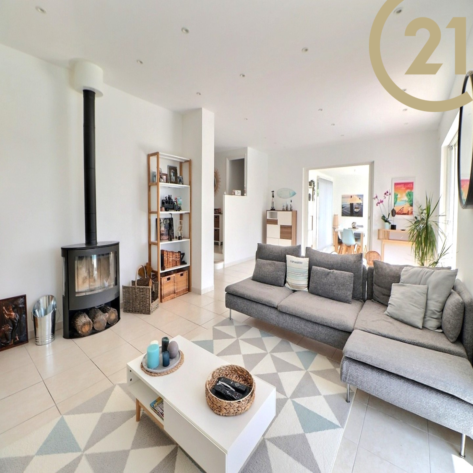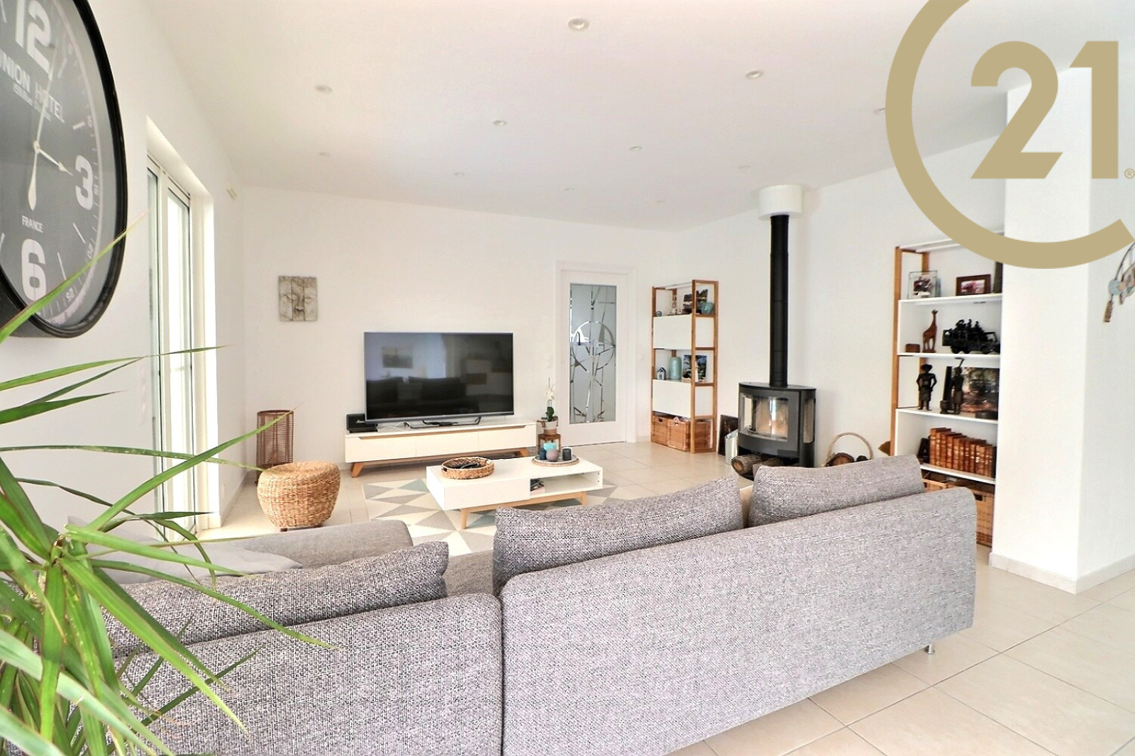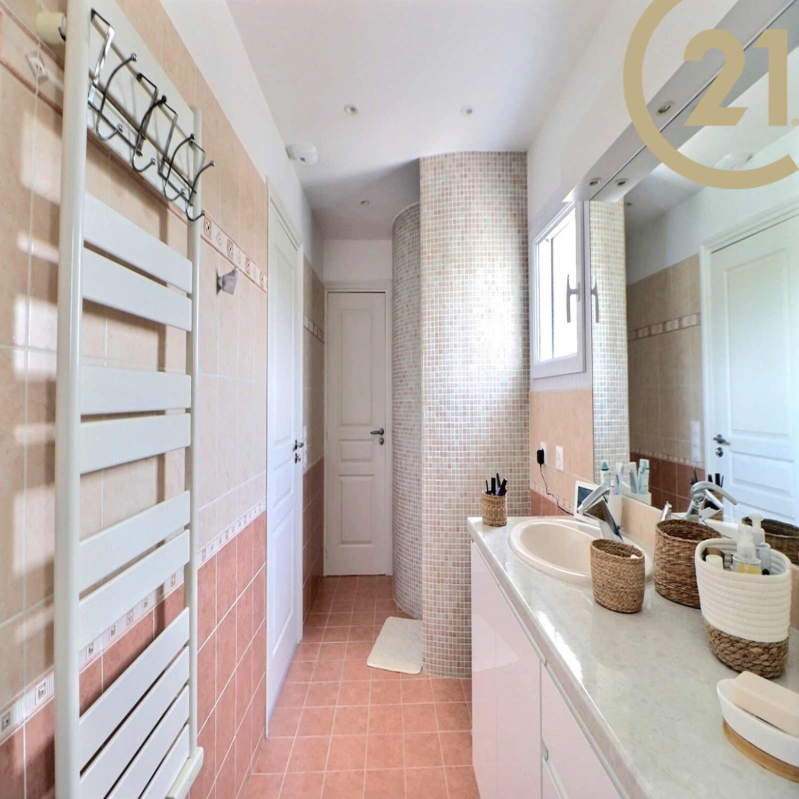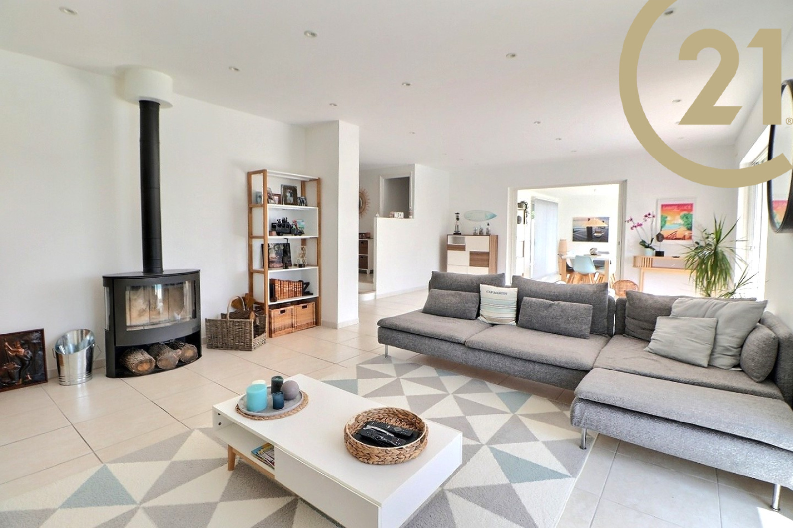 Elle se compose au rez-de-jardin, d'une entrée avec placard, d'une pièce de vie exposée plein sud de plus de 50 m² avec poêle à bois panoramique donnant sur une très belle terrasse dont une partie couverte et un jardin paysager avec piscine d'eau douce d'une surface de 11x5m, d'une buanderie, d'une cuisine aménagée et équipée datant de 2021, avec plaque de cuisson au gaz (facilement remplaçable par de l'induction), d'une arrière cuisine, de trois suites parentales avec salle d'eau et de deux WC indépendants.