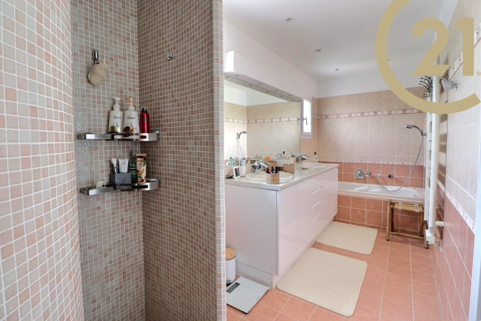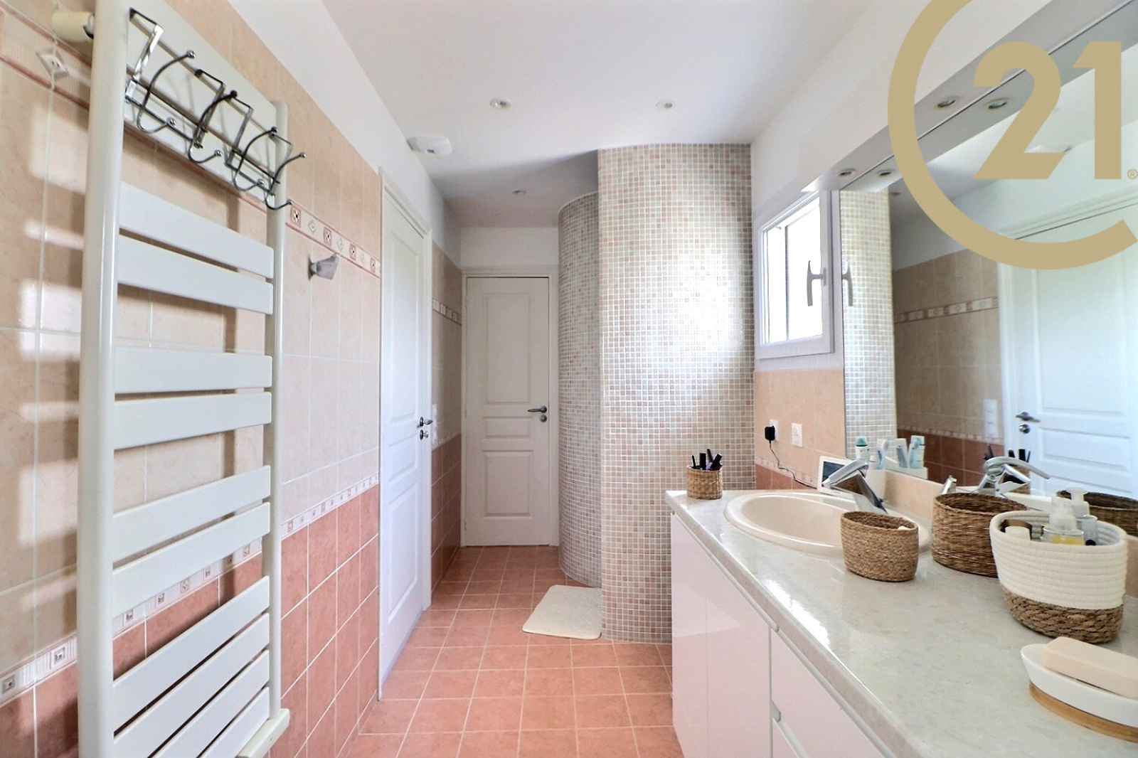 En montant quelques marches, vous accéderez à la suite parentale principale qui se compose d'une chambre, d'un dressing de plus de 7 m², d'une pièce d'eau avec douche et baignoire balnéo et de WC indépendants.